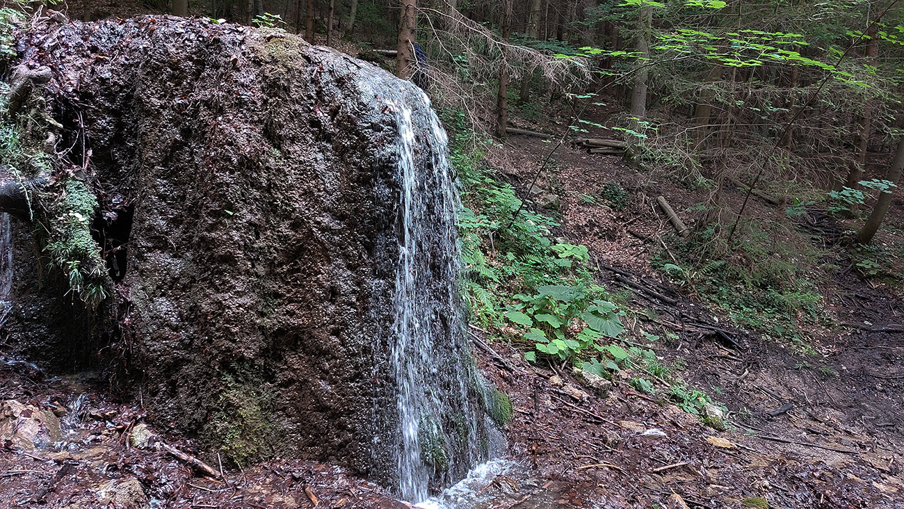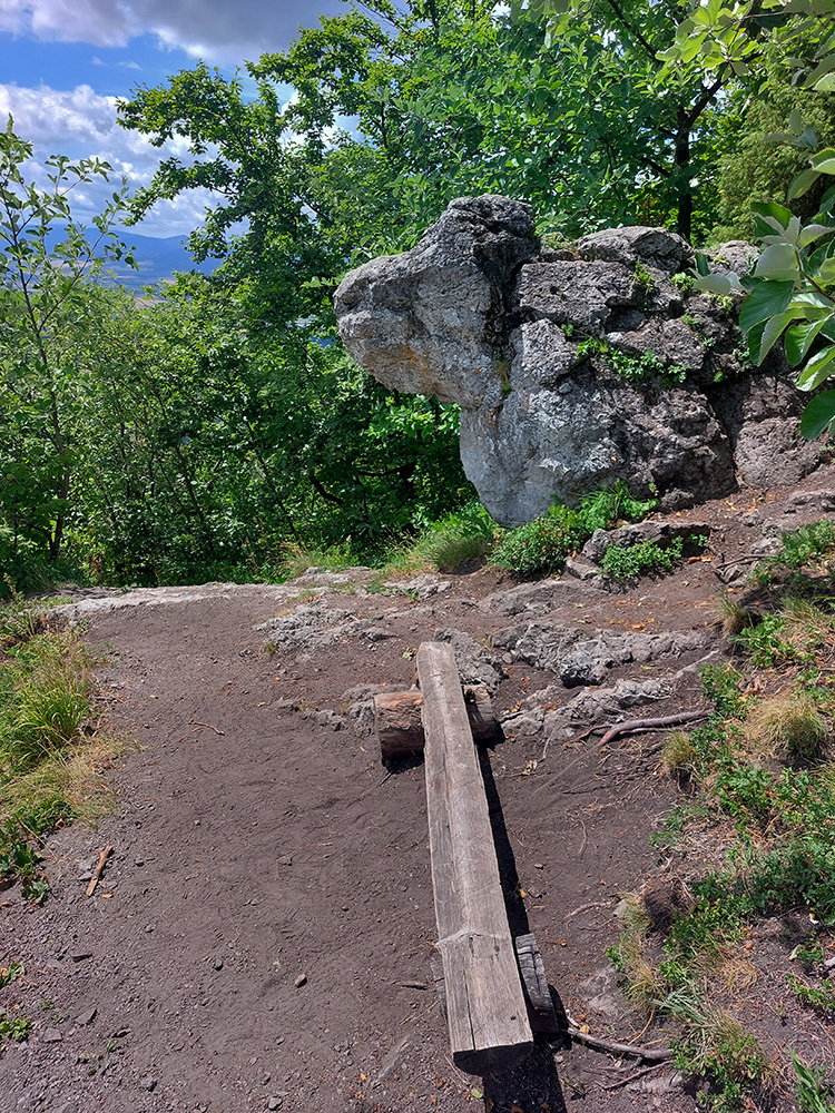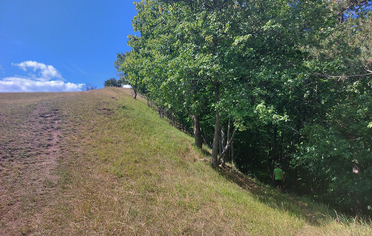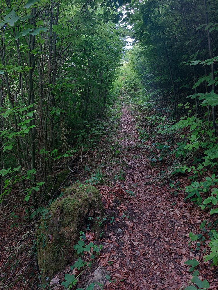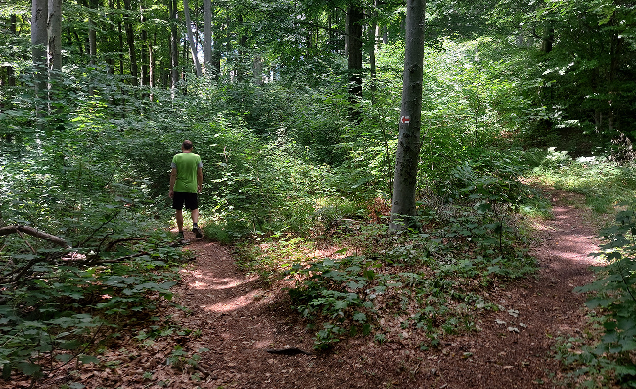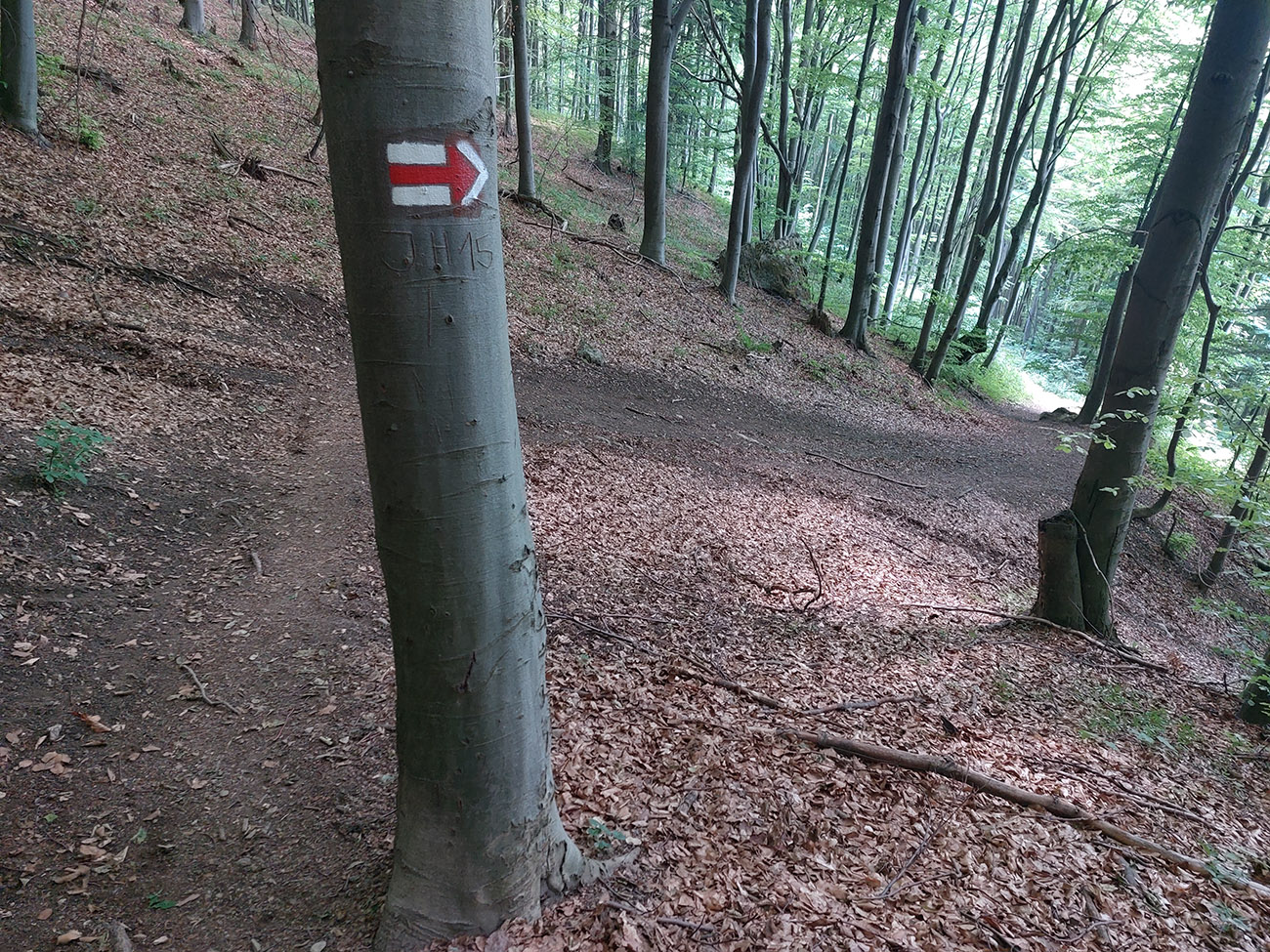 No a posledná časť okruhu je definitívne dole kopcom. Hneď nad hradom rozhranie lesa a lúky zvádza síce k výstupu hore na horizont, ale oranžové štvorčeky a výrazné šípky na strome navigujú doprava, do diery v zelenej hradbe, kade začína príjemný, aj keď úzky, traverzový chodník „Popod lipy“ nazad dole ku minerálke. Miestami je dokonca vylepšený reťazou na pridržanie sa a zvýšenie sebavedomia. Ale dal by sa aj na bajku.