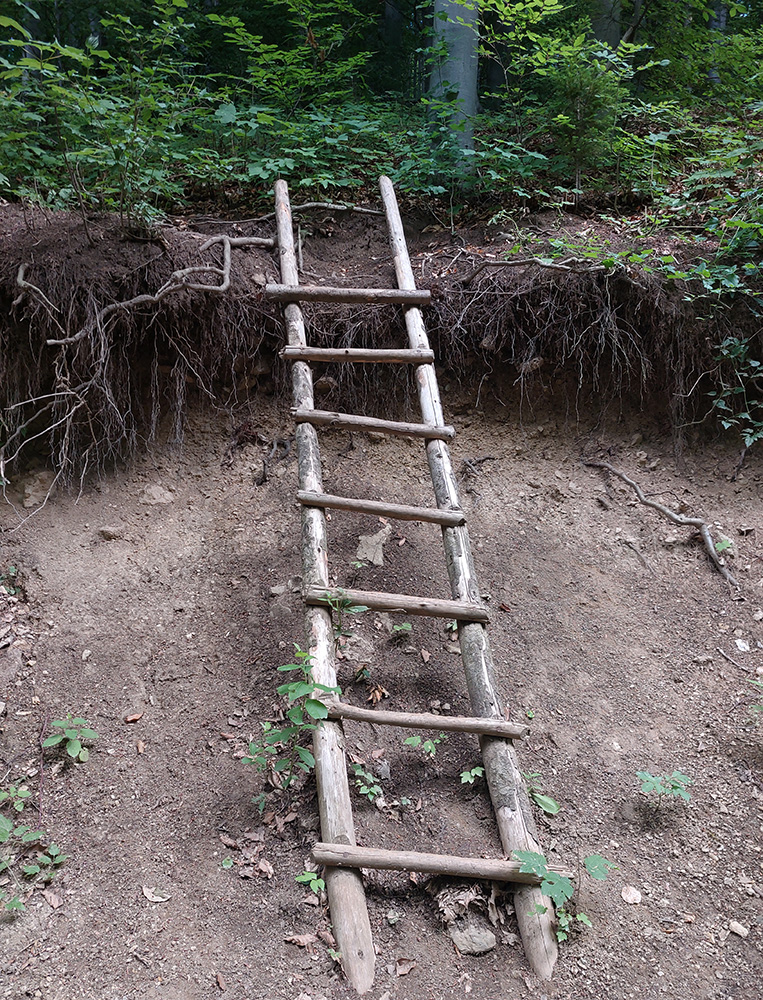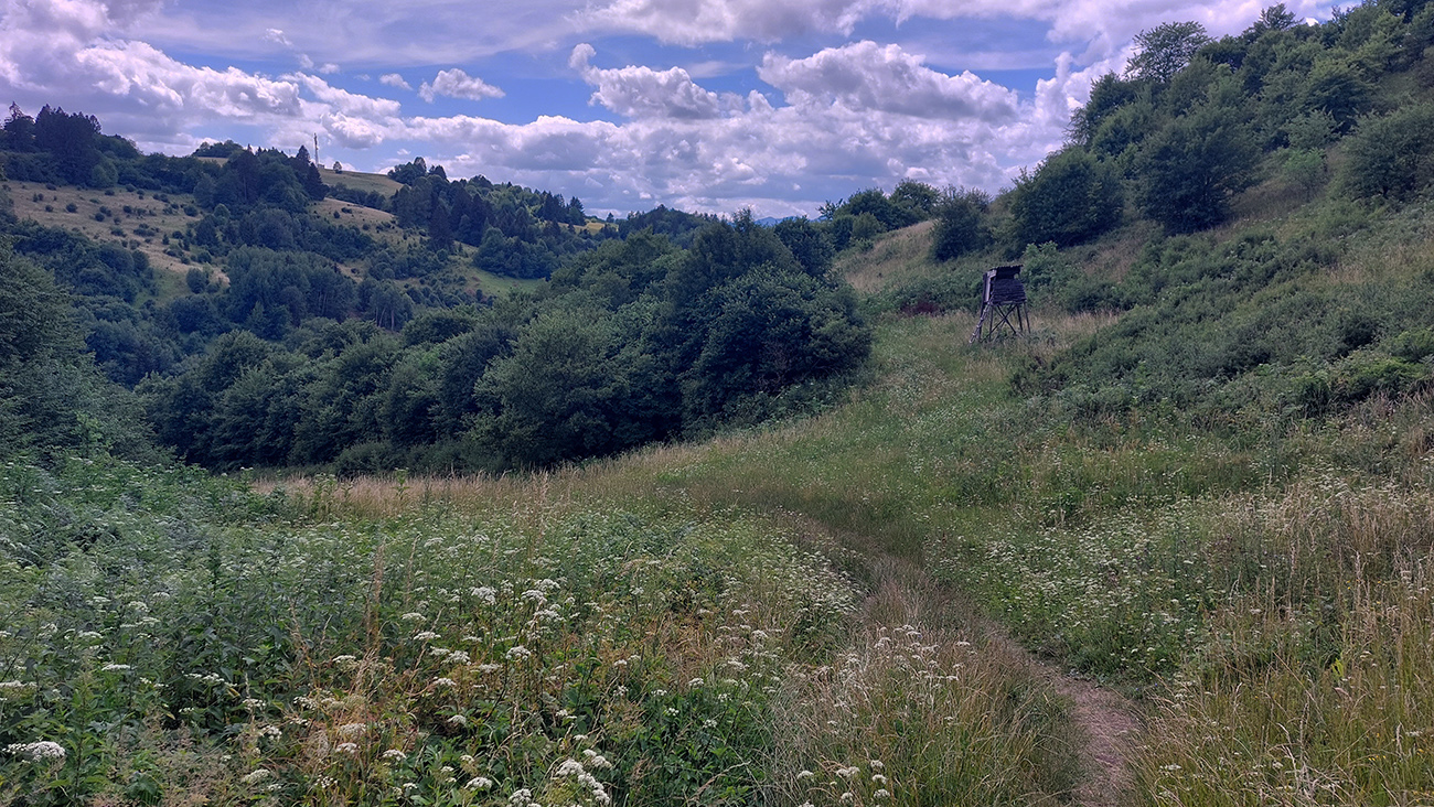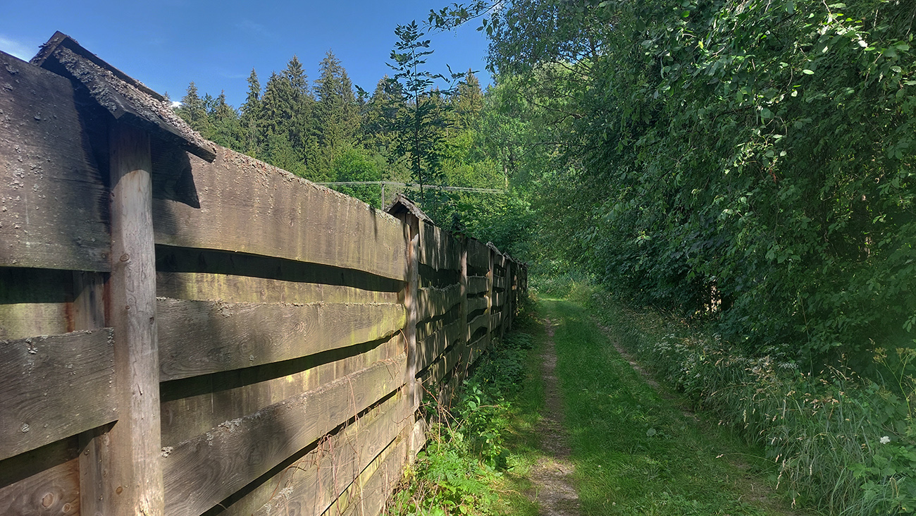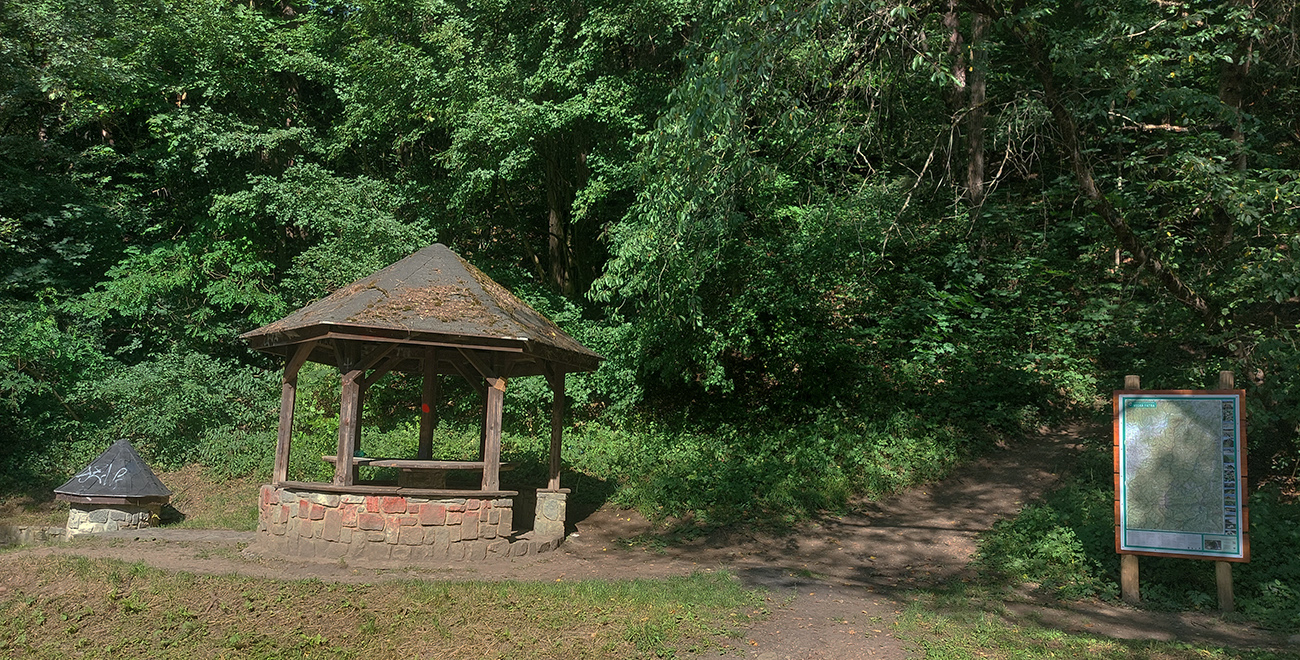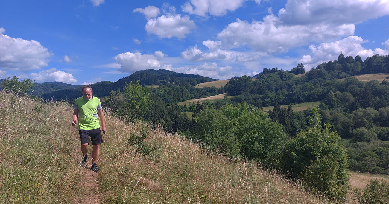 No a posledná časť okruhu je definitívne dole kopcom. Hneď nad hradom rozhranie lesa a lúky zvádza síce k výstupu hore na horizont, ale oranžové štvorčeky a výrazné šípky na strome navigujú doprava, do diery v zelenej hradbe, kade začína príjemný, aj keď úzky, traverzový chodník „Popod lipy“ nazad dole ku minerálke. Miestami je dokonca vylepšený reťazou na pridržanie sa a zvýšenie sebavedomia. Ale dal by sa aj na bajku.