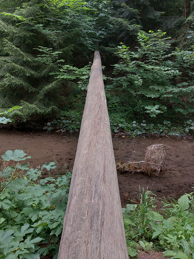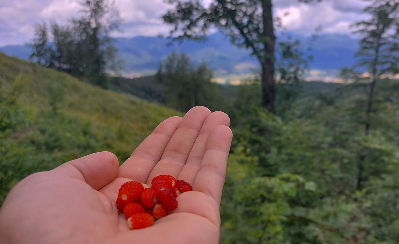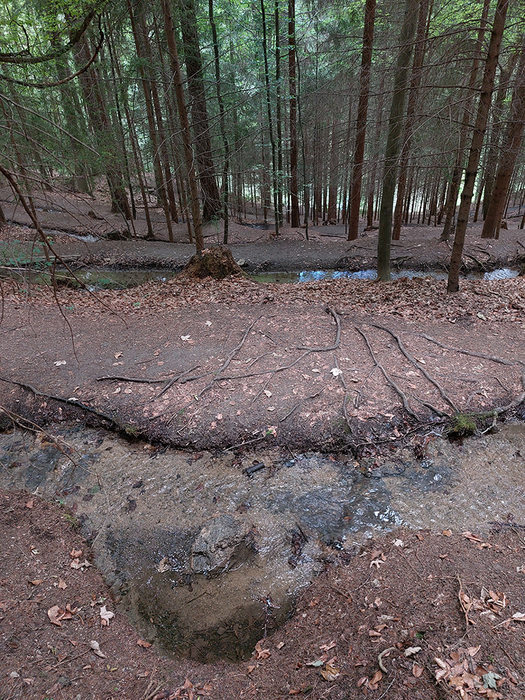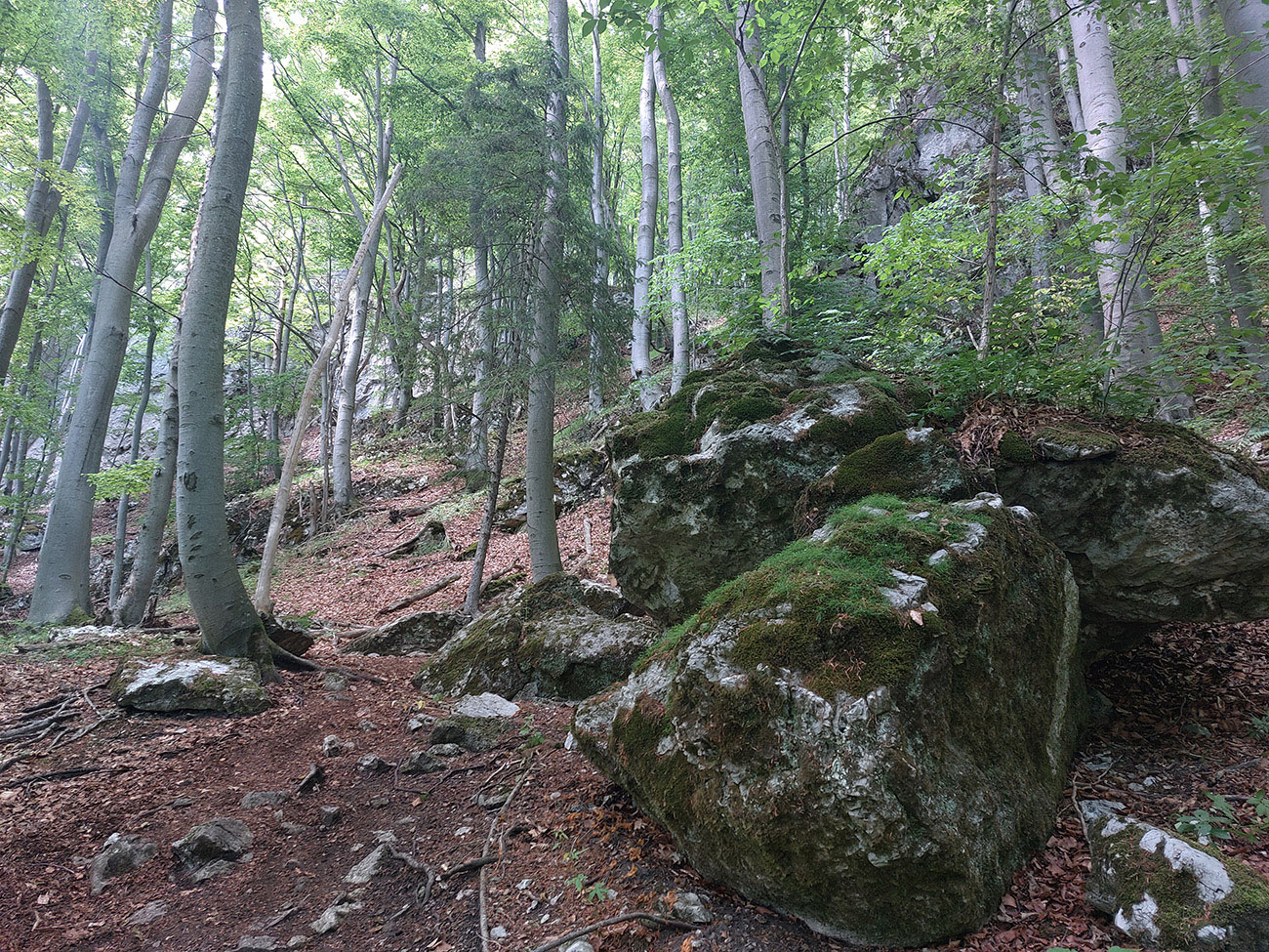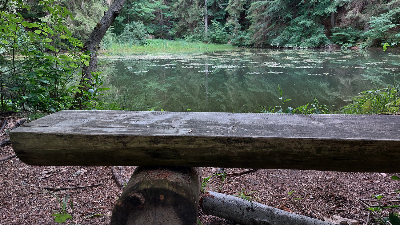 No a posledná časť okruhu je definitívne dole kopcom. Hneď nad hradom rozhranie lesa a lúky zvádza síce k výstupu hore na horizont, ale oranžové štvorčeky a výrazné šípky na strome navigujú doprava, do diery v zelenej hradbe, kade začína príjemný, aj keď úzky, traverzový chodník „Popod lipy“ nazad dole ku minerálke. Miestami je dokonca vylepšený reťazou na pridržanie sa a zvýšenie sebavedomia. Ale dal by sa aj na bajku.
