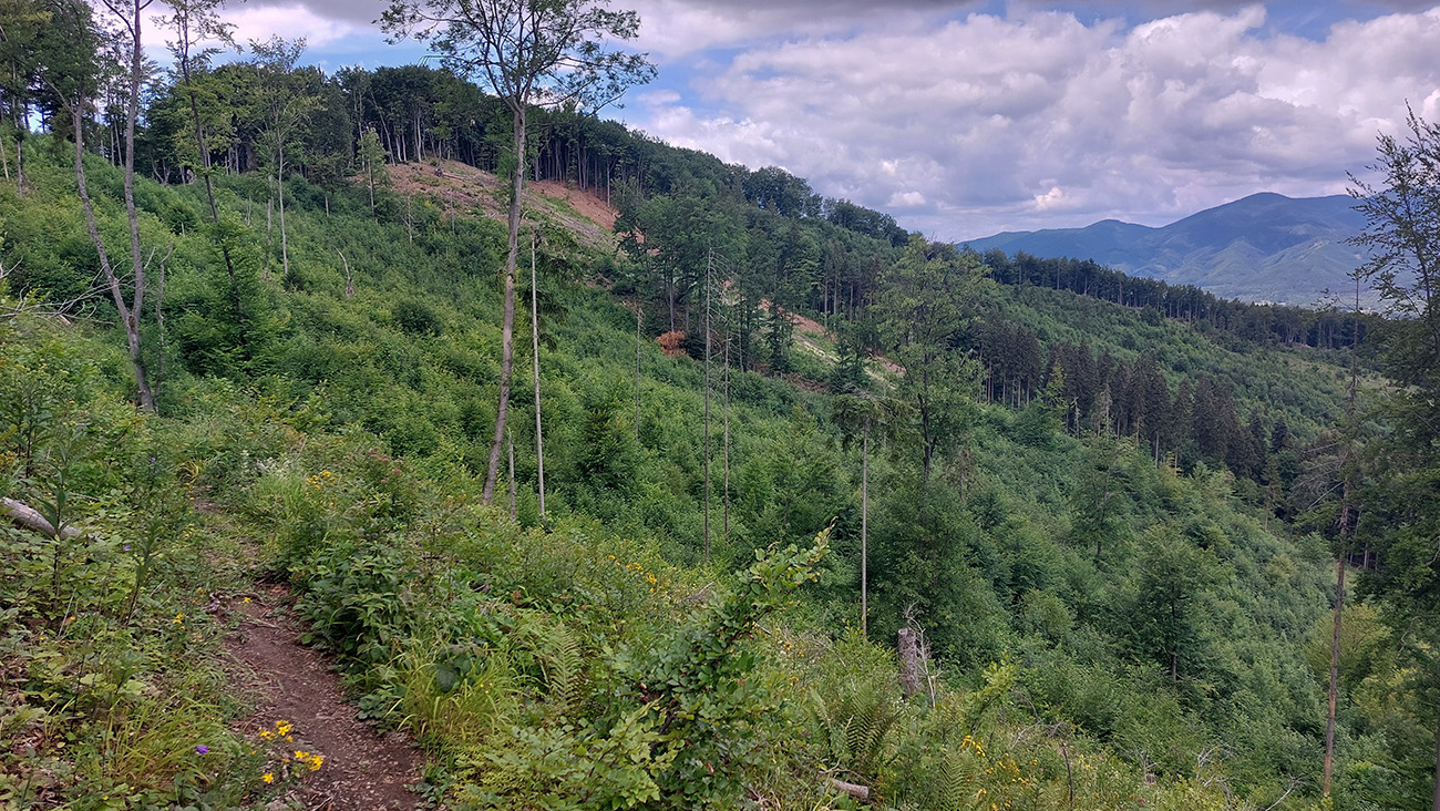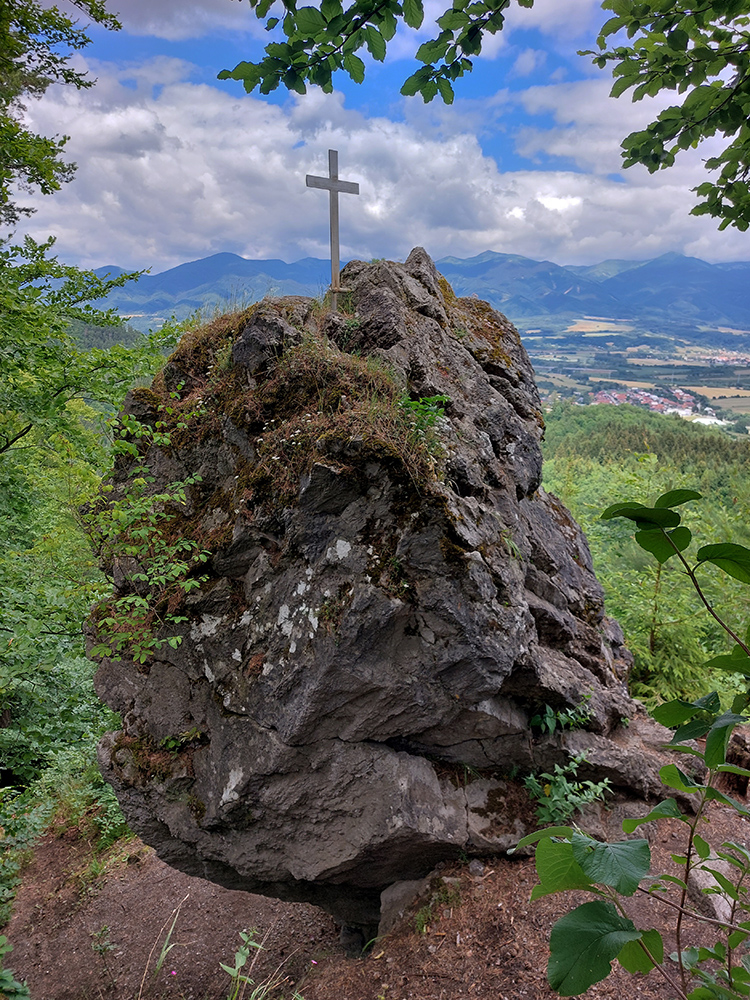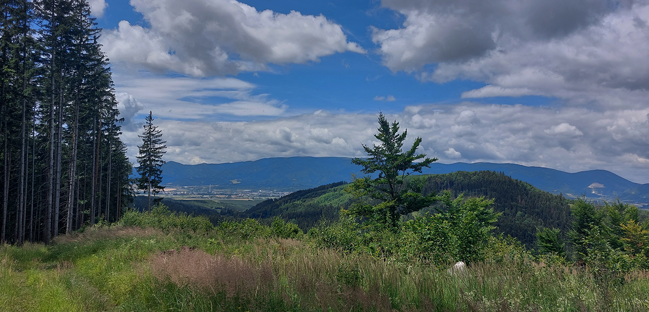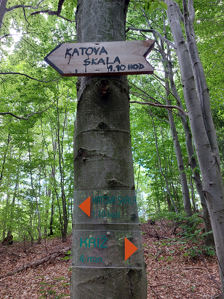 Chodník - singlík smerom na Katovu skalu by bol pekný, keby z väčšej časti neviedol krížom cez rúbaniská z ostatných rokov. Niekde sa už nový les dvíha, niekde je to čerstvo po ťažbe, ale aspoň pár výhľadov ku Krivánskej Fatre a k Martinu sa ponúka. Začiatok strmší, potom mierne stúpanie v traverze. Necelá hodinka a sme tam.