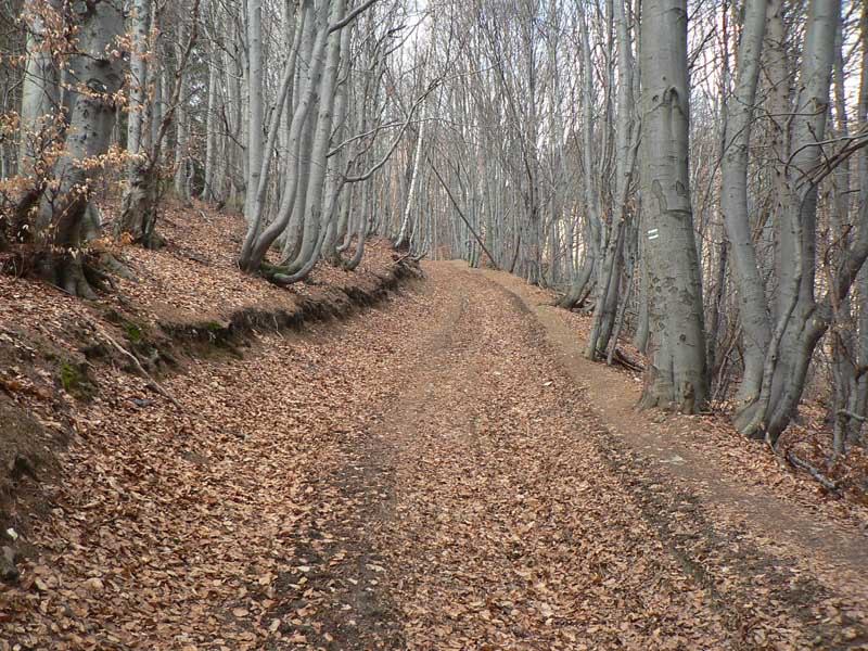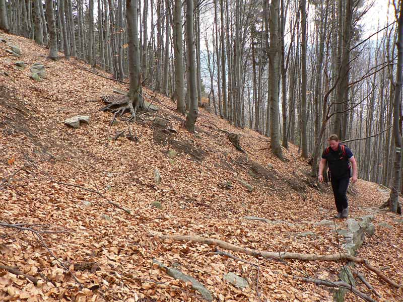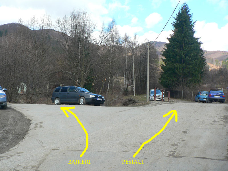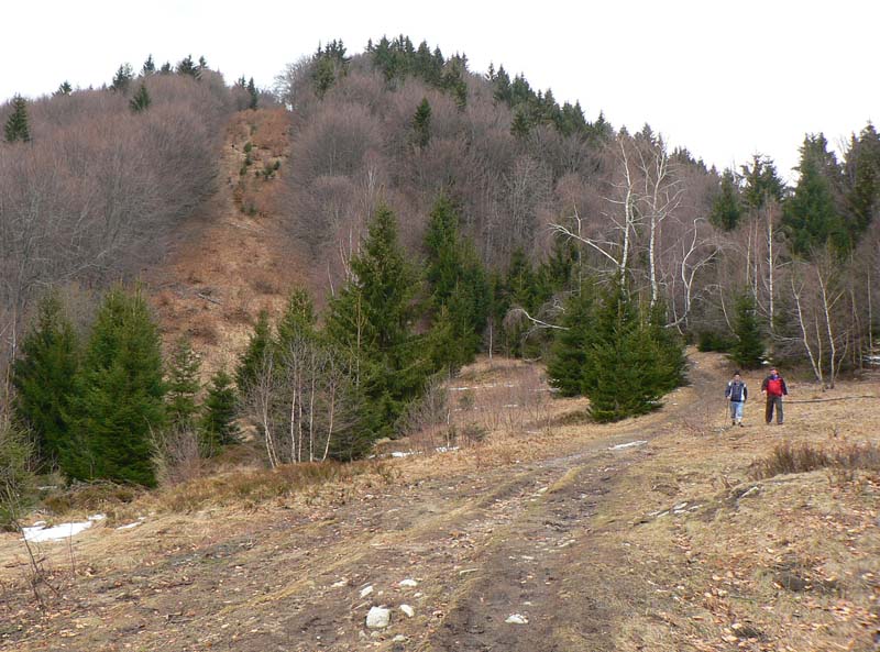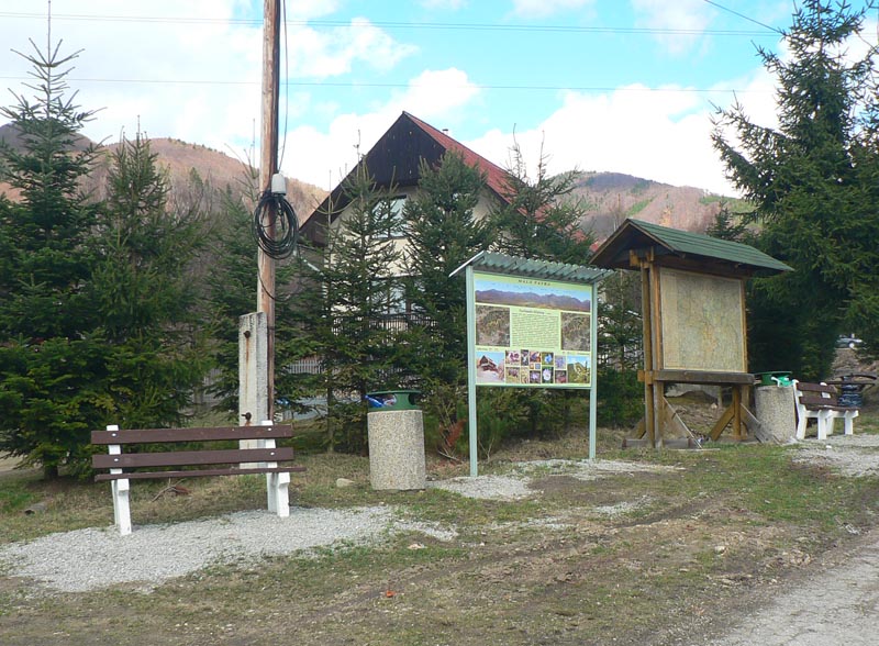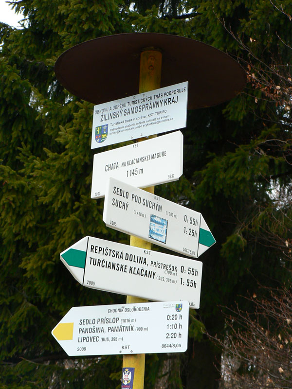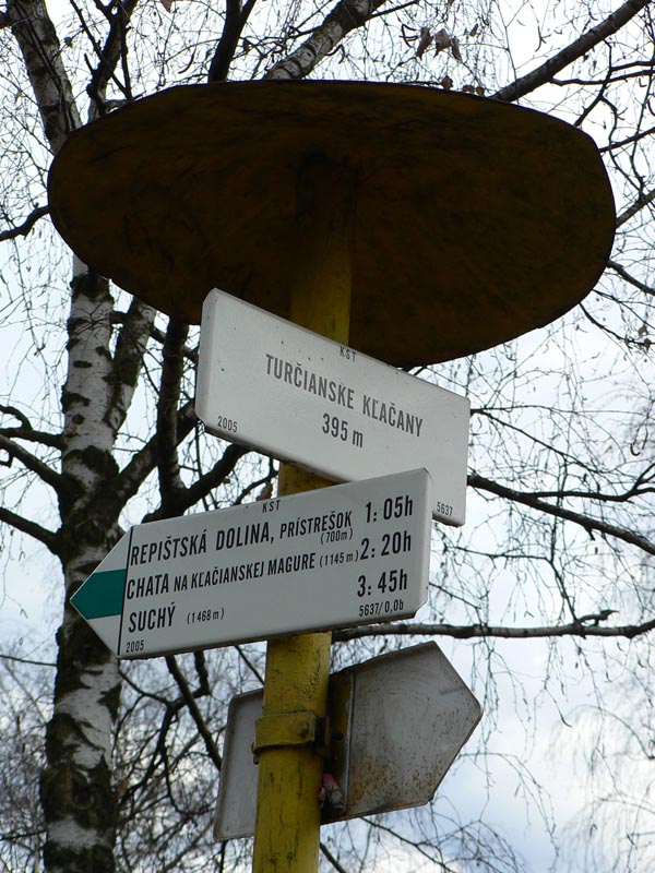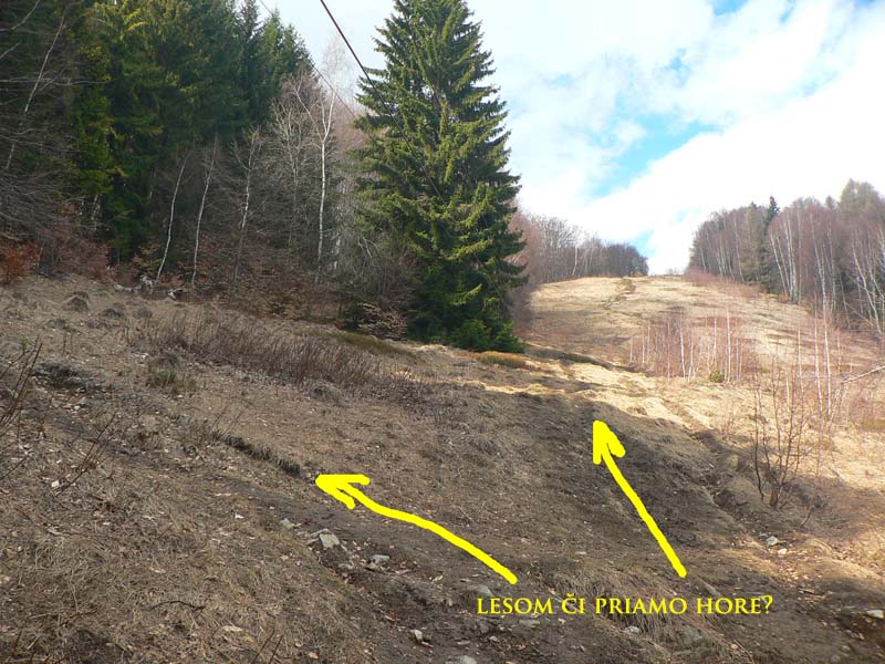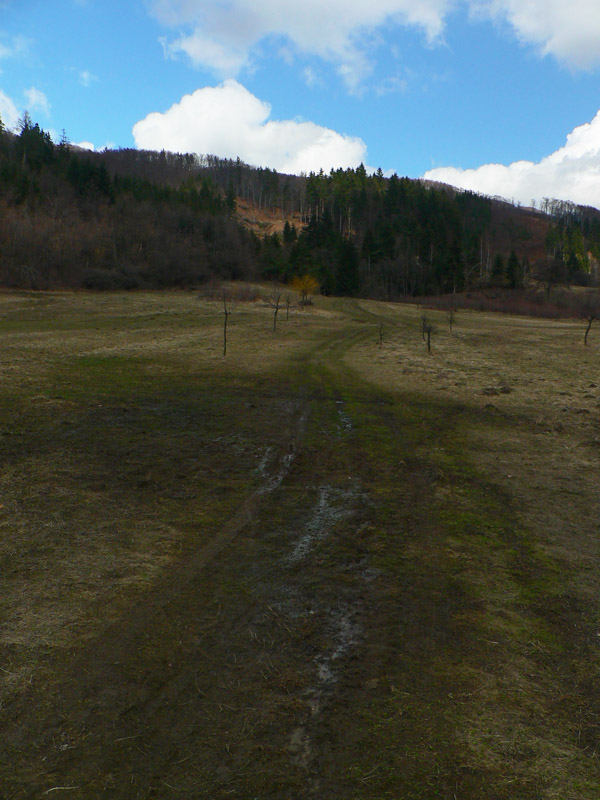 Bodaj by sem nechodili toľké davy, keď značka začína na konečnej dvadsaťsedmičky (pre tých, čo tam ešte neboli). Podľa tabule 2:20, ale flákavou chôdzou aj s fotením som hore na chate za hodinku a pol. Komu sa to zdá rýchle, pozor! Víťaz behu do vrchu to zvykne dať pod 30 minút a traťový rekord Mira Vanka je 24:09 (4km, 720m prevýšenia), aj keď z mostíka na hornom konci dediny. Otočka autobusu je o kilák ďalej a o 30m nižšie na spodnom konci. Ale neznalý nemá šancu zablúdiť – od zastávky po zelenej „direkt“ hore. Vyrážam aj ja – krížom cez dedinu ma sprevádza miestny rozhlas („...jesééň už hľadííí do dverííí...“) – a po pesničke oznam o vítaní jari v kulturáku :-) Na lúke pod lesom je mokro aj keď je všade sucho, v lese trochu tiež, ale po snehu ani stopy. Ráno bolo hnusne, tipujem že oproti nestretnem veľa ľudí, a veru s prvým sa míňam až po pol hodine. Že to ale bude biker, to som nečakal. Žeby sa už dalo po zvážnici až hore? Asi to zajtra skúsim.