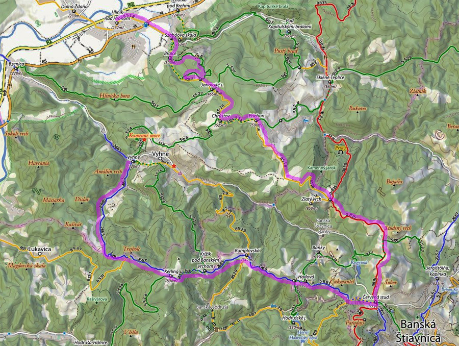 Na začiatok dlhšie, ale mierne stúpanie z Vyhní od kúpaliska na Kerling (Banský vrch), prevažne lesom. Potom už ale viac lúk, hojdavé hore a dolu po pevných lesných a lúčnych cestách, komfortne zjazdných aj na hardtaile. Bohaté výhľady, mierne sklony. Modrá značka, ktorá ma viedla, je časťou Chodníka Andreja Kmeťa. V polovici trochu asfaltu okolo sedla Červená studňa, prechod na červenú a hybaj nazad po druhej strane doliny, zas väčšinou po lúkach. Nad Bartkovým majerom zmena farby – odtiaľ až do Hliníka nad Hronom idem prakticky po žltej. Len pred koncom, na Janovej lúke, sa oplatí na chvíľu ju opustiť a spraviť si zachádzku po zelenej cez Kečku a Bralce. Je to príjemná zmena po celodennom dupaní po cestách, lebo jedine tu je iba lesný chodník. Vedie cez prírodnú rezerváciu.