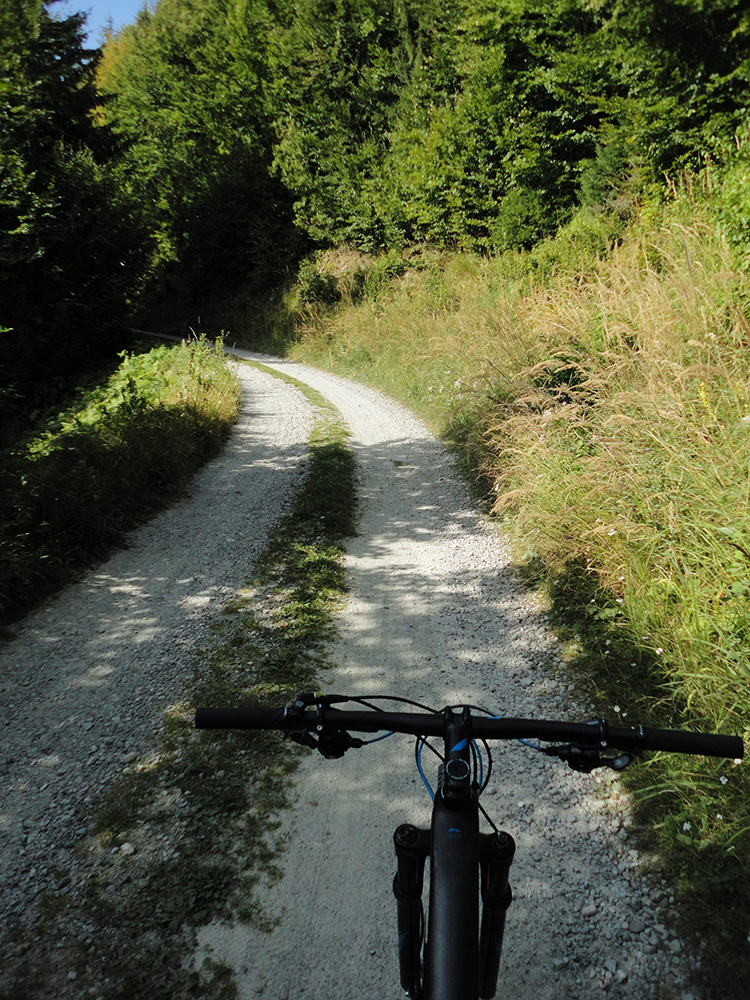 Ďalšia úloha je trafiť na rázcestie Drgová a tam preťať modrú značku (zo Sučian na Malý Kriváň). Najskôr jemne líznem podhorské lúky nad Trusalovou, stúpam zase po asfaltke. Pred jej koncom výrazná odbočka doľava do lesa. Spočiatku je lesná cesta široká, ale staršia, takže pekná, potom pribudnú rúbaniská. Ale aj výhľady dole do podhoria, napríklad na vojenskú strelnicu nad Sučanmi. Asi dve tretiny výšľap a posledná zjazd. Len pred koncom výšľapu sa treba poriadnejšie priprieť (strmo je tam a rozbito) - asi pol kilometra, ale jazditeľné všetko.