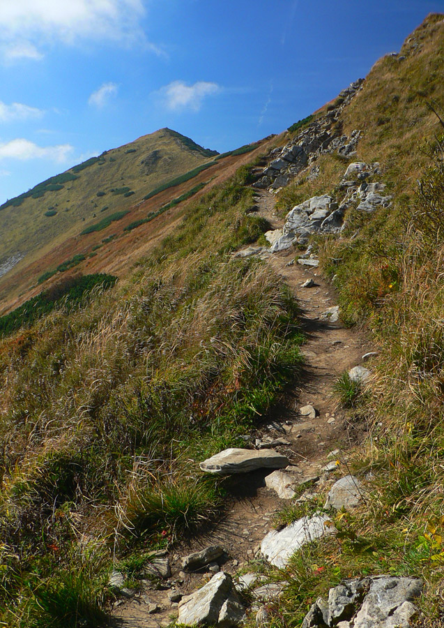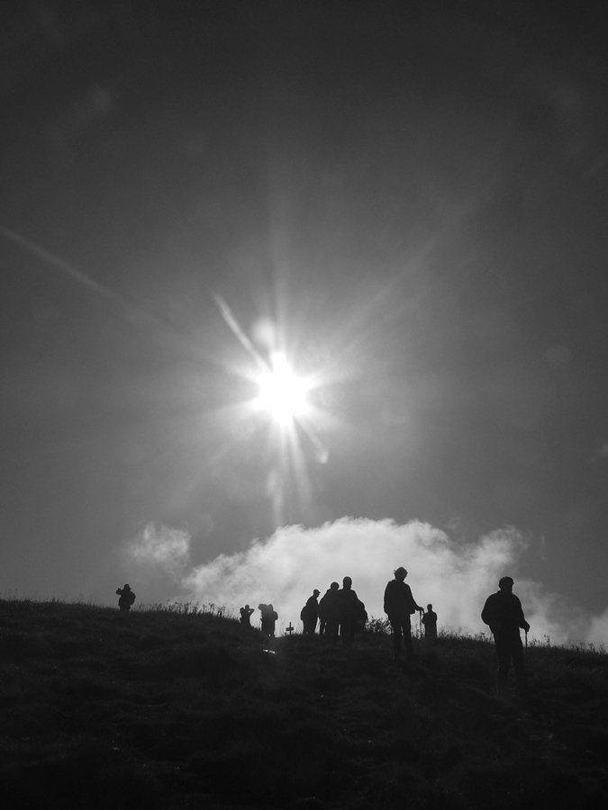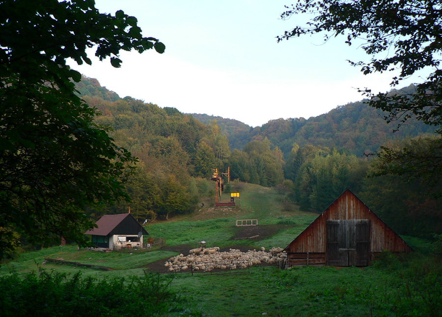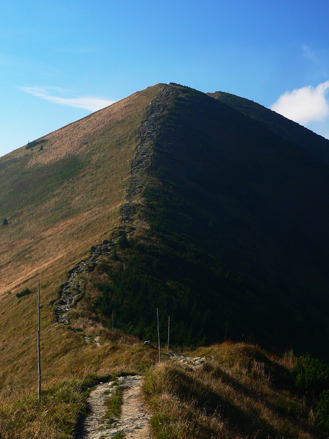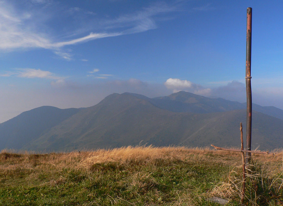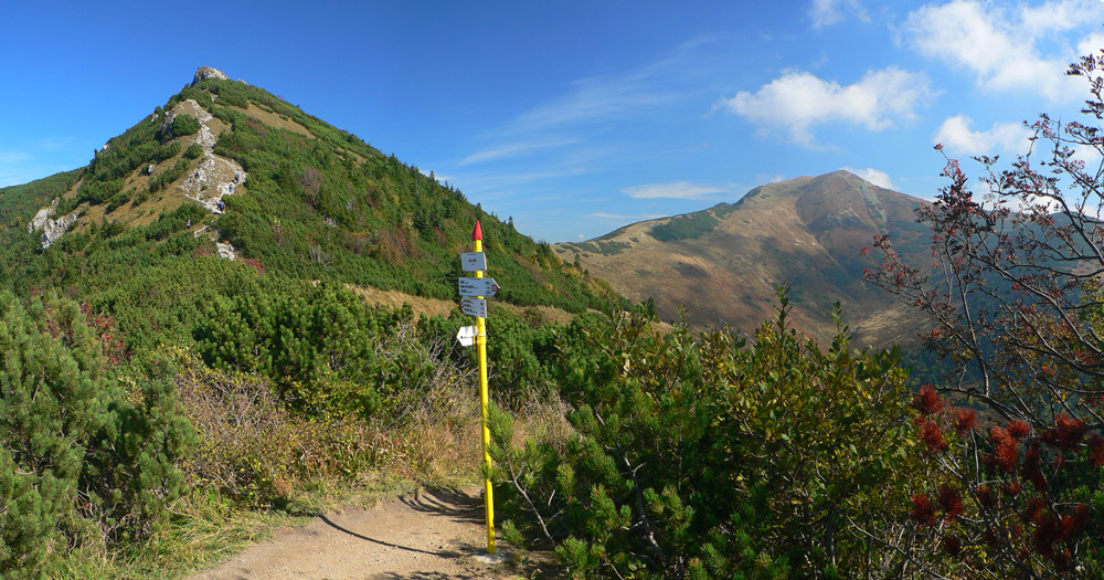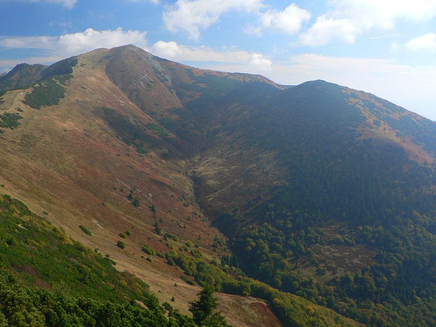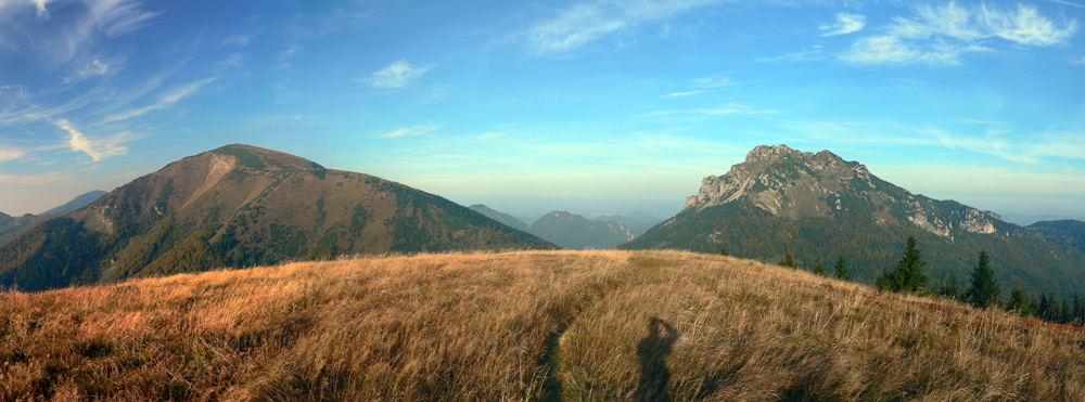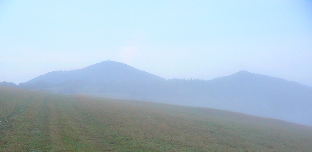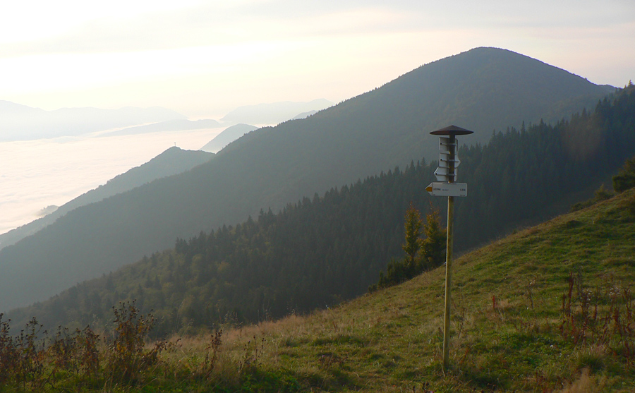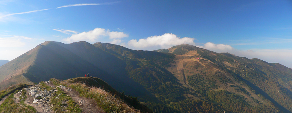 Prvý október, sobota baboletná. Teplo aj na hrebeni, ale okrem pavučín v ľufte aj modré nebo je opavúčené v predzvesti blížiaceho sa frontu. V dolinách hmla. Na fotky – kalendárovky to nie je, na prechádzku ideál.Takže ešte za tmy a kvapkajúcej hmly sa predieram lieskovým tunelom z Párnice na lúky. Vyššie: za chrbtom sa z hmiel derie na svet žeravá guľa, hneď povedľa Choča, nohy mám orosené. Bača pod Magurkou z maringotky kuká, kto tak skoro zdola ide: ľen abi ťa medveď nechitiu!