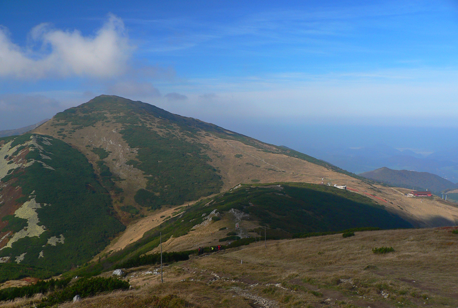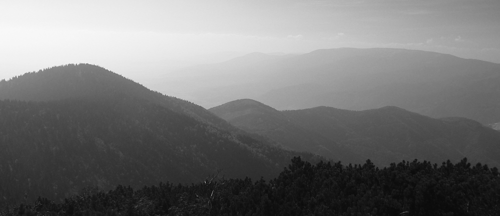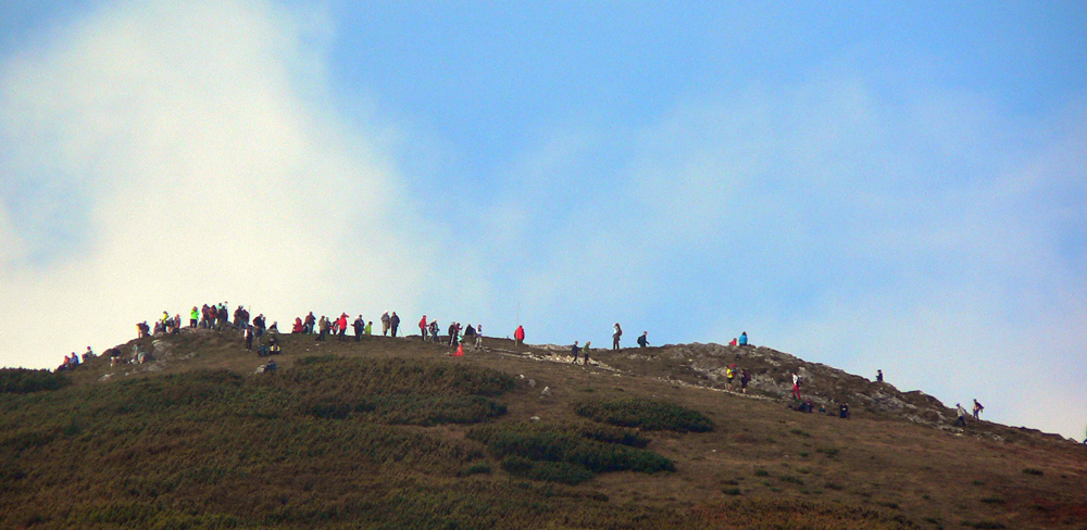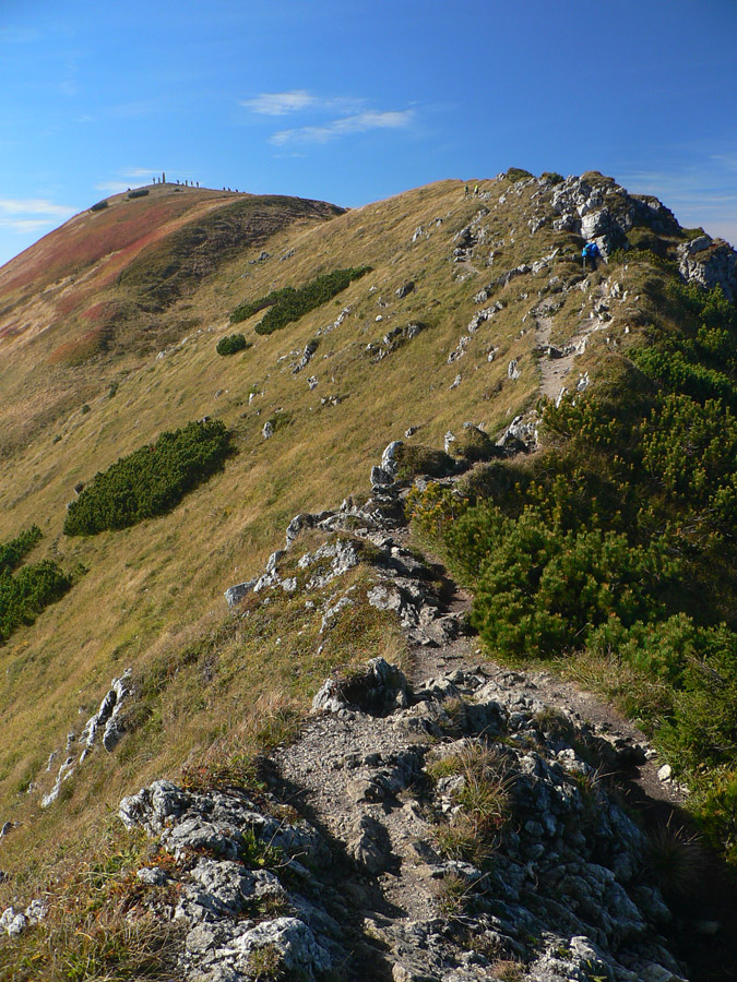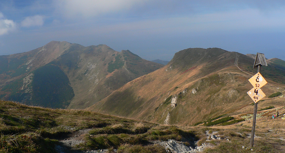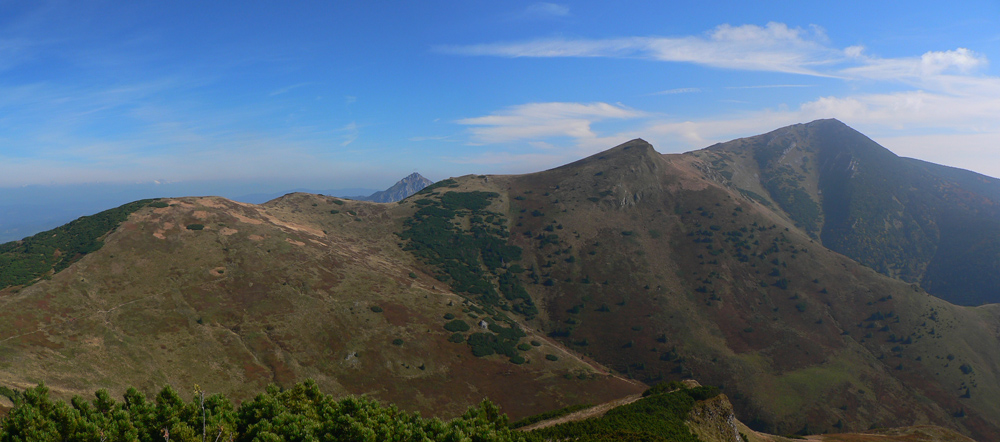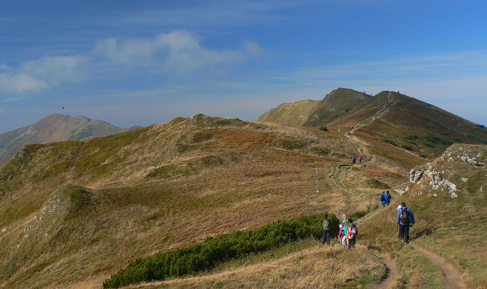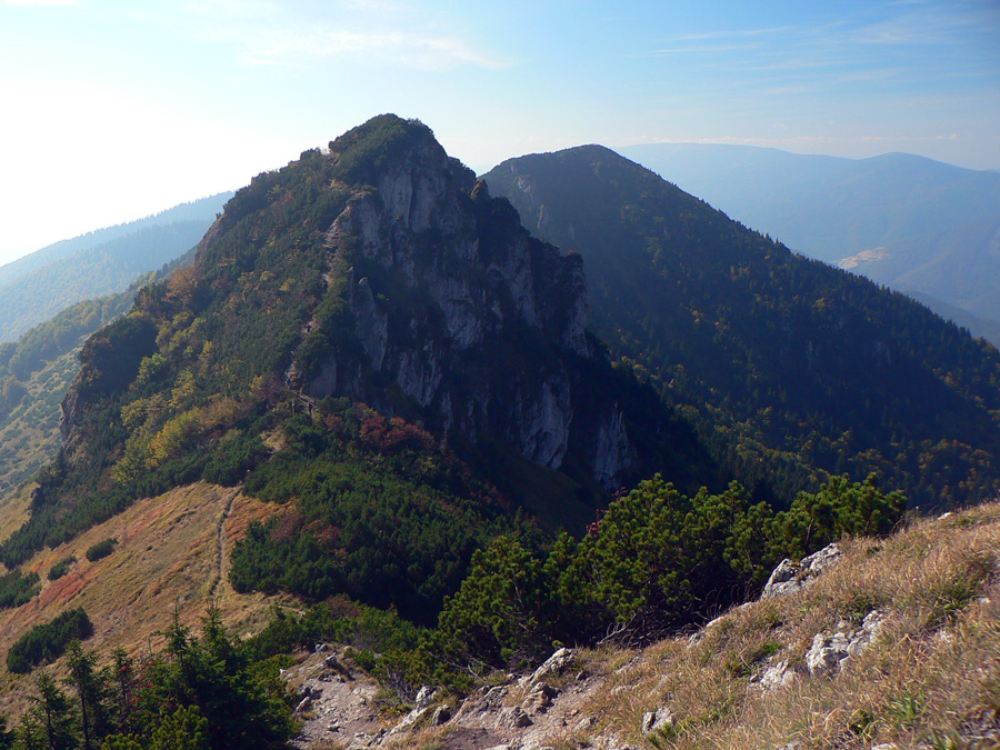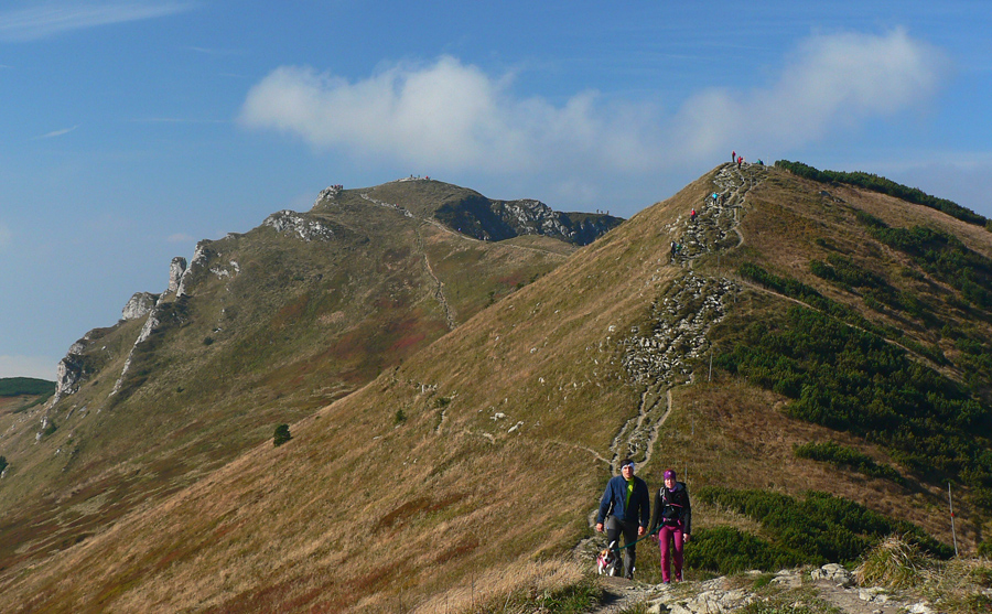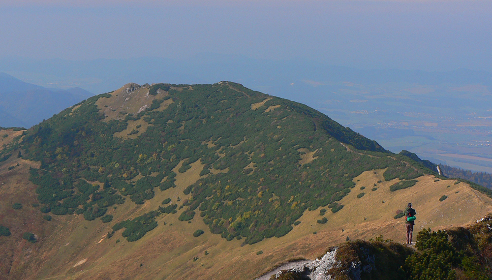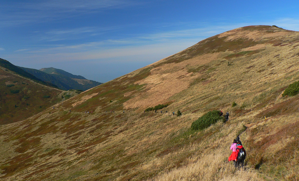 Ďaleké obzory sú zakalené, bližšie pastelové, jeseň už naplno maľuje. Hromové a Chleb = mravenisko, Snilovské sedlo = megamravenisko, na Kriváň by som sa nepretlačil. Z jeho hrany cesta ďalej ešte horšia, nik nejde v protismere, všetci zavadzajú.