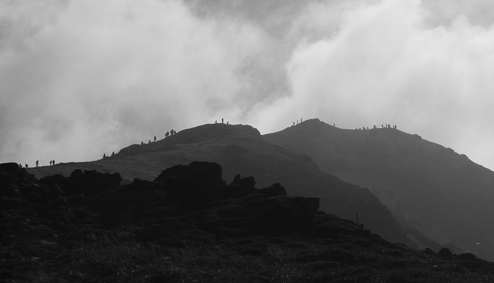 Za Bublenom už pokojnejšie, len v traverze hadí rad. Dovolíte, s dovolením, prepáčte, ďakujem. Pramienok nesklamal, tankujem – keď neprší, aspoň kvapká, no som rád že aspoň to. Vodu som si minul. Hurá na Malý Kriváň, mám kade predbiehať, aj keď to nehrotím. Krásny hrebienok na záver a objímam obelisk. Objektívom.