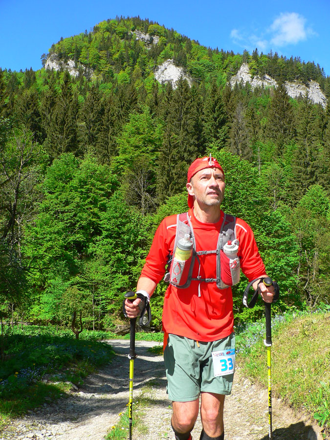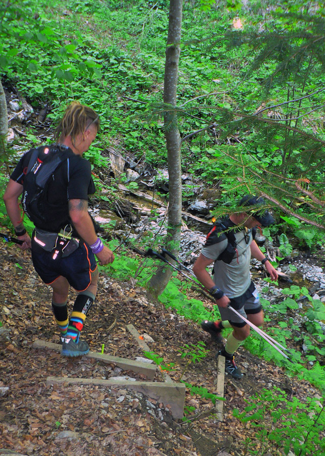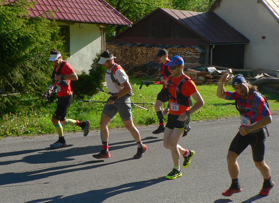 Štart ešte za ranného chládku o siedmej hore dedinou, ale zahriatie asi bolo rýchle do tej steny na Úplaz. Stade dole do Bystrickej doliny, aby sa všetci mohli vyštverať na Kráľovu studňu. Brutálny zbeh do Gadera a brutálny stupák na Ostredok. Trochu vydýchať proti vetru po hrebeni na Ploskú a dlhý zbeh po lúkach do Vyšných Revúc. Asfalt a šotolina cestou na Veľký Šturec a posledný technický úsek po hrebienku do východného Prašnického sedla. Traverzovým lesným chodníčkom do Prašnice. Odtiaľ už len po cestách. Dole do Valentovej, hore cez celé Rybô a po zvážnici, dosť nahusto vystlanej makadamom, kolísavo hore - dole do cieľa.