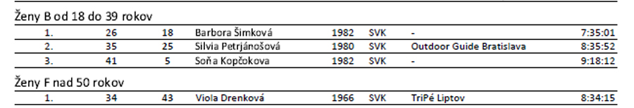 Ostatným trom dievčatám nedala šancu Barbora Šimková (za 7:35), hodinu pred Vikou Drenkovou. Tretia Silvia Petrjánošová ale Vike pred koncom doslova dýchla na chrbát - rozdiel iba dve minúty. Štvrtá Soňa Kopčoková si dobehla akurát na vyhlasovanie po cenu. Hneď ju pratali na bedňu :-) Posledný prišiel symbolicky najstarší účastník, ale zvyknutý na dlhšie štreky, takže stále vo výbornom čase, ale najmä v pohodičke.