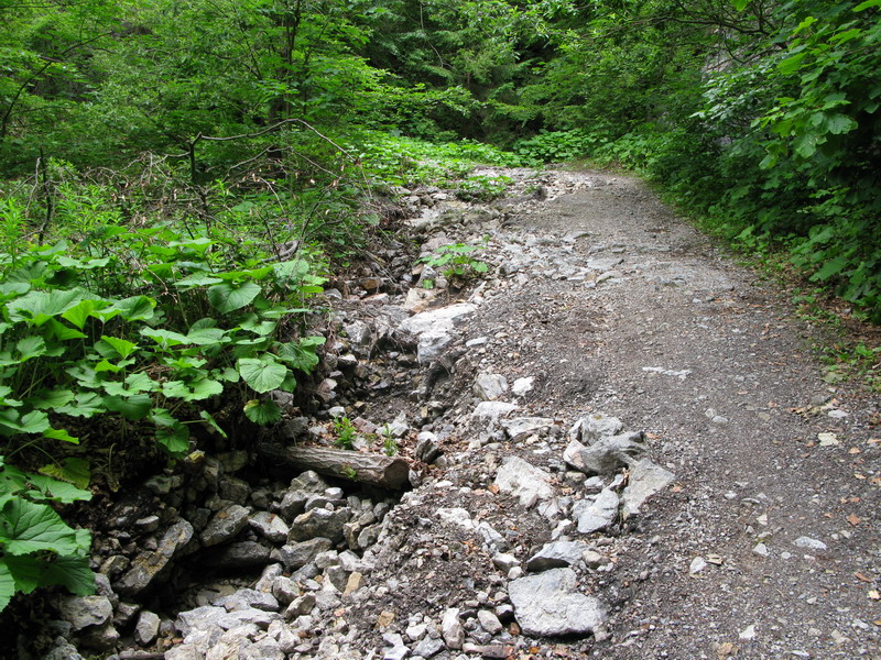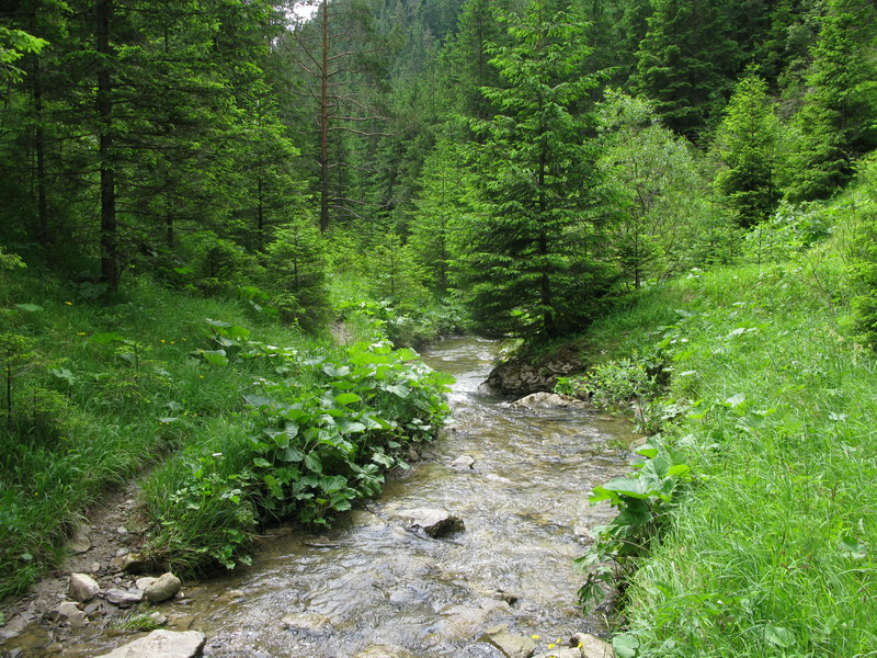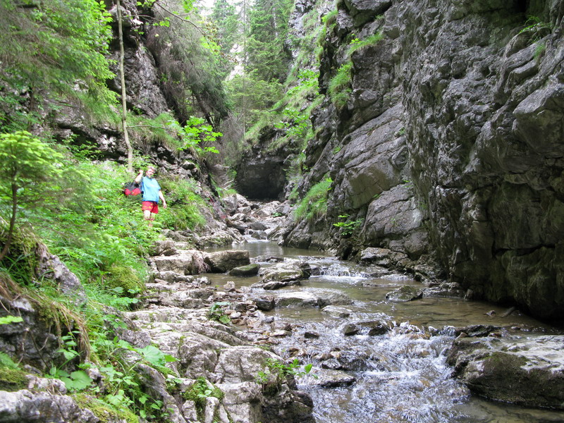 Divočina, skáčem z kameňa na kameň. Na niektorých miestach sú umelé drevené pomôcky. Niekoľko menších kaskád a vodopádikov. Roklina nie je dlhá a za chvíľu sa začne rozširovať. Preliezam stromy, ktoré zrejme polámali ťažké masy snehu. Vychádzam na lúku, tu sa chdníček stráca a ja sa až po cestu brodím vysokou trávou.