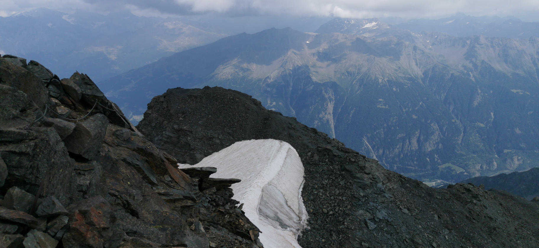 Vrchol. Teším sa, že počasie vydržalo a ja si môžem vychutnať výhľady. Nestretol som od sedla Verva nikoho. Som na kopci úplne sám. Je to veľké zadosťučinenie stáť tu, kde som si myslel, že sa nikdy nedostanem. Odbieham si ešte na predvrchol, odkiaľ urobím pekné fotky a začnem pomaly zostupovať. Dám si pozor, aby som už nezbehol z chodníka a sledujem jeho správny smer. Je to výrazne ľahšie ako ten žľab, ktorým som si to skrátil.
