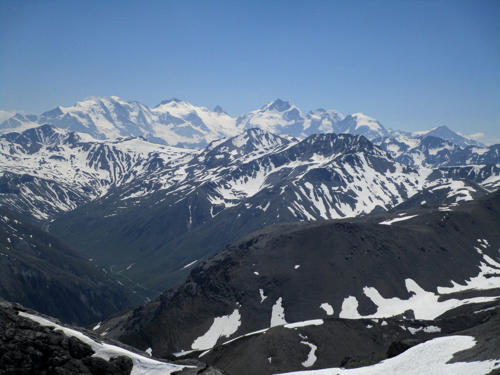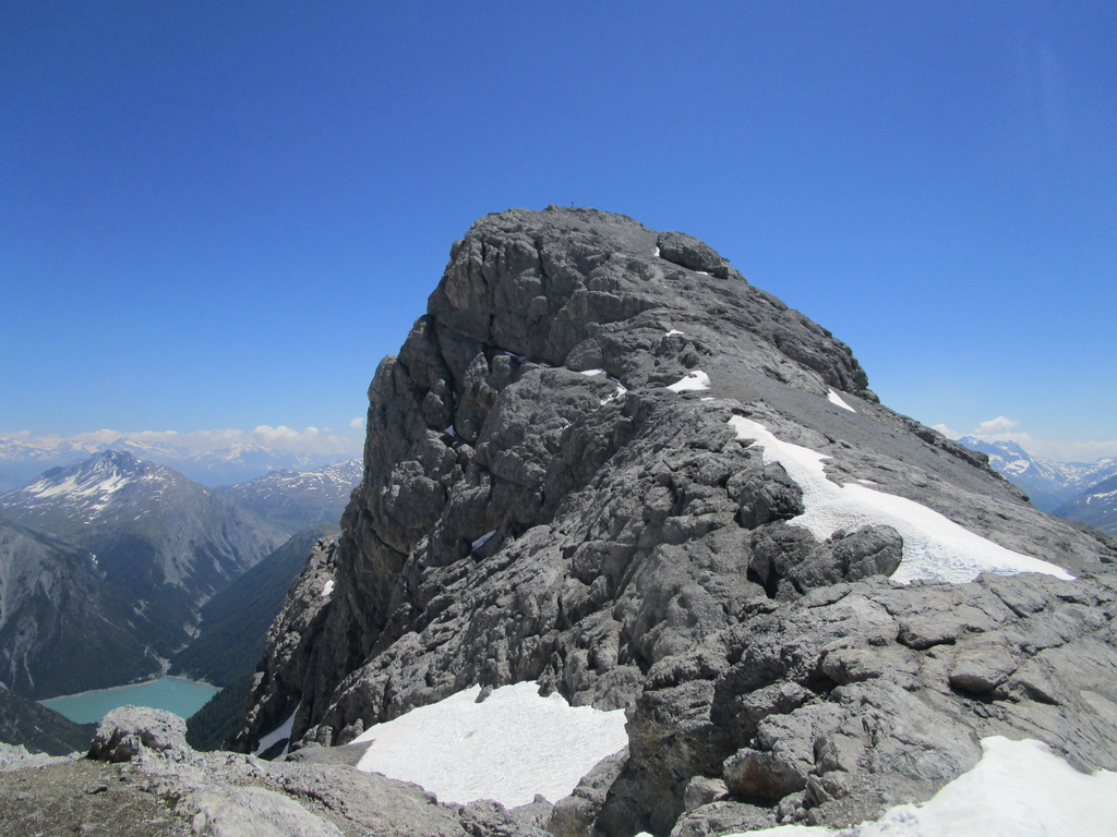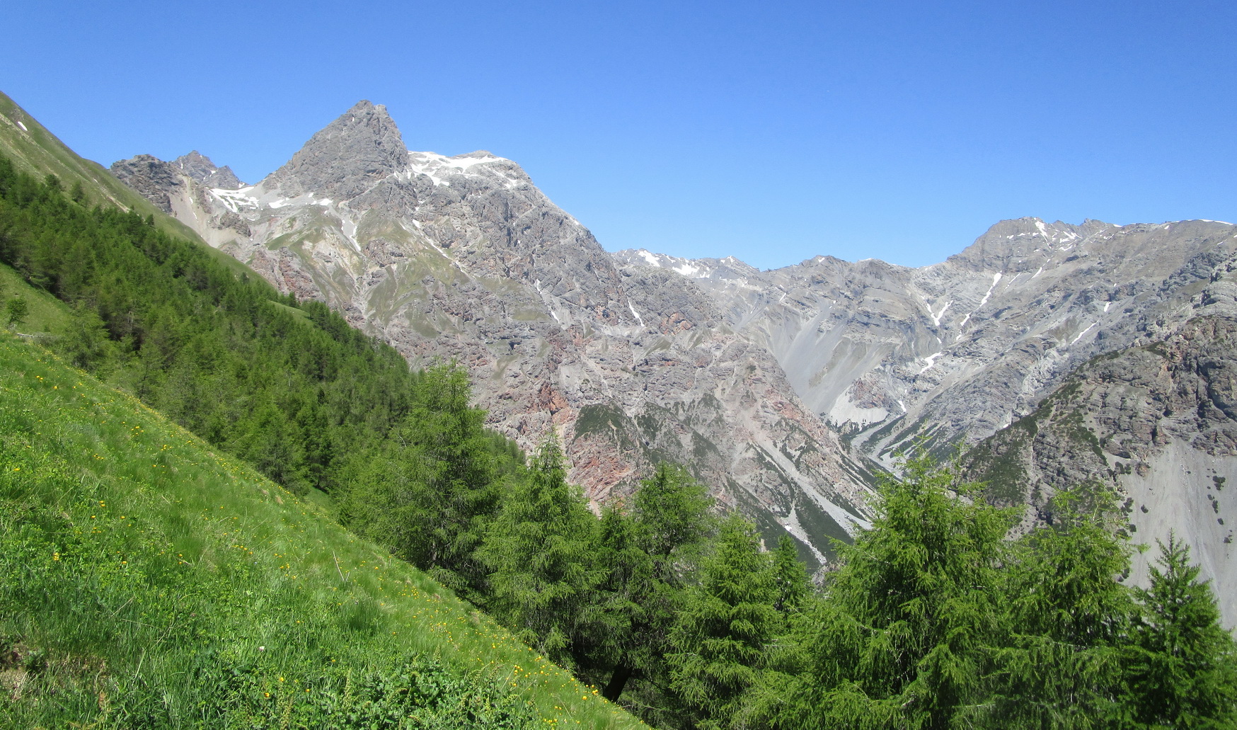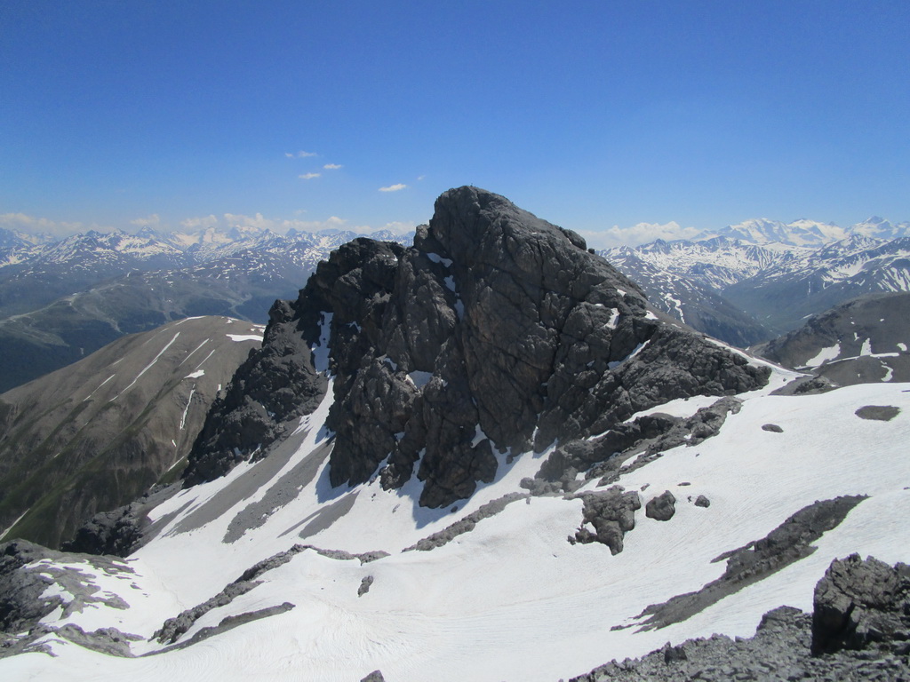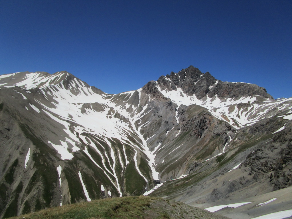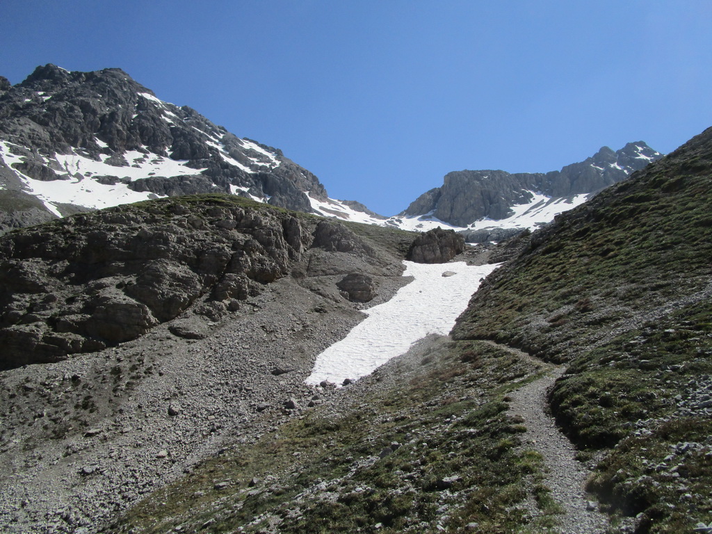 Pri zostupe si ešte pobehnem na taký vedľajší vrchol. Výhľady do novej doliny (Val dal Canton) úžasné. Podľa mapy tu vedie značka zo sedla ktoré som obišiel. pozerám dole. Všade ešte kopec snehu. Nevadí šak to pôjde ešte lepšie po ňom. Zostúpim dole ňou a urobím tak okruh. Pozorne si z nadhľadu ešte vyberiem smer. Vidieť tam zráz a na ňom chodník.