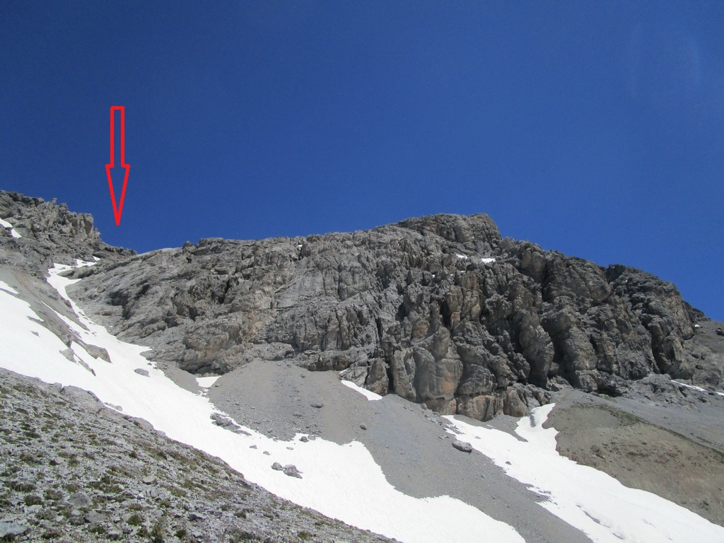 Traverzujem snehové polia smerom do sedla kam smeruje značka a rozhodujem sa odbočiť do žľabu. Terén veľmi podobný tým v Dolomitoch. Kameň tiež. Bez paličiek ani krok. Hore sa po troške lezenia dostanem ale dole si verím že nájdem niečo lepšie. Vyliezam na hrebeň a hneď sa rozjasní. Mužíci, stopy v snehu a je dobre. A hlavne jasná línia vedúce na dnešného krásavca favorita s konskou hlavou.