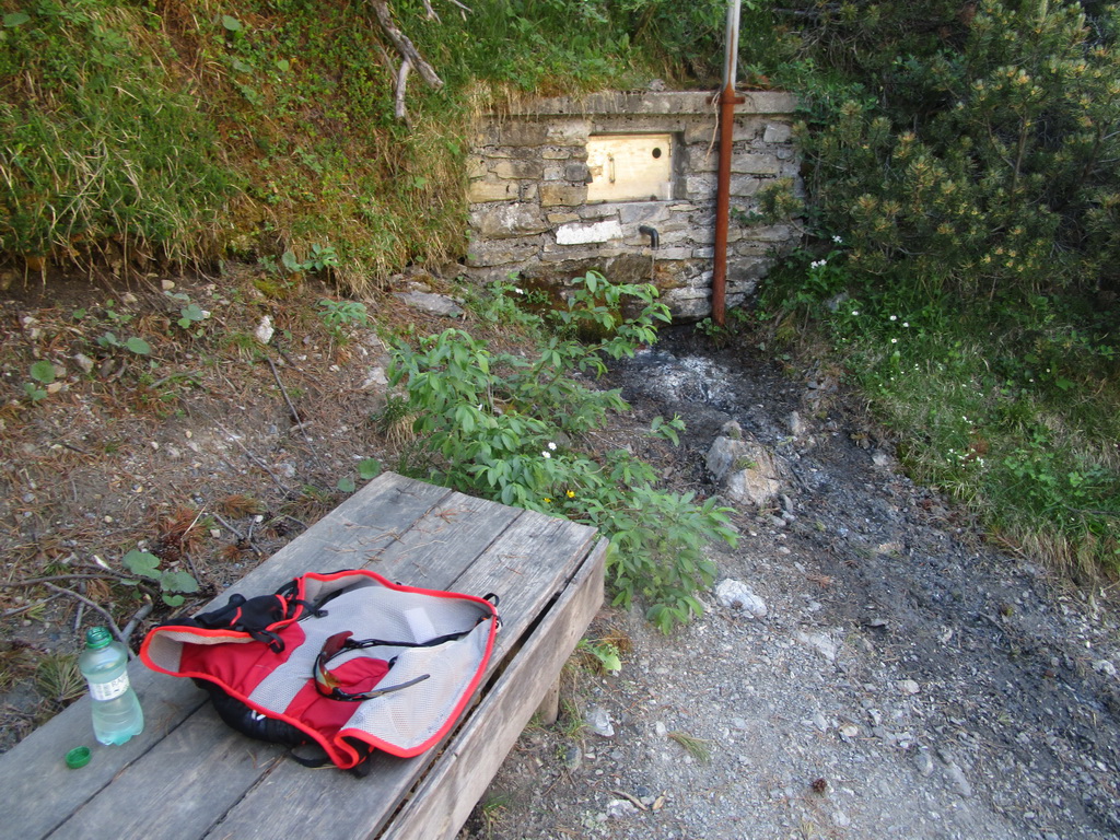 Štartujem tak ako mi v obchode poradili. z Parkoviska pri benzínke najprv chodníčkom nad galériou chrániacou cestu pred lavínami a potom už smrekovcovým lesom pekne hore na hrebeň. Obehnem pár ľudí a potom už nikto. Značkovaným chodníkom prichádzam ku drevenej chatke, prameň hneď pri nej potešil. Naberám všetko do plna tak ako mi poradili.