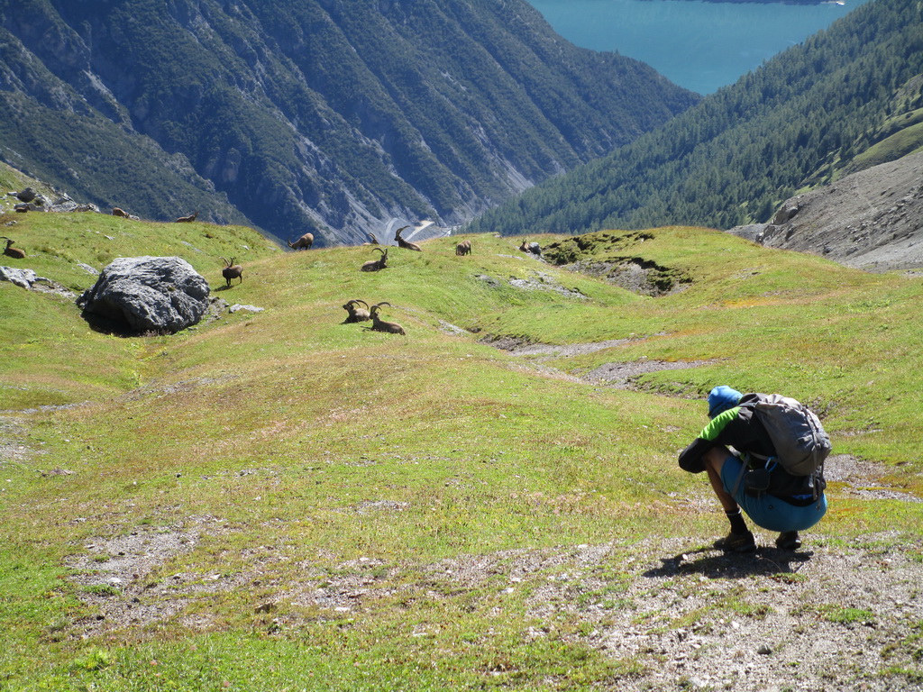 Zostup zradným pohyblivým terénom nakoniec prebehne ľahšie ako sme si mysleli pri ceste hore. Schádzame až do sedla Trupchun kadiaľ vedia značka spájajúca dva národné parky. Odtiaľ už zostupujeme značkovaných chodníčkom cez Valle del Saliente až späť do Livigna. Cestou ešte stretávame opäť početnú čriedu kozorožcov. Vyzerajú celkom v pohode, tu sa na nich zrejme nepoľuje ;)