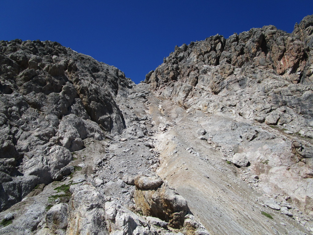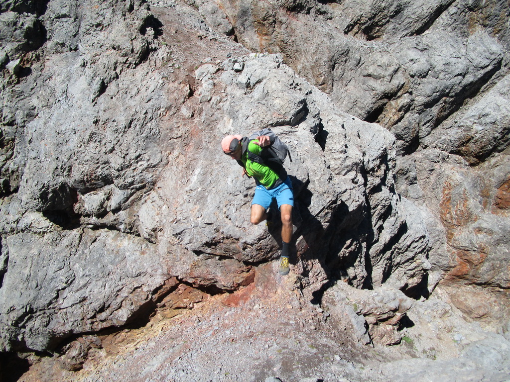 Po vychutnaní si prvého pekného vrcholu sme zišli naspäť do sedla a odtiaľ opäť zišli dole z chodníka. Traverzujeme popod Monte Sagliente, náš ďalší cieľ. Teraz sa už musíme sústrediť na ďalší postup. Pokúsime sa nájsť schodnú výstupovú trasu na vrchol. Strihneme si to žlabom z ktorého traverzneme do strmšieho svahu až na hrebeň. Tu objavíme mužíkmi značený exponovaný traverz. Je to trošku dobrodružné, ale mužíci nám dávajú potrebnú istotu a pokoj.