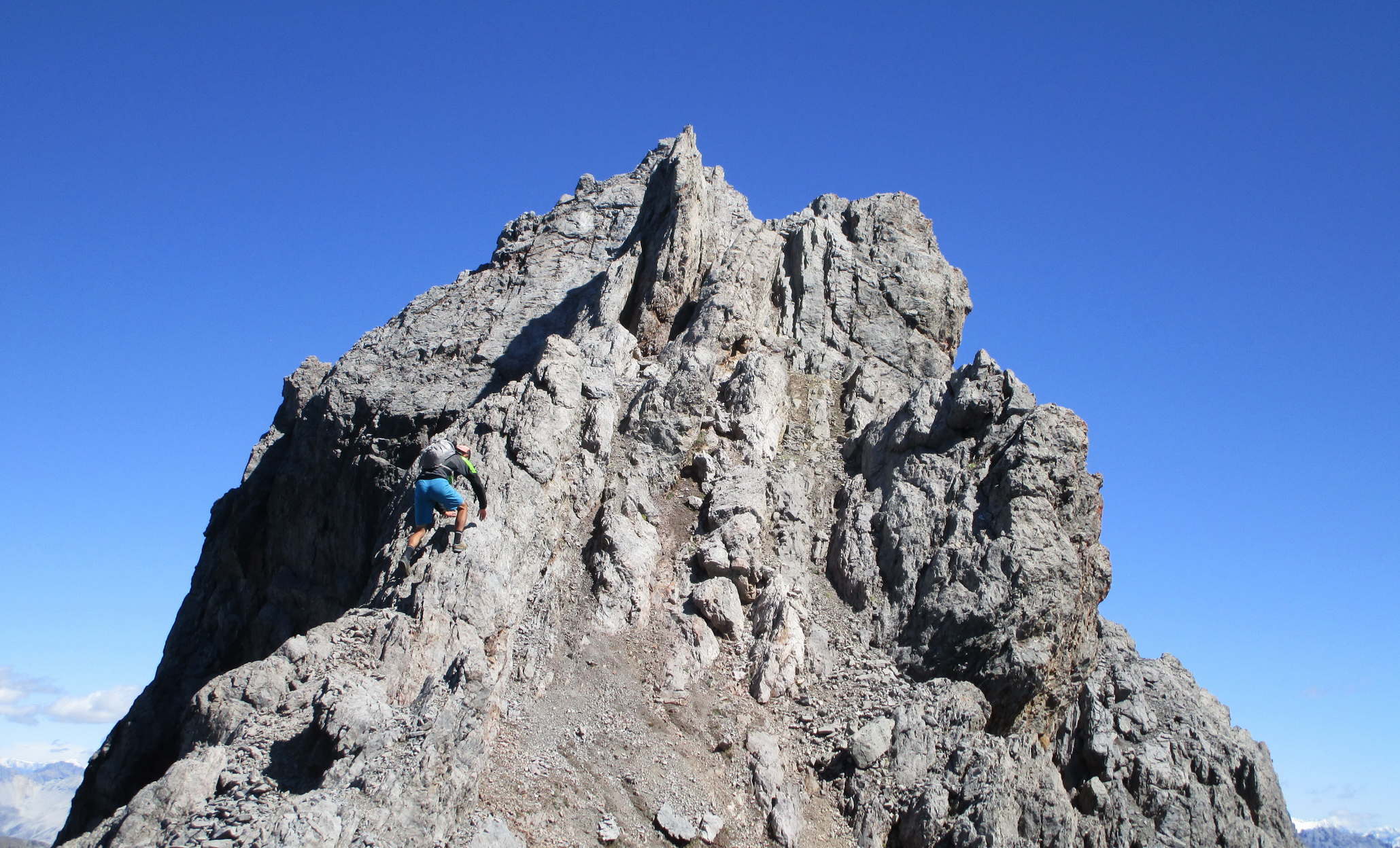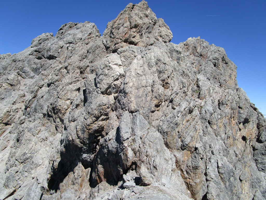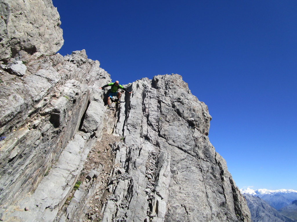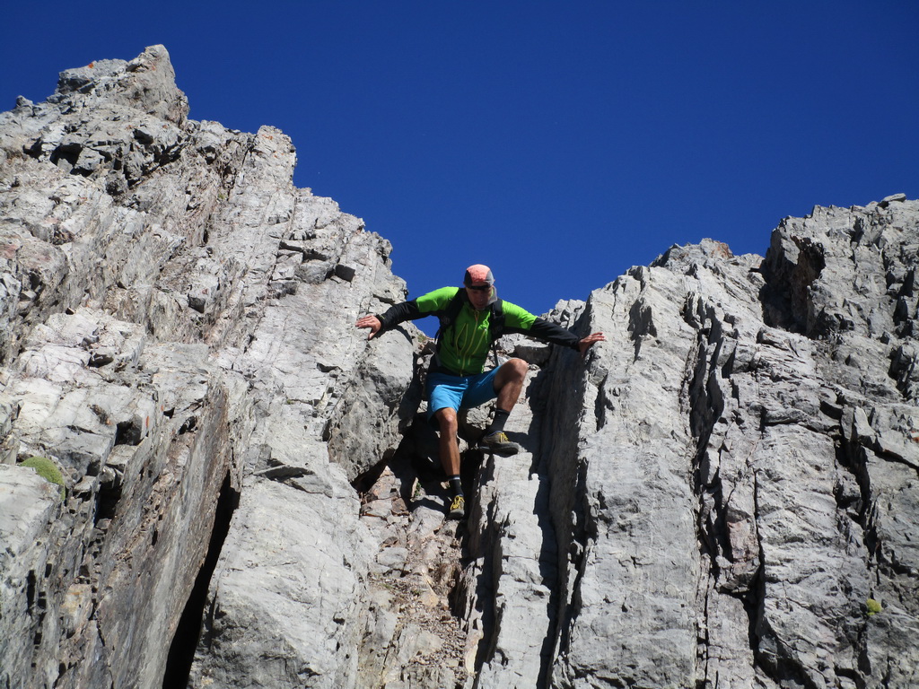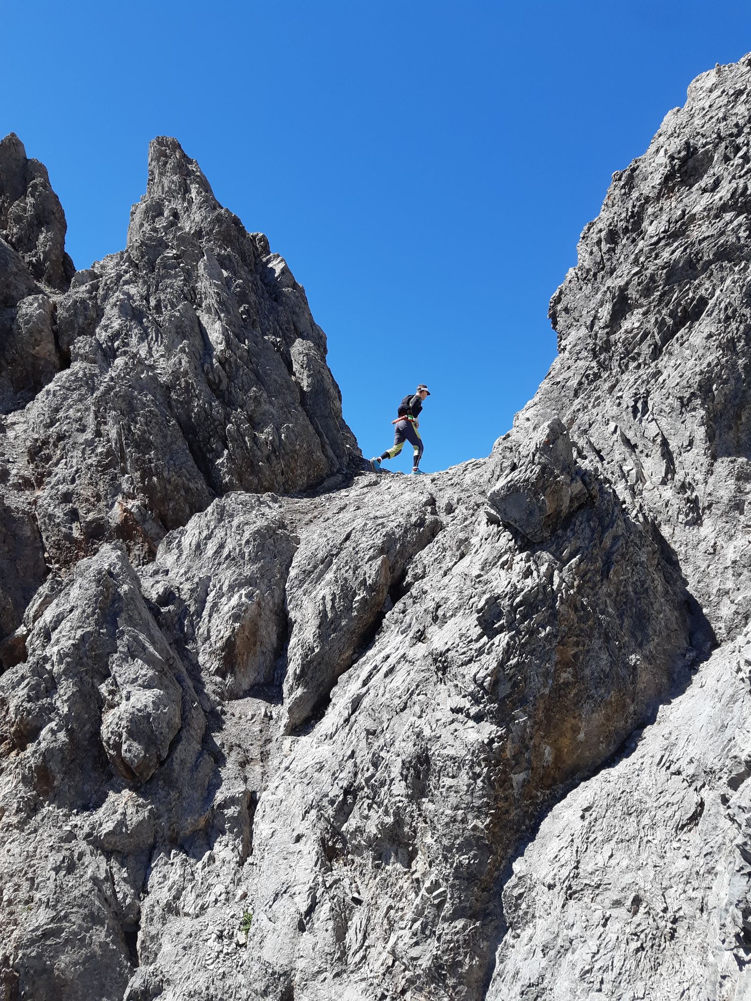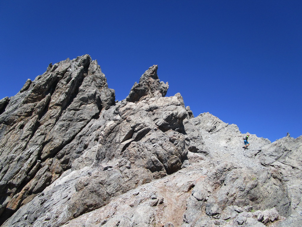 Občas robíme prieskumné výpady ale darí sa nám postupovať relatívne logickým terénom ďalej. Sem tam prelezieme ľahkú stienku a postupujeme k vrcholu. Terén si síce zachováva svoju obtiažnosť ale stále je to v pohode. Pomerne ľahké lezenie sťažujú kamienky a štrk na ktorých by sa dalo pošmyknúť a tak zvýšená opatrnosť je na mieste. Prepletáme sa medzi vežičkami a bludiskom žliabkov až ku vrcholovému hrebeňu. Ten sa priostruje ale to sme už takmer hore...