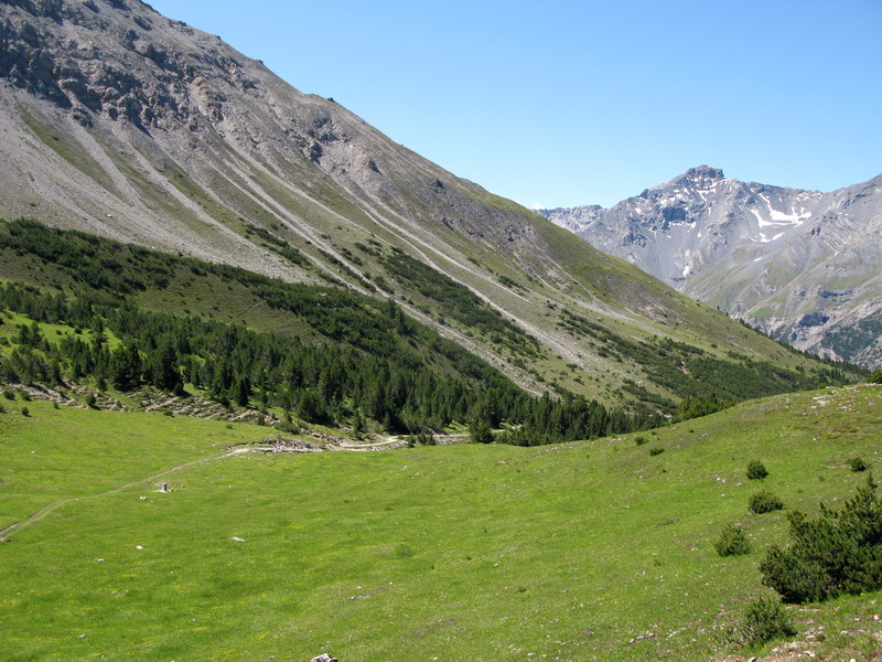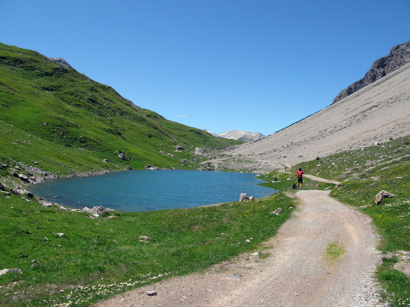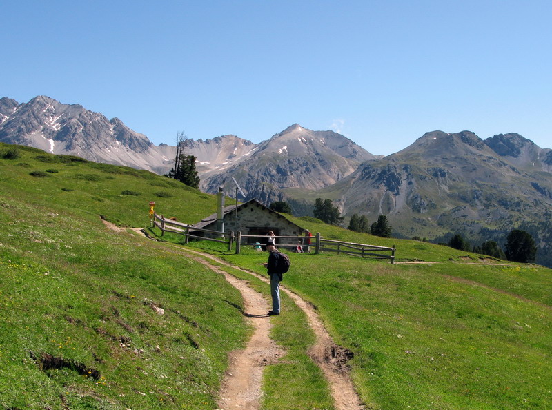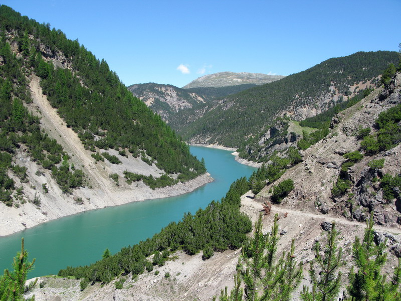 Potešil som sa určite netradičným fotkám a vrátil som sa na značkovanú trasu, teraz som už vedel, kde bola tá odbočka a rýchlo som dohnal stratu. Zaujímavosťou je , že chodníček na Švajčiarskej strane neznačený sa po prechode hranice zmenil na kvalitnú značku. Ocitol som sa v kraji trochu mimo hlavných turistických trás, pre peších sú to predsa len veľké vzdialenosti. Nestretol som ani človiečika a tak som si zjazd serpentínami vedúci miestami po "golfovej" trávičke ku priehradnému jazeru Lago di Livigno vychutnal.