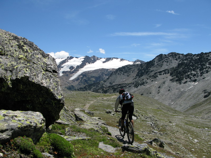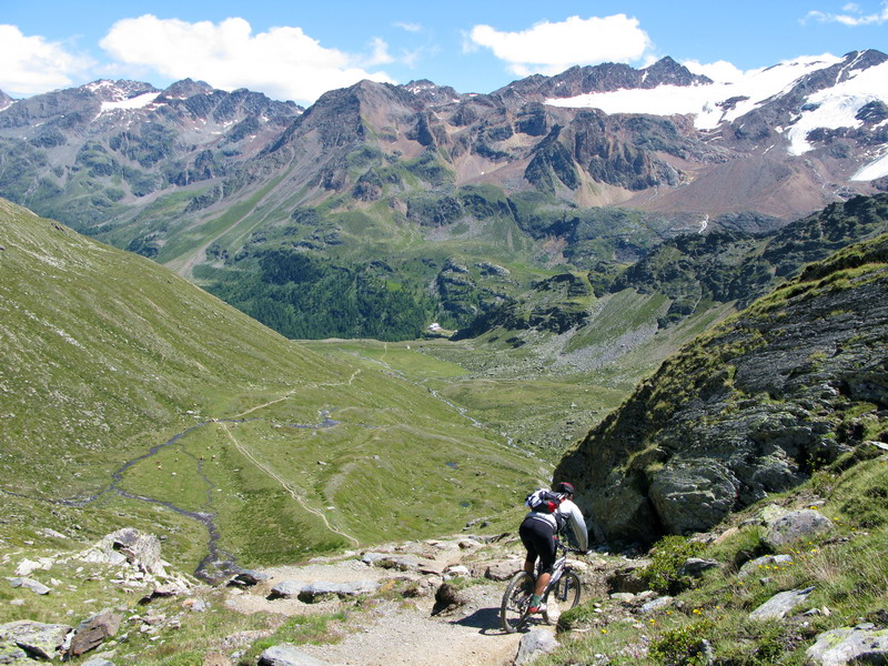 Hore v sedle na vás budú turisti pozerať, že "kamže s tým bikom"? Nenechajte sa vyviesť z rovnováhy, a s úsmevom sa popri biku vydajte kráčať dole. Prvých pár sto metrov jednoducho treba bike zniesť a potom to začne. Nádherný zjazd dlhou dolinou, hore ešte občas prerušený nezjazdnými pasážami, vás dovedie až do Martelltalu.