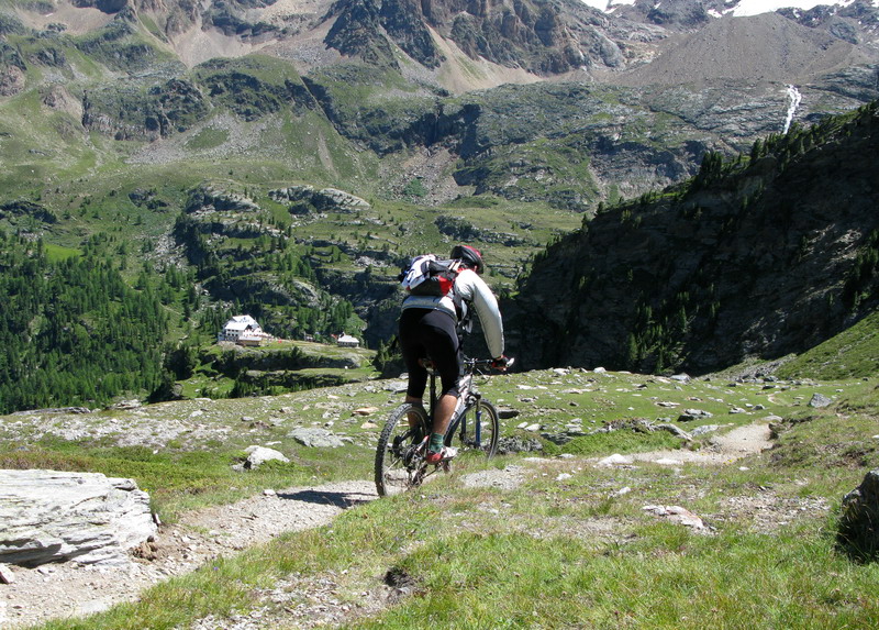 V závere doliny chodník prechádza popri vysokohorskej chate Zufallhütte. Tu som sa zastavil občerstviť sa a pokračoval po peknom a ťažkom chodníku dole, na rázcestí asi 1 km pod chatou si môžete predĺžiť zjazd odbočkou vpravo. Pri budove staršieho a odstaveného hotela však odporúčam napojiť sa už na cestu. Ja som totiž skúšal ísť ďalej po turistickom chodníku, ale viac som tlačil ako jazdil. Priehrada sa síce dá obísť po štrkovej ceste sprava, ale potom sa po priehradnom múre vráťte na hlavnú cestu. Ja som v očakávaní dobrého zjazdu pokračoval po chodníčku č.36 a moc sa mi to nevyplatilo. Aj napriek pár pekným úsekom som zase viac tlačil ako jazdil. Vzhľadom na dĺžku a náročnosť celého okruhu je lepšie v Martelltali už moc nešpekulovať a pustiť sa jednoducho dole po hlavnej asfaltke.V závere doliny treba odbočiť na Morter, tam vás už značky navedú na cyklotrasu vedúcu dolinou Vinschgau. Tu sa po peknej cestičke (bez áut), vedúcej popri rieke a obklopenej hustou zeleňou, dá dostať až do Pradu (dobre značené). Odtiaľ začína už spomínané stúpanie do Suldenu cez dedinku Gomagoi (začiatok stúpania na passo Stelvio).