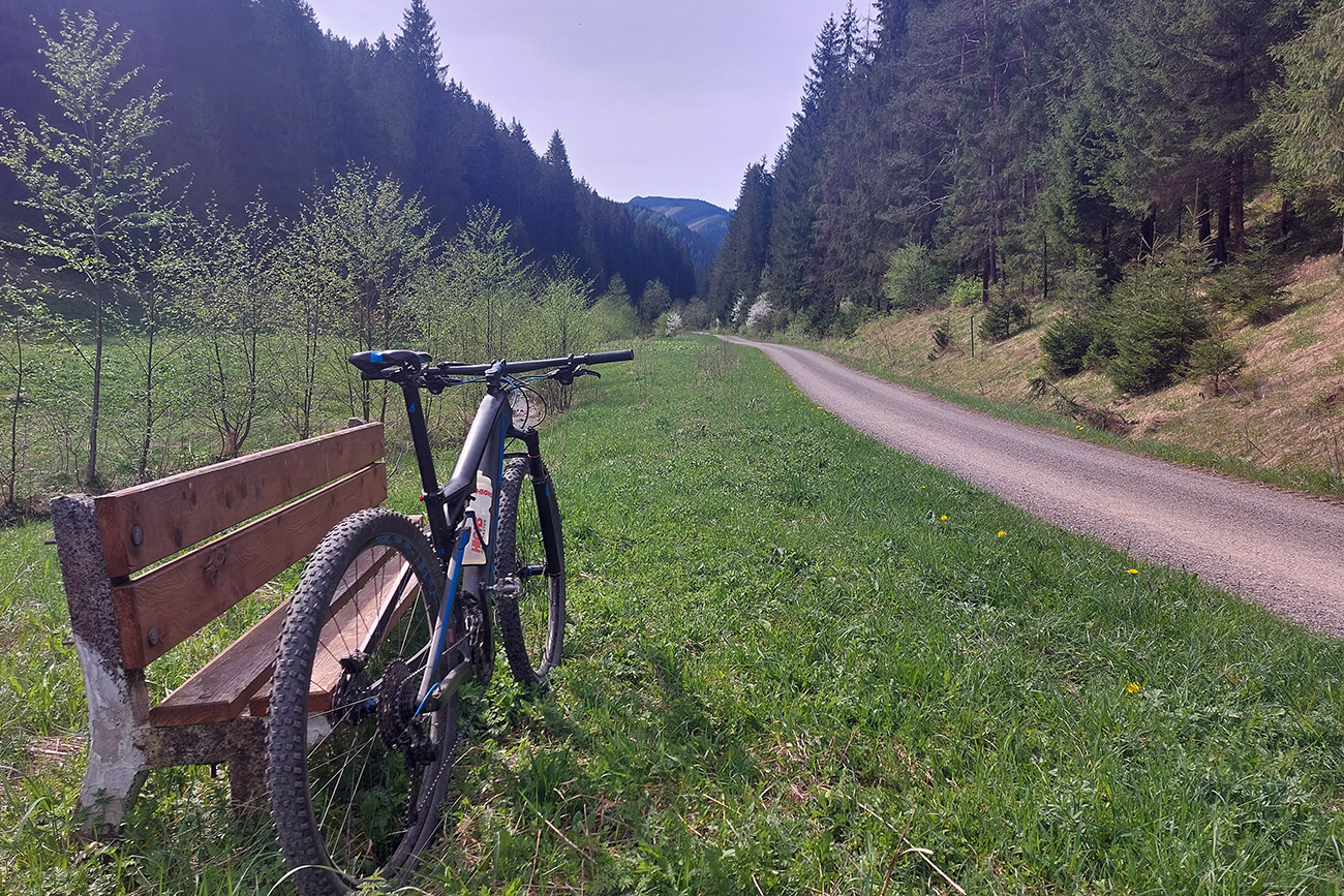 Nad Sliačmi som najskôr nazrel do Sliačanskej doliny: príjemné stúpanie v tieni popri potoku, pod kolesami relatívne nový asfalt. Ani nie moc zahádzaný bordelom - na to, ako sa v hornej časti doliny ťaží drevo. Otočil som to na otočke, ďalej smerom hore už by to bol podľa stavu zvážnic skôr cyklotrial: