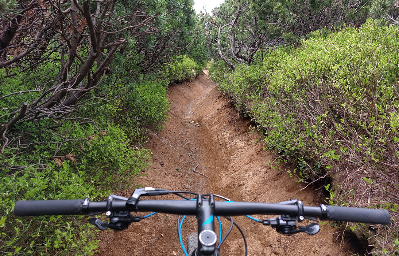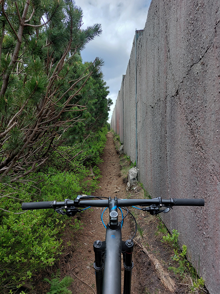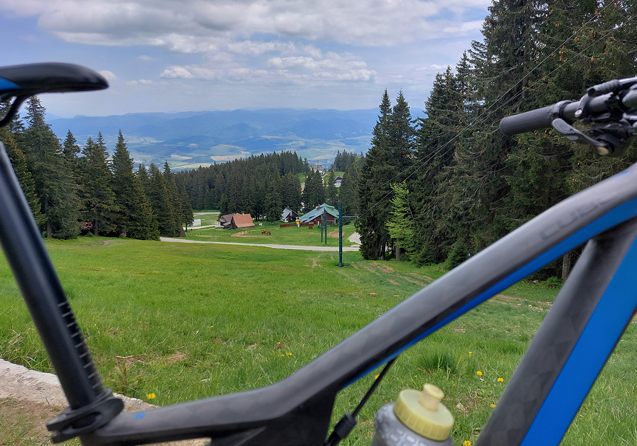 Takže na úvod technickej časti hrebeň medzi Krížavou a Minčolom. Obchvat vysielača úzky popri plote aj v tuneli z kosodreviny - tam prosím nasledovníkov ohľaduplne, pešiaci majú prednosť. Potom striedanie rovných úsekov po lúkach aj v lese, medzi nimi zo tri technickejšie zjazdíky po výmoľoch, koreňoch a voľných šutroch. Pekné, hravé jazdenie.
