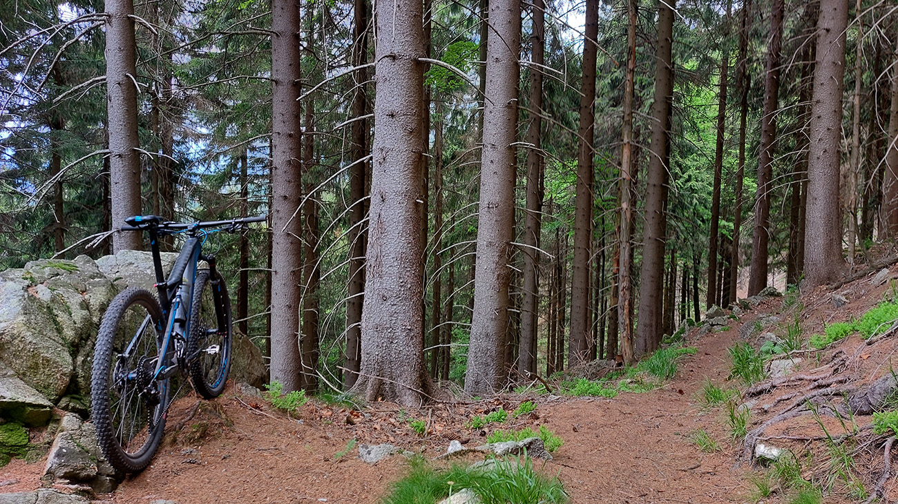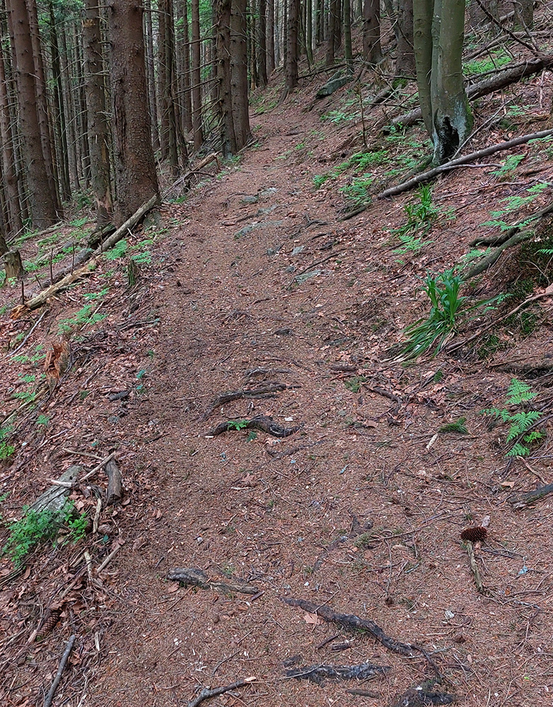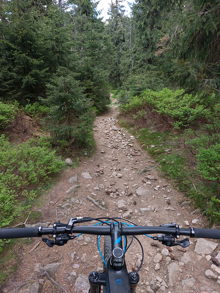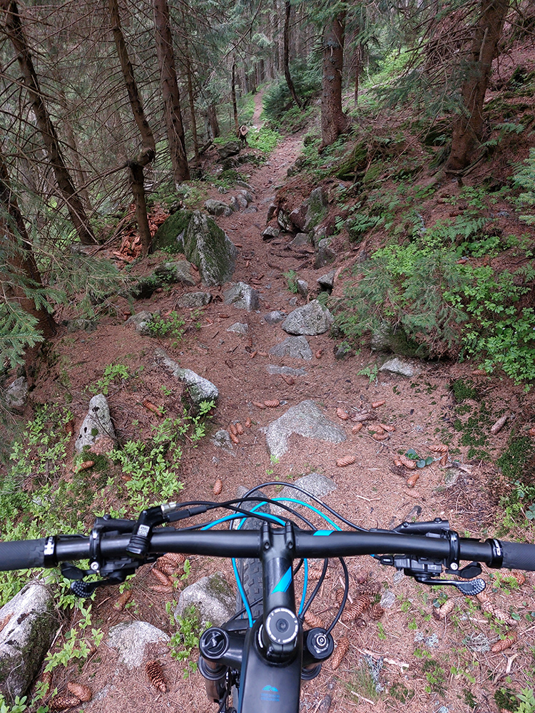 S vjazdom do stojaceho lesa sa to ale preklopí a singlík jemne klesá až na svoj severný koniec, dobré štyri kilometre, prevažne pekným, pestrým lesom. Hladkých úsekov je tu ale veľmi málo, flow nech nik nečaká. Len v strede a ku koncu je povrch trochu jednoduchší. Inak aj zopár krátkych rockgardenov je tu, ale najmä plno koreňov a kameňov. XC zdvihy ani pevné sedlovky tu nie sú doma, ale opatrne to celkom ide. Len treba byť neustále presný v nájazdoch do medzierok, lebo chodník je aj úzky a často naklopený do svahu. Neustále sa vlní doprava – doľava, miestami sa aj nakrátko zdvihne. Pestrý je, len treba aspoň trochu vedieť jazdiť. Na konci krátkym zošupom vyúsťuje na zvážnicu, ktorá je už dlhšie pár metrov pod ním viditeľná.