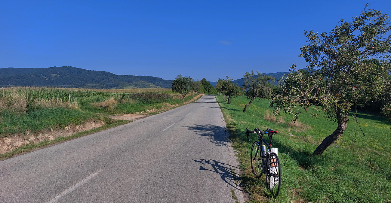 Takže začiatok a koniec v Ležiachove pri cintoríne. Žiadna morbídna symbolika, je to pre mňa len taký dobrý „logistický“ bod, lebo tu často tankujem bidóny a je tu dosť miesta na zastávke pri ceste. A dnes tu ten okruh aj uzavriem. Príjemne vlažné ráno, síce pracovné, ale v strede prázdnin, tak cestou do Moškovca ešte nie je moc premávka. Fičí južný, tak si „líham do nadstavcov“, nech to mám čím skôr za sebou. Lebo krajnica tu prakticky neexistuje a dlhé rovinky šoférov zvádzajú... V Moškovci prvá modifikácia oproti origo okruhu: ani doprava na PD, ani doľava na TR, ale stredom po „cezpoľnej“ asfaltke: