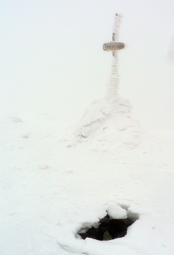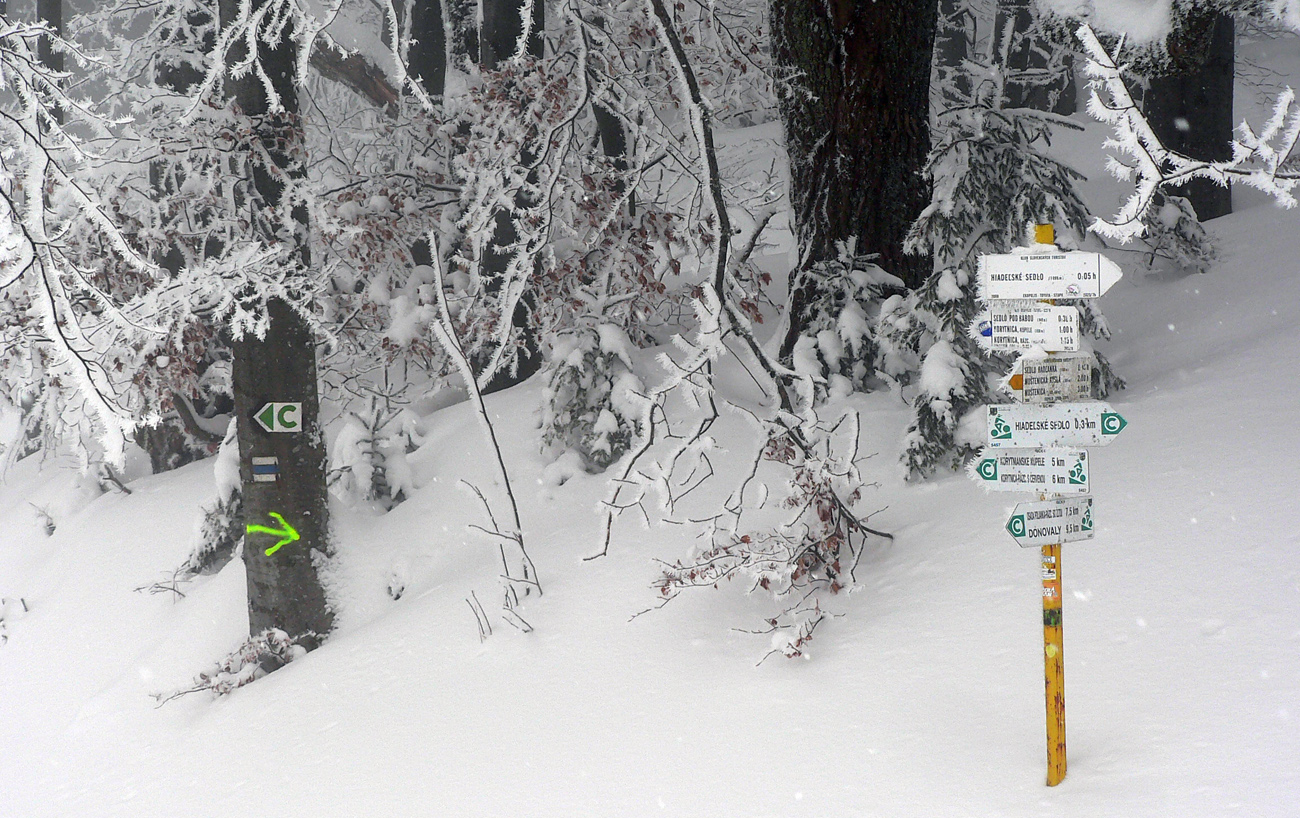 Hore nevidno ničovatô nič, tak cestou aspoň tyče obíjam, ale dáko ich je čoraz menej... Ale stôp požehnane, tak idem po nich. Intuitívne vnímam podľa sklonu terénu, kde asi som, ale že idem aj s tými stopami nejako moc prudko dole a že nejako priskoro som odbočil viac doprava, to mi dochádza, až keď vidím na strome pred sebou zelenú :-) Jáááj, ale do Brusna nechcem!!! Že bude viac stôp týmto smerom ako po hrebeňovke, to by mi veru nenapadlo.