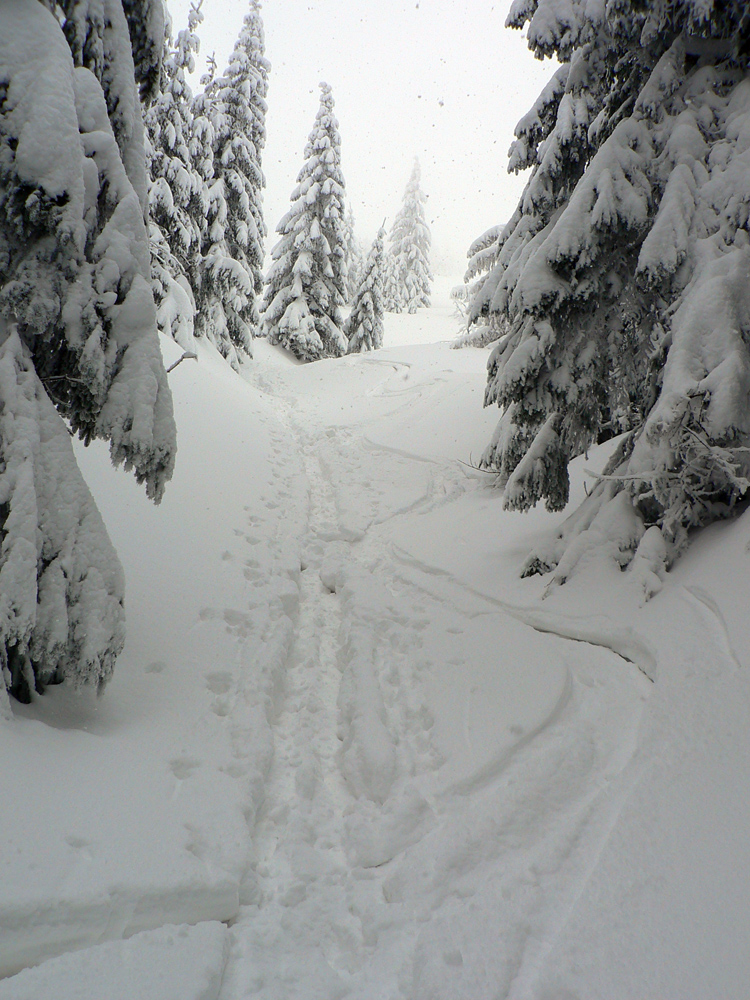 Zato lyžovačka lesom dole na cestu, to je parádna prachovačka. Ešte tak poznať miestne rúbane a skratky... Ale som rád, že vidím výstupovú stopu a tá ma vedie neomylne. Len dole, pár metrov nad asfaltkou, treba v lese opatrnejšie, konáre striehnu spod snehu. Na ceste pár cenťákov autami ujazdeného snehu, to je parádny odjazd až na horný koniec Lúžnej. Spoj mám o štvrťhodinku, tak sa to zas podarilo načasovať, už len to počasie keby konečne... Ale aj to raz bude :-)