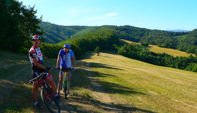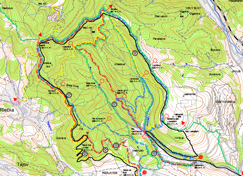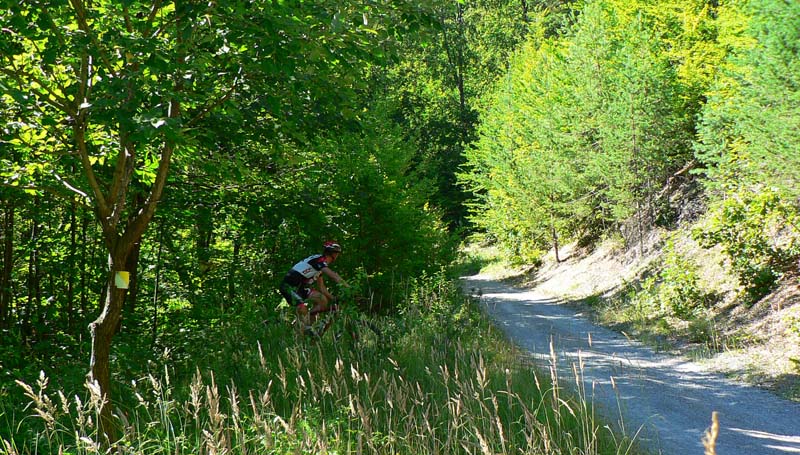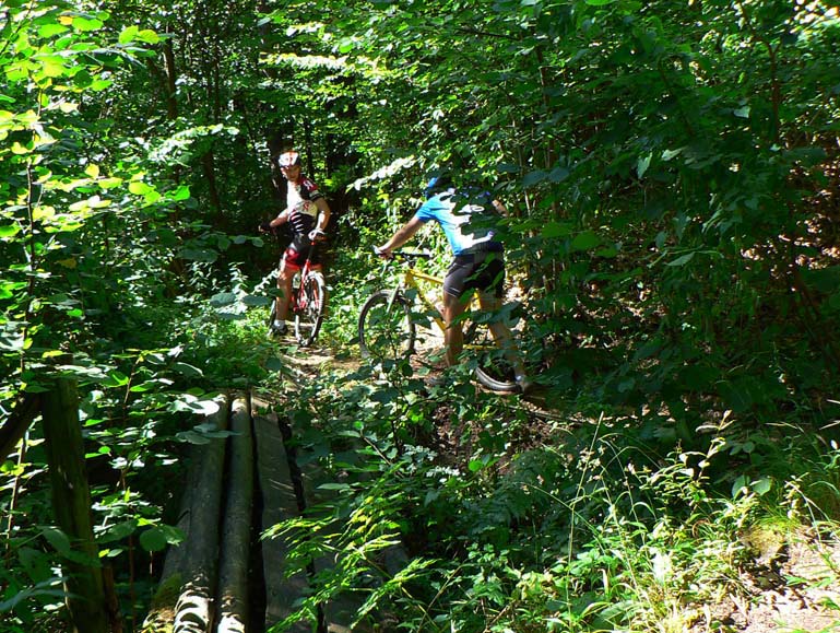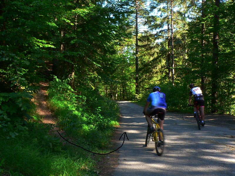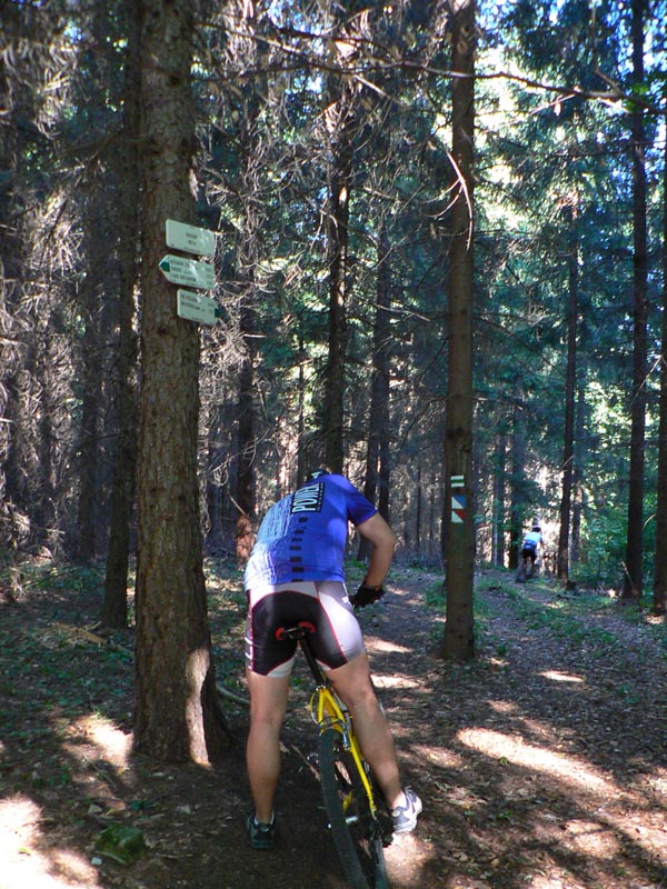Takže vyrážame traja, v popoludňajšom hice z Podlavíc „od válova“, po prašnej ceste, ktorá vedie do Riečanského sedla. Zisťujem, že chalani o singlíku popod zvážnicu do sedla nevedia, takže pri rampe velím odbočiť vľavo a už sa šplháme čoraz strmším výmoľom. Trochu driny na jeho konci a potom už pár kilákov príjemného traverzu v tieni lesa. Len kolesá sem - tam odskakujú nežiaducim smerom na borovicových šuškách. Na konci pár strmších a úzkych „vracačiek“, na prejazd ktorých treba mať excelentnú techniku (nie náš prípad). Medzi nimi ale ďalšie stovky metrov príjemných chodníčkov a konečne sa vynárame na ceste do Riečanského sedla.