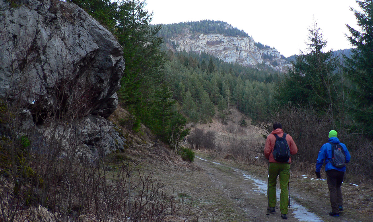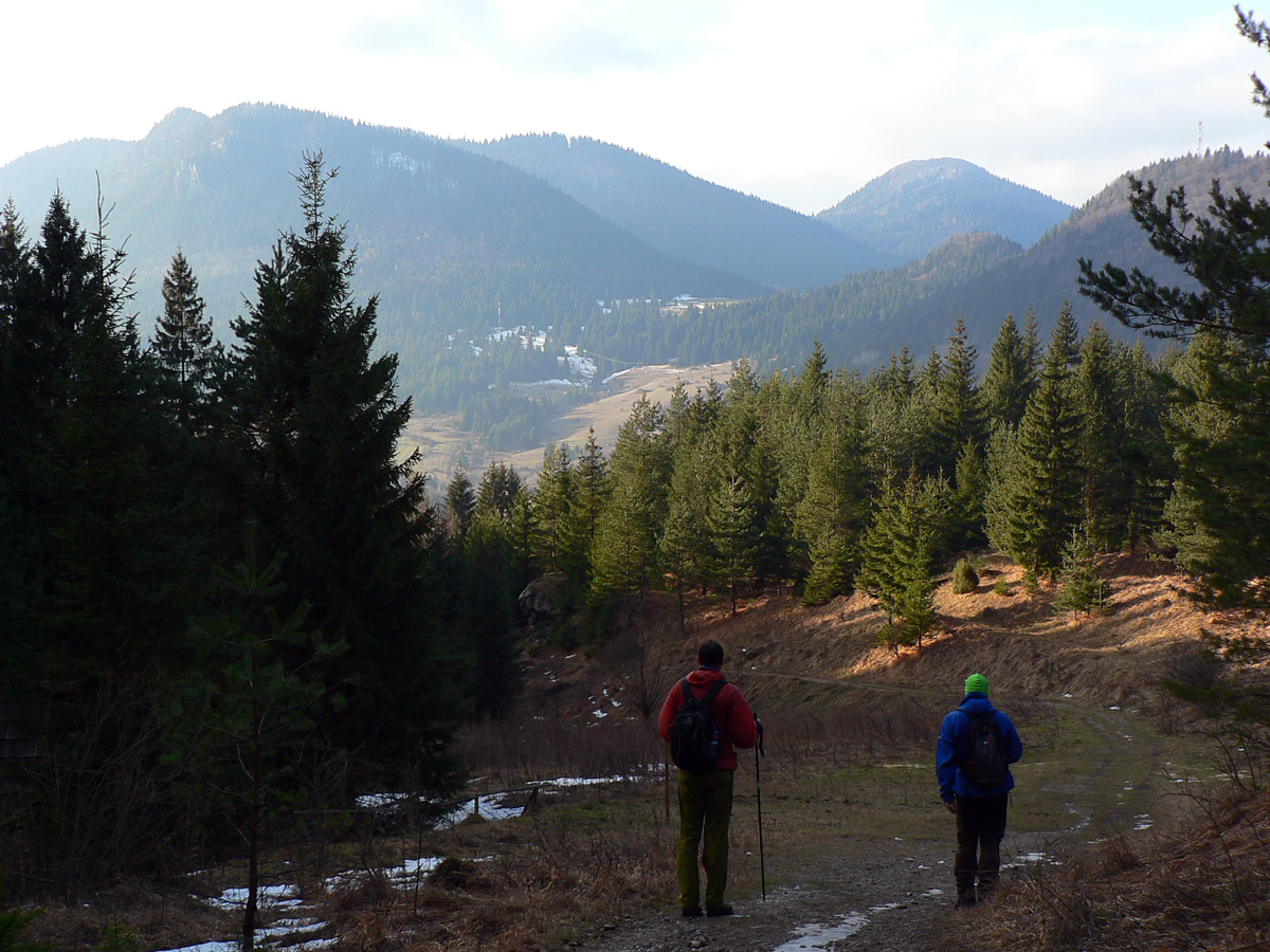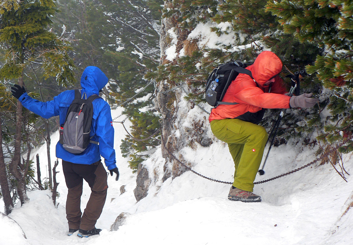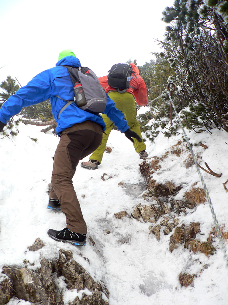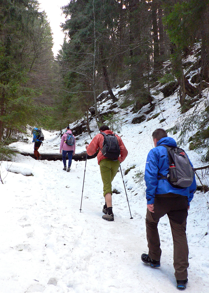 Nad dedinou ozaj krásne, pri pohľade dozadu nad kopce Šípskej Fatry. Dopredu pohľad na klenbu lesa nad chodníkom, strmina striedaná naklonenou rovinou, fučíme ako rušne... Nižšie ľad a šutre, vyššie ľad a tvrdé snehy. Už pred deviatou je tu rušno, už aj zhora idú niektorí, niektorí aj zodpovedne na mačkách.