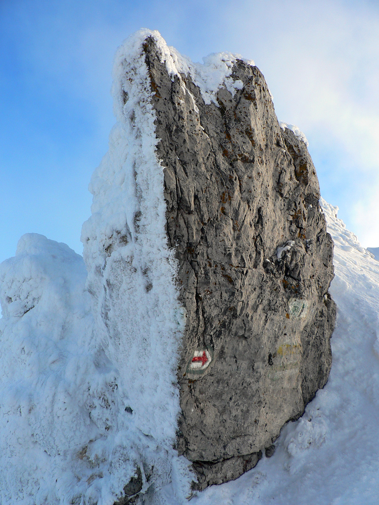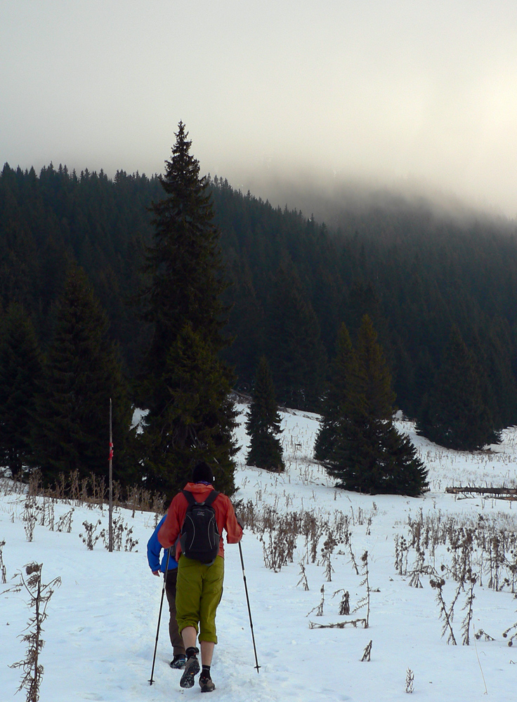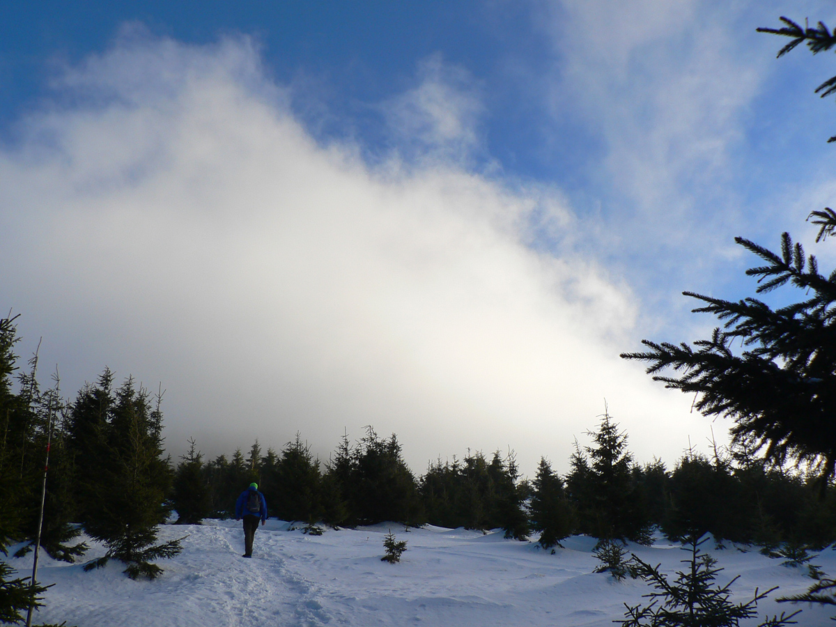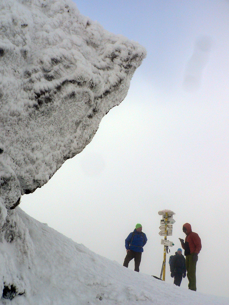 No ale stúpame ďalej, keď už sme tu. Z juhu fučí, mraky sa ženú kamsi na Oravu, front sa sem rúti skôr ako rosničky predpovedali. Konáriky omrznuté z jedného smeru, my o chvíľu tiež. Sprava.