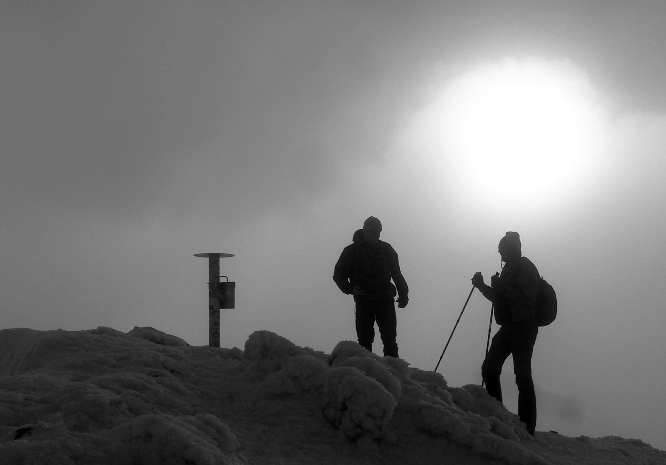 Cik cak lesom, strmá lúka, reťaze a záverečný traverz a môžeme sa kochať námrazou, poohýbanou kosovkou a tak... Presne tá škodoradostná situácia nastala, že slnko presvitá zhora, miestami aj modrá obloha, ale na okno do krajiny by sme sa poriadne načakali...