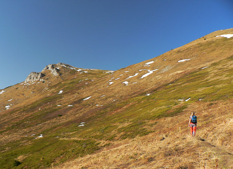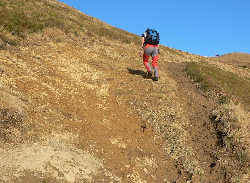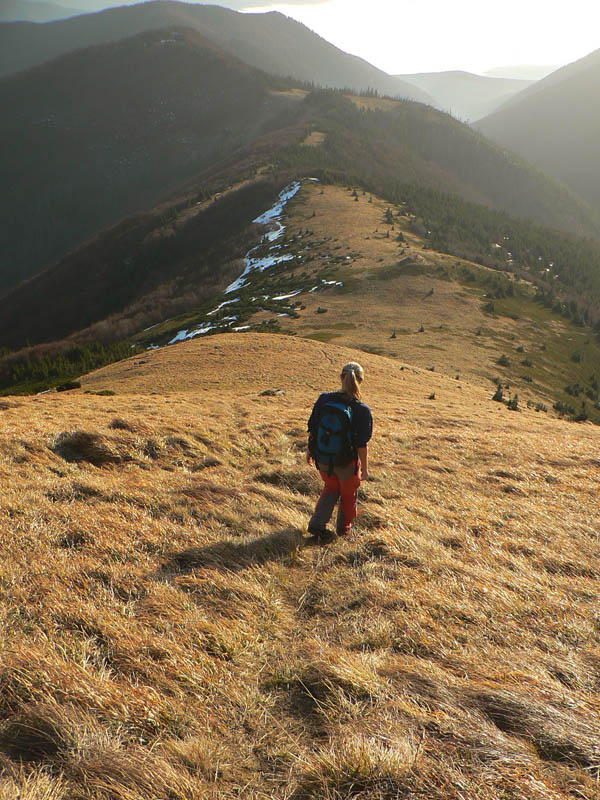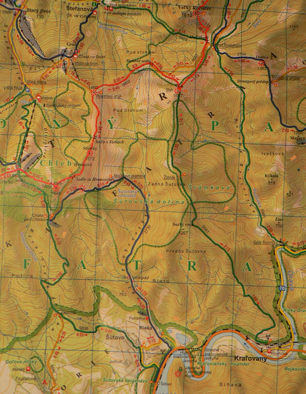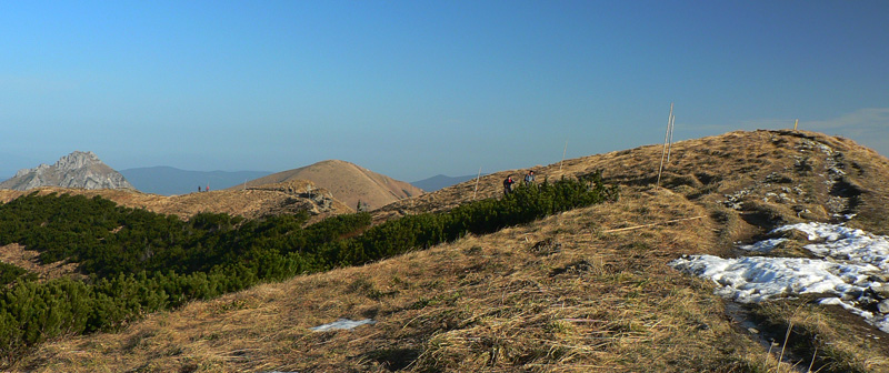 V úvodnom stúpaní od vodopádu cez les a Mojžišove pramene je len pár oddychových úsekov, ale traverz popod hrebeň smerom na chatu pod Chlebom je pohodový. Len na niektorých miestach je dosť poničený lavínami a zosuvmi. To isté platí aj o žltej odbočke, ktorá z neho vedie na hrebeň (do sedla Za Hromovým). Tu už trávnatý svah veľmi trpí eróziou, chcelo by to presmerovať alebo spevniť chodník. Zo sedla Za Hromovým do Stohového sedla je to ďalšia asi hodina a pol prevažne z kopca, s krásnymi výhľadmi do Vrátnej aj do Turca. V tomto počasí tu bolo samozrejme plno ľudí. My sme nechápavo pozerali na obrovské holoruby priamo pod Veľkým Rozsutcom, hnusný zásek novej cesty na Grúni a nejaký nový hotel pod Sokolím, ktorý svojou výraznou žltou farbou ohromne „ladil“ s okolím. Biznis forever! Na druhej strane hrebeňa (pod Žobrákom) sa zas v lese vyzúrili lavíny, vietor aj lykožrút. Každý nech si domyslí, čo do prírody národného parku patrí viac.Stúpanie na Stoh bolo tradične nekonečné a šmykľavé, odmenou za námahu bol „pózujúci“ Rozsutec. Klesanie do Kraľovian je najprv po príjemnom chodníku nad hranicou lesa s peknými výhľadmi hlavne na protiľahlé svahy nad záverom Šútovskej doliny. Nižšie v lese už značka vedie po zvážnici, ktorá je hlavne v spodnej časti riadne povymieľaná. Dobrá ústupová trasa z hrebeňa, ale opačným smerom odporúčam len masochistom.