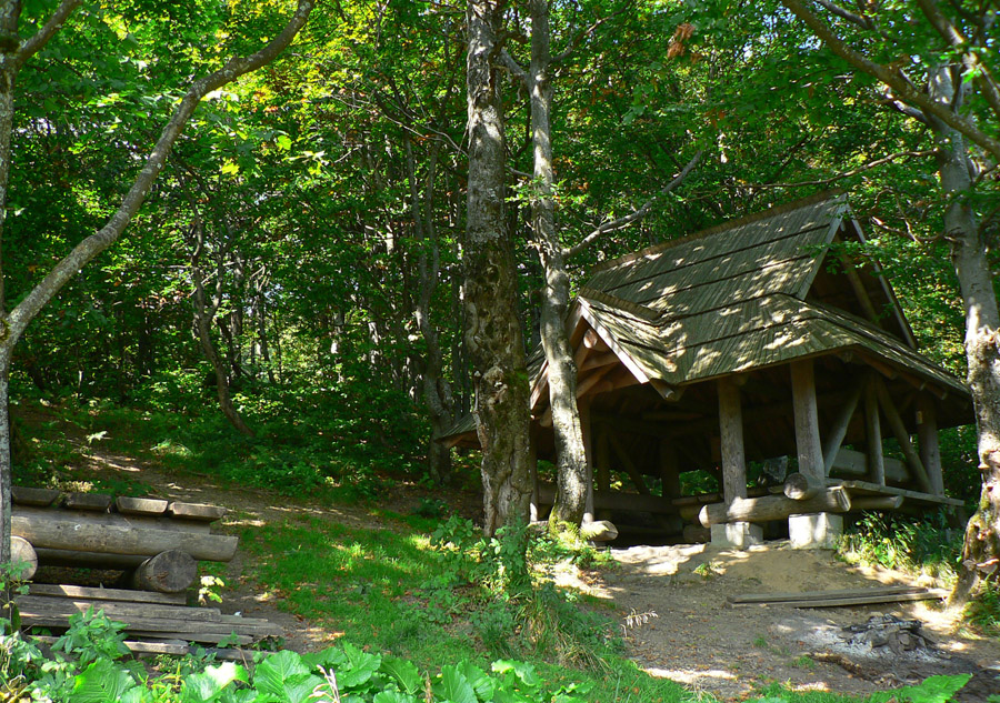 Fialoví až za ušami sa posúvame ďalej. Na konci lúky pod stromami je ďalší „unifikovaný“ poľský prístrešok, rovnaký ako pod Čierťažou. Na Jarabú skalu je to neďaleko.