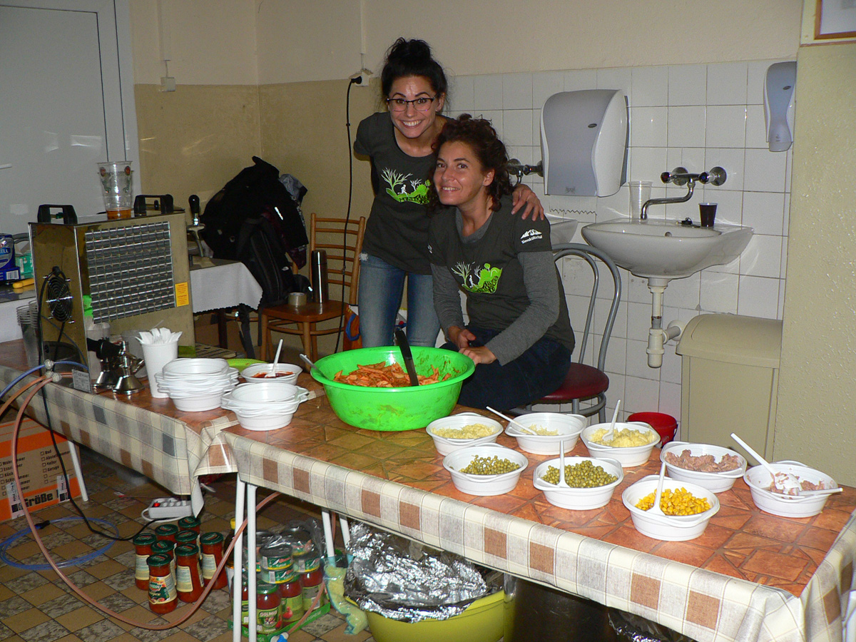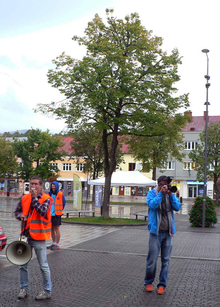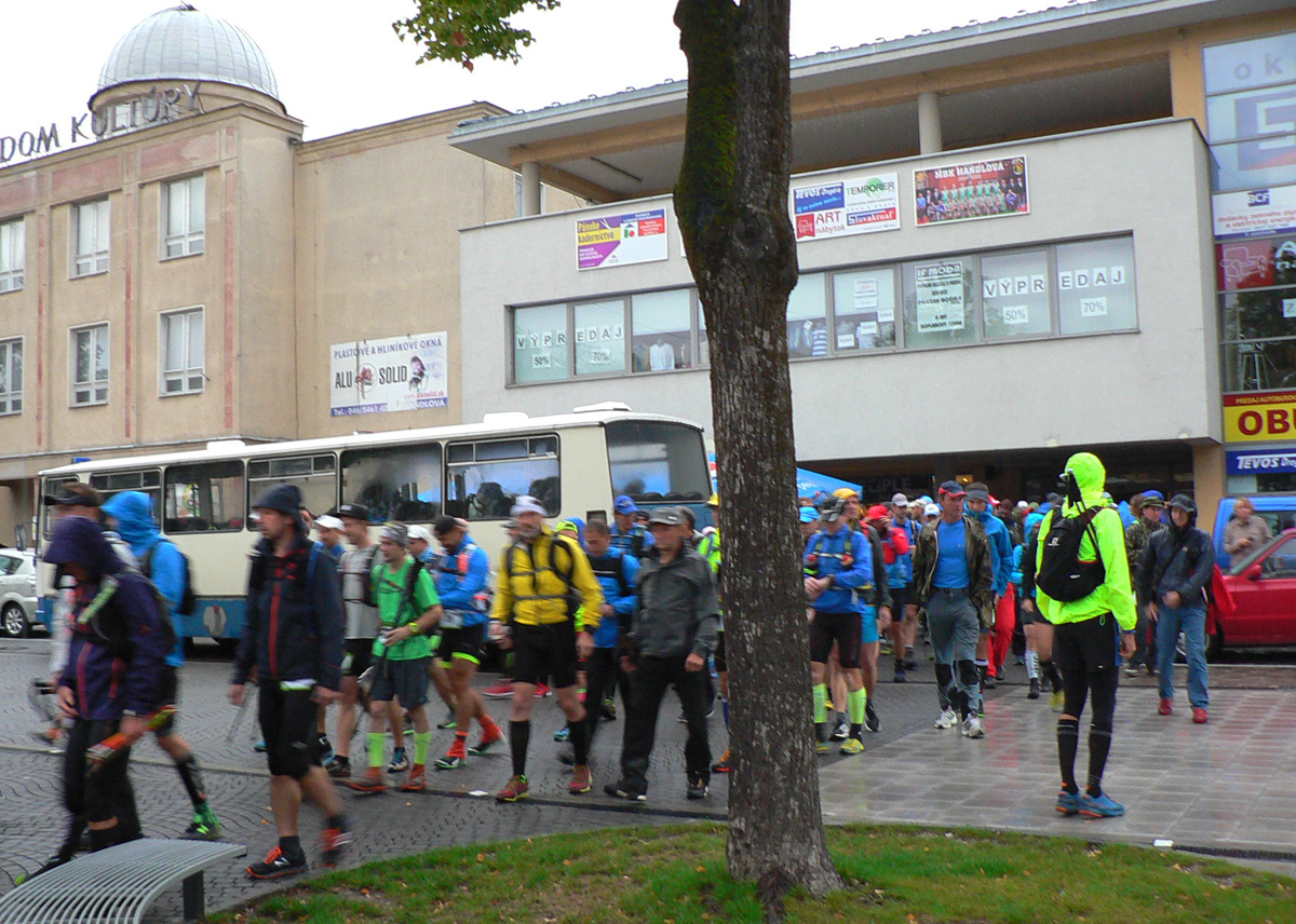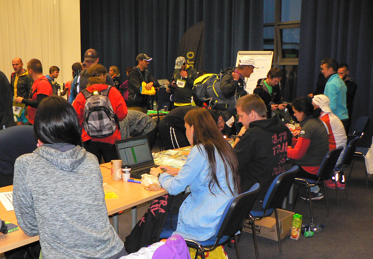 Dážď akosi už patrí k P100, že? A podobne ako orgovia doťahujú svoju robotu rok od roka k dokonalosti, aj dážď ako keby stále lepšie vedel, kedy má udrieť a na ako dlho... Teraz poriadne udrel nad ránom, po štarte ho to bavilo ešte asi dve hodiny a keď zistil, že neodradí, dal si pauzu. Ale vrátil sa zas večer, napríklad Žibrica aby sa fajne kĺzala. Najmä odkedy ide P100 z Handlovej, mám dojem že prší každý ročník viac. Ešte že sa v tom Asterione dá ukryť - prezentácia aj štartujúci. Len náčelník chudák behal s megafónom po lejaku a snažil sa nahnať ľudí spod strechy na štart. Ale natlačili sa akurát pod párty stan, skoro ako na MF100. No, ale zas nepršalo až tak... Ani trhovník s palicou nechodil vylievať napršanú vodu z previsov :-)