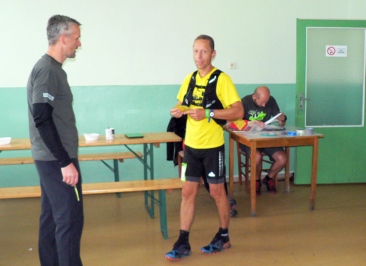 Dokonca aj olympijský víťaz Matej Tóth (pod zámienkou otvorenia školského tartanu) prišiel pozrieť, ako vyzerá ozaj tvrdý šport. Toto nie je pohodové krúženie po rovinke s občerstvovačkou každý kilák :-) Veď aj vzdal víťazom patričný hold. Alebo sa to len pod priehľadnou zámienkou stretli pod cieľovou bránou traja maskovaní mimozemšťania? Po nich sa už do ZŠ pod kruhákom trúsili aj obyčajní, aj keď dosť zaprasení ľudia (nezávidím upratovačkám v škole). Asi 170 ich do nedeľného obeda dorazilo. Vzhľadom na predpovede počasia a „úmrtnosť“ už pred štartom asi dobré číslo. Čiže aj limit finisherov pre zisk kvalifikačných bodov na Western States bol splnený.