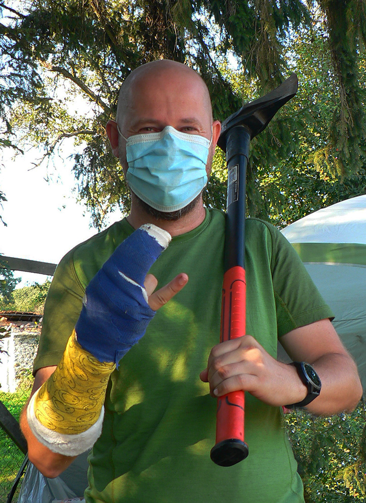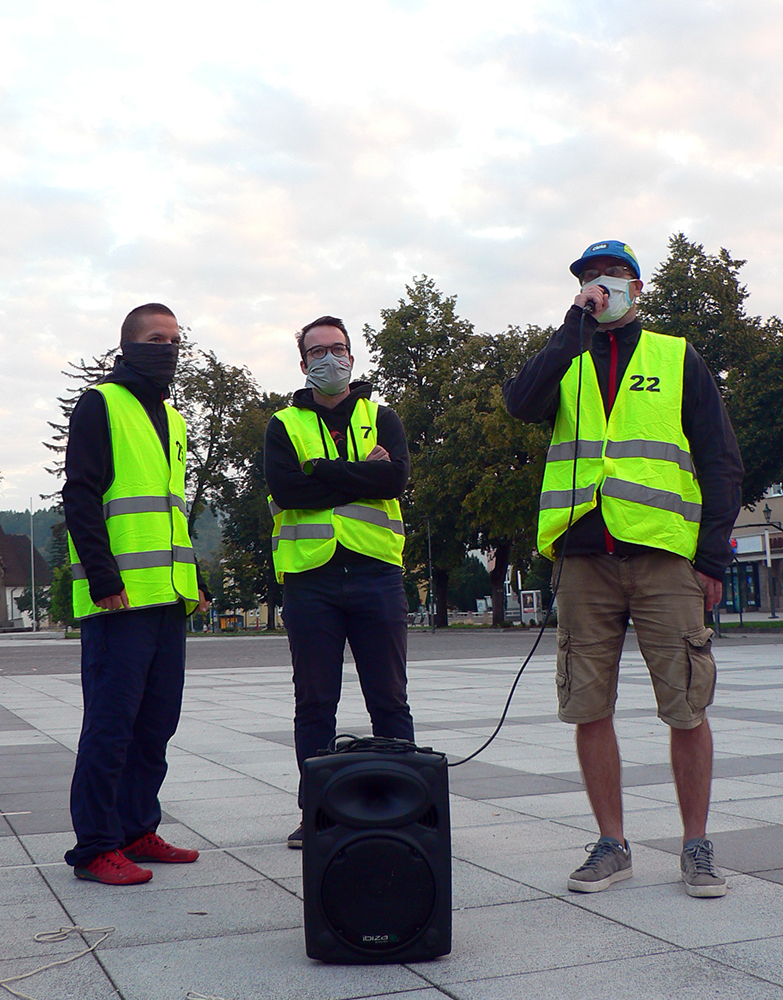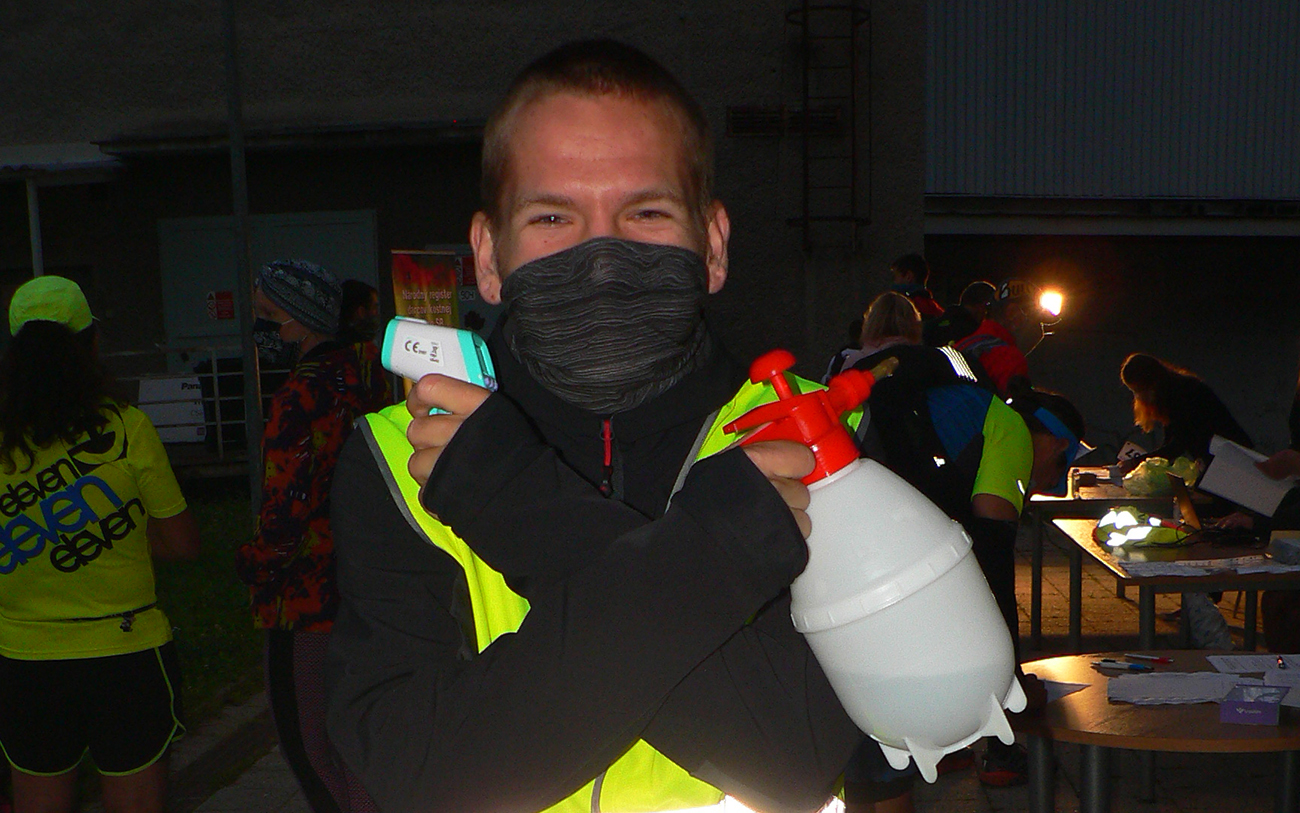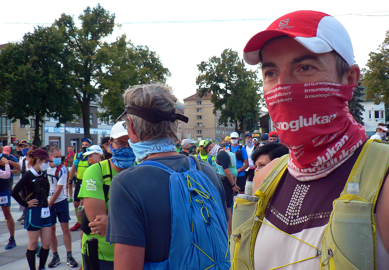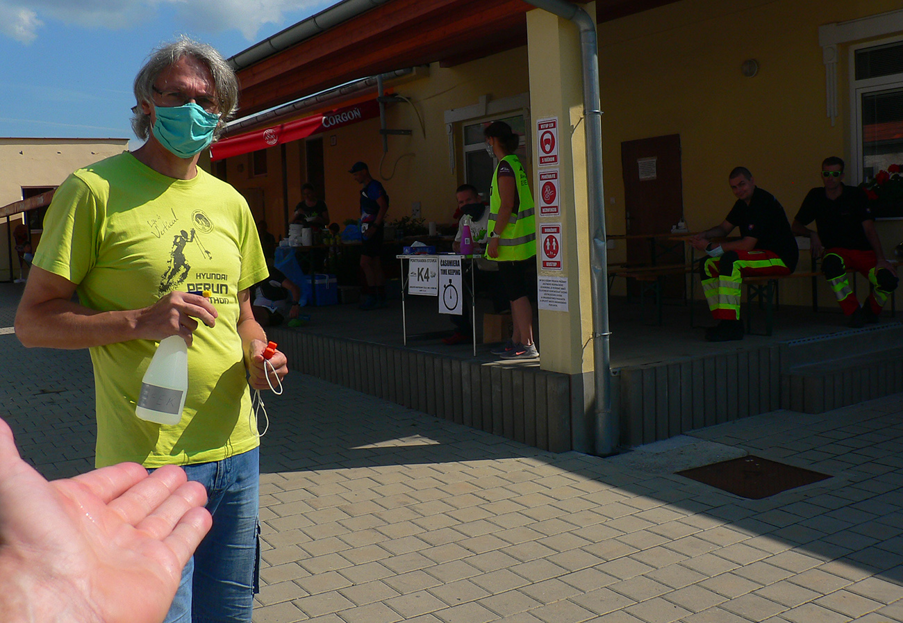 Takže keď sa mikrobus s našou „turčianskou úderkou“ dovalil v sobotu ráno do Handlovej na rínok, prvý nás na dvore za Asterionom odchytil dáky maskovaný terorista s laserovou zbraňou v jednej a chemickou v druhej ruke. Beriem, klasická prevencia v tomto čase, to treba. Všetci naokolo s náhubkami a snaha o držanie odstupov. Podávanie rúk zakázané, bozkávanie vraj povolené –to zas šíril Dalibor. A povinné podpisovanie viac ako dvojstranného prehlásenia účastníka. Tradičné oné, že sa vzdávam majetkov, zemí a účtov v banke v prospech SUT už dávno nestačí. Ale čo sme to za ľudia, keď orgovia musia (okrem iného) prízvukovať, že nezodpovedajú za počasie počas akcie???