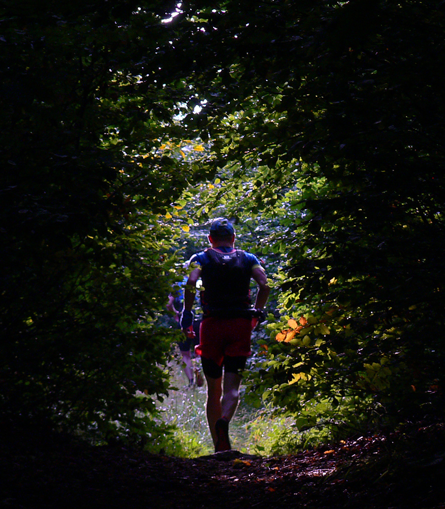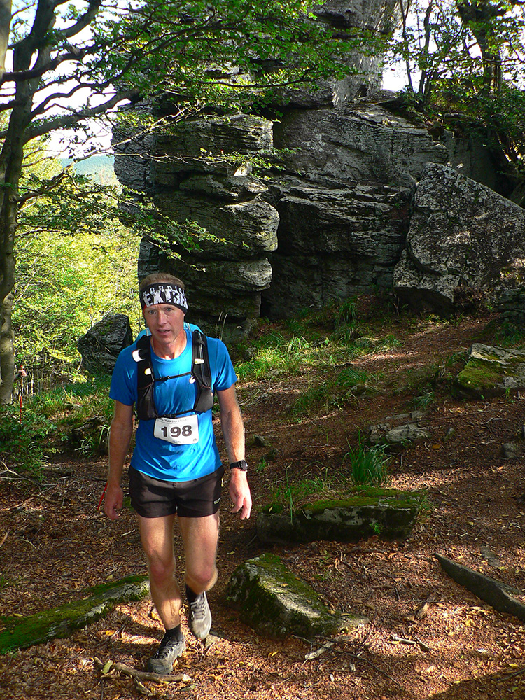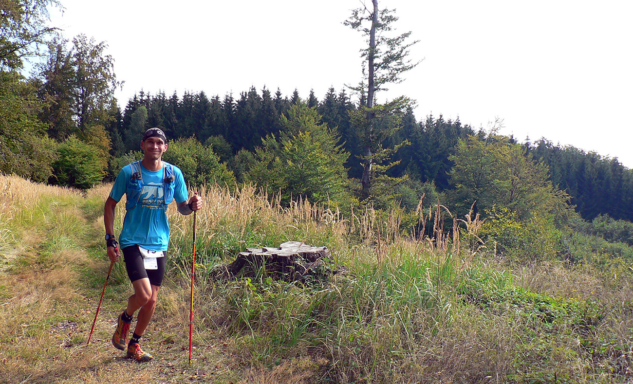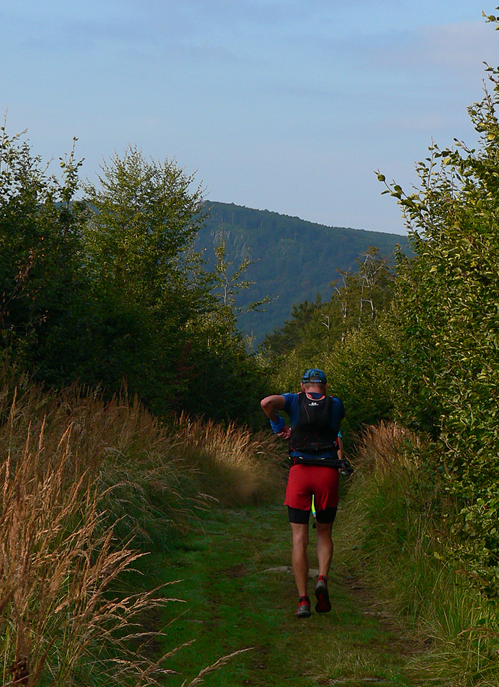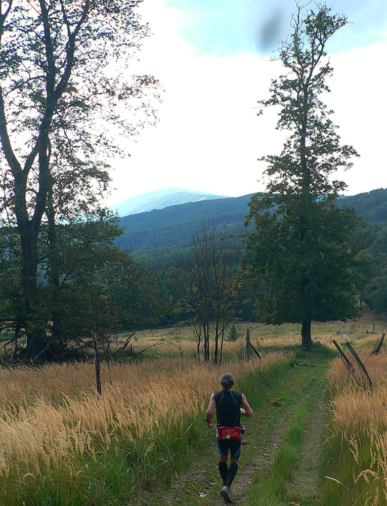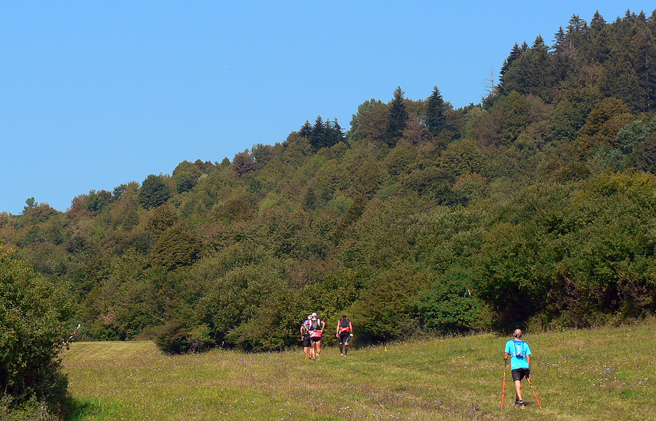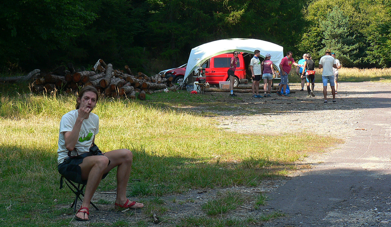 Skoré dopoludnie, vyššie nadmorské výšky a tieň v lese – celkom príjemné. Ale ako som zbehol na lúky pred Veľkým Poľom (K3), ako by ma čosi ovalilo. Jasné - ten žeravý vánok od juhu... Telo hneď začalo podvedome brzdiť. A viacerí potom v cieli krochkali blahom, že sa už dlho tak kvalitne nepovarili vo vlastnej šťave. Ako málo stačí masochistovi ku šťastiu... Lebo z K3 sa ide do kopca, po lúkach. Do prudkého kopca! Po lúkach otočených na juh!!! A just s vetríkom do chrbta a just slabým, presne s rýchlosťou chôdze, zdalo sa mi. Ako keby som stál v saune. Až na vrchole lúk, keď sme sa stočili doľava dole, neskutočná úľava!