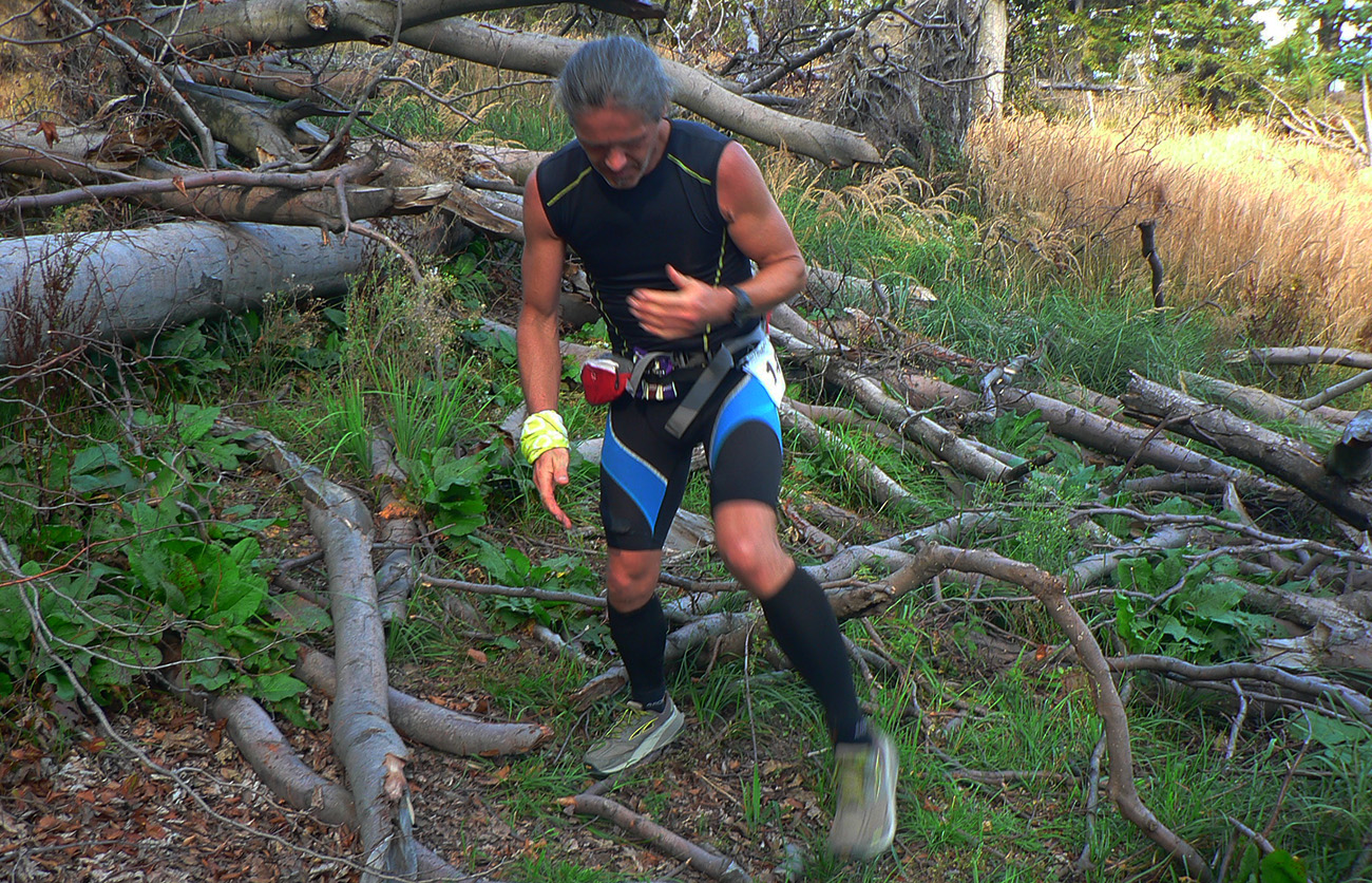 Jedliny: smrdutá mŕtvola sa hádže na zem a keďže sa blíži ku hranici pandémiou skúšaného okresu, musí aplikovať chemické bojové látky. Preto o chvíľu už beží ako zmyslov zbavená a zrazu ju nič nebolí. Posledné dva poriadnejšie kopce čakajú – Gýmeš a všetkými milovaná Žibrica. Medzi nimi ale ešte Remitáž – a tam odkrvený mozog naviguje smerom hore ako furt, tam samozrejme miestni o žiadnej kontrole nevedia, kontrola je dole v kempe. Hlavne, že na asfalte šípky ako svet a fáboriek na mrte. Potom už Žirany - na ne je trochu divný pohľad, lebo na hornom konci čosi horí a dym sa hororovo valí cez dedinu. O pár minút už rozdýchavam jeho pach a aj oči ma prestávajú štípať, ako stúpam na Žibricu - pred siedmou, v lesnom tichu, s nízkym červeným svetlom zapadajúceho slnka, aaach, romantika. Len tým funením a dupaním ju kus kazím.