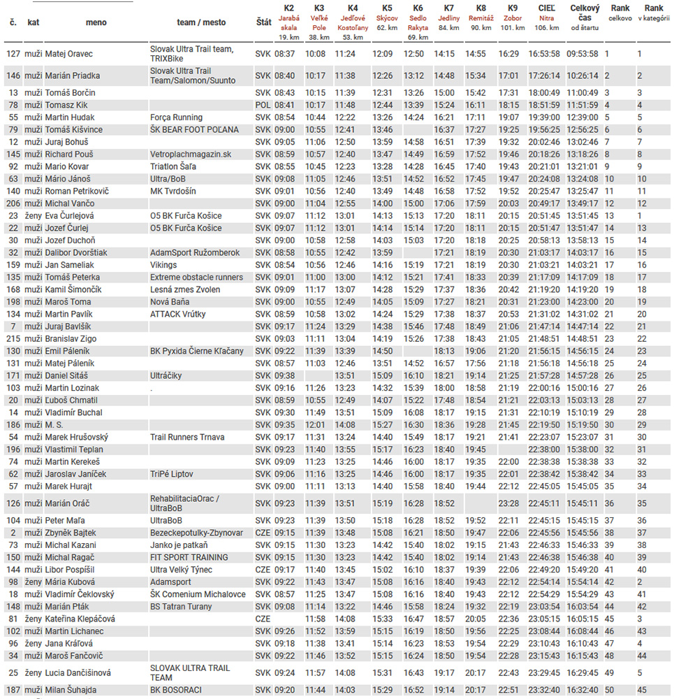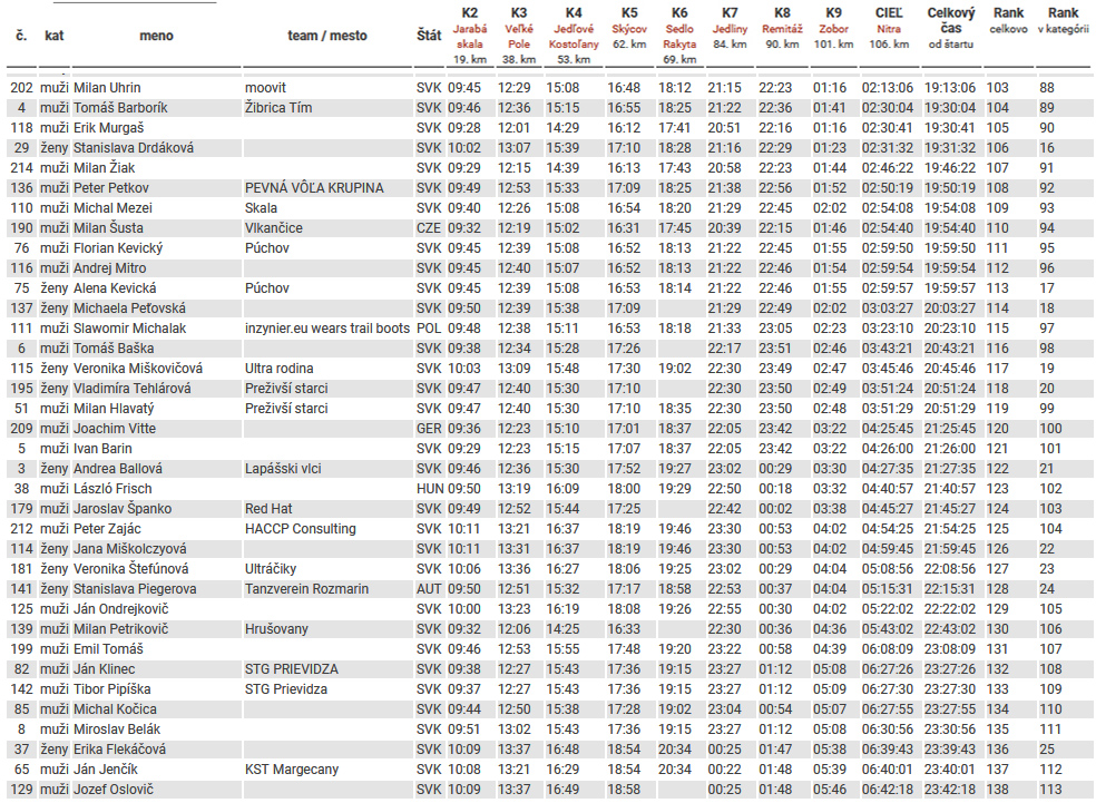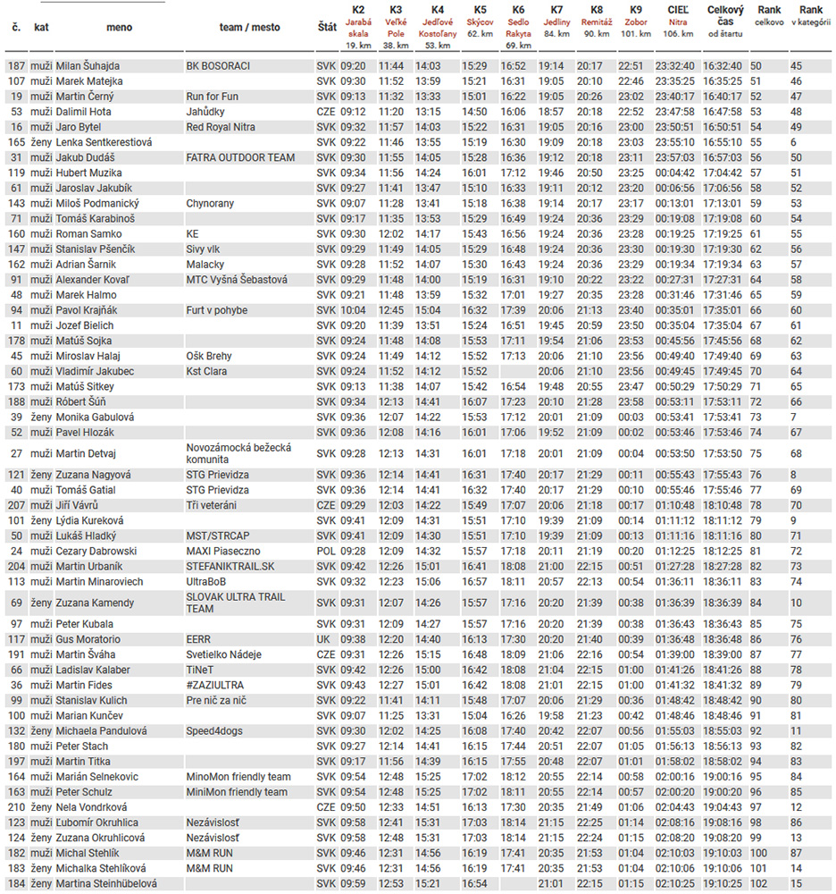 Nakoniec predsa len trochu objektívneho informovania: Matej Oravec zabil taký čas, že viacerí nechápali a v tom teple klobúk dole! 9:54 na 106 km a 3900 m je teda fakt úctyhodný traťový rekord! Majo Priadka na rozbeh po zdravotných problémoch parádne druhý o polhodinku, Tomáš Borčin za ním s podobným odstupom. Prvá Eva Čurlejová tiež poriadne zašprintovala: v cieli na pohľad spokojná ako po výlete za 13:45, celkovo trinásta! Mária Kubová si dala už väčší „odlep“ a tesne za ňou dobehla Kateřina Klepáčová. Ostatní (vrátane nadpäťdesiatnikov) sú nižšie vo výsledkoch prehľadne zoradení, sa mi to tu nechce všetko vypisovať. Ohlasovaná poľská ultrastar Roman Ficek si dačo s chodidlom dorobil, skončil vo Veľkom Poli, podobne ako spolufavorit Tadeáš Vyvíjal. Vďaka počasiu bola „úmrtnosť“ asi dosť vysoká. Veď všetko je tiež vo výsledkoch dole v galérii a TU .