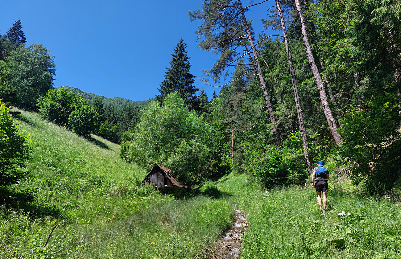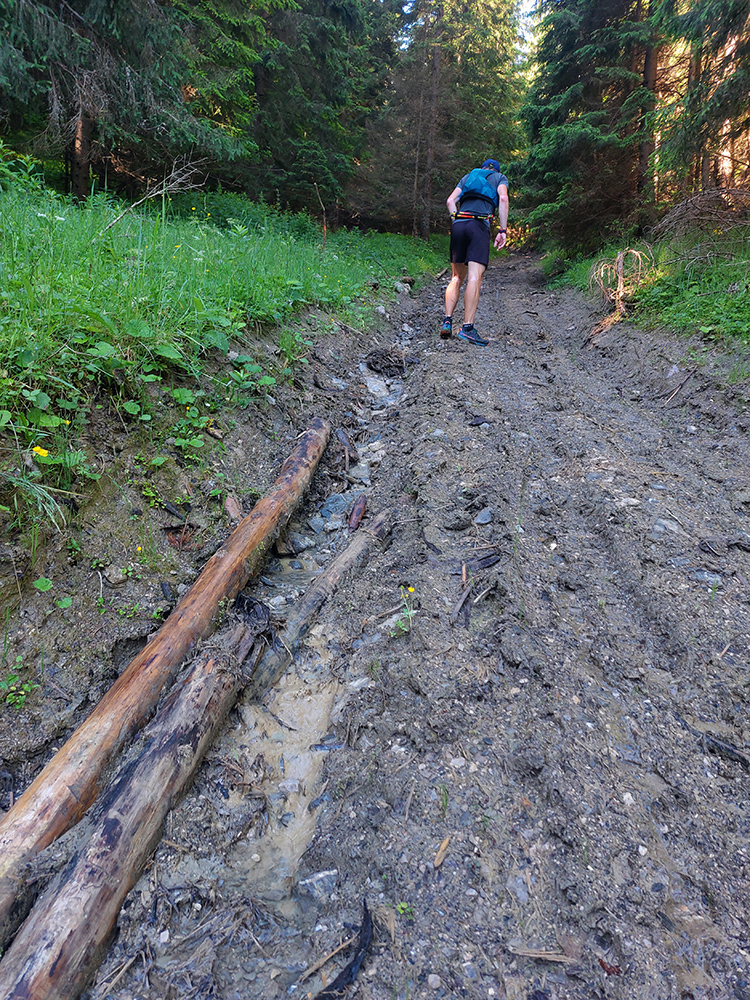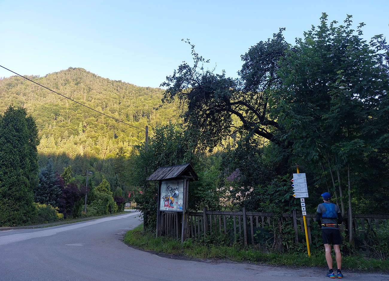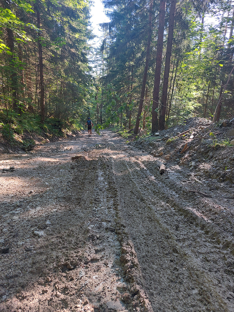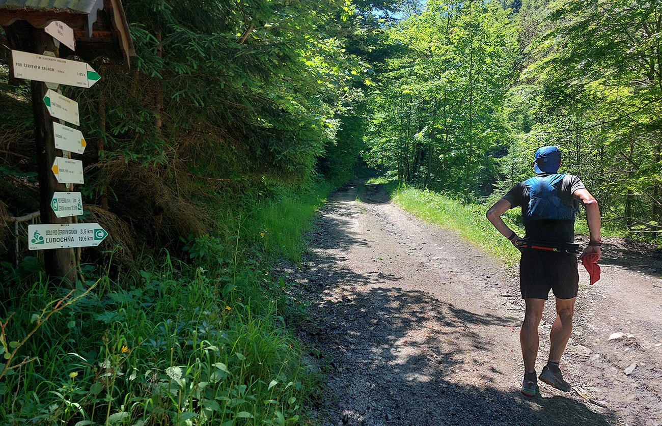 Potom už ale až príliš dlhý a monotónny úsek po šotolinách, po cyklotrase smerom do Ľubochnianskej doliny, až kým sme ju neopustili v Sedle pod Červeným grúňom. Aspoň že tieň, lebo na slnku už dobre pripekalo. Pár studničiek a prameňov padlo vhod. Zhodli sme sa, že obaja nemáme radi takéto dlhé, nemastné – neslané stúpania, ani na beh, ani na chôdzu. Krízu som zahnal gélom a medvede, pred ktorými nás varovali protiidúci cykloturisti, asi fučaním a dupaním.