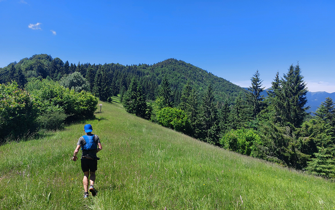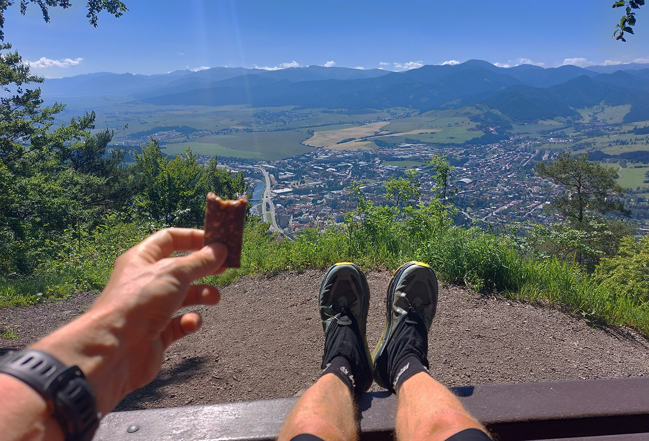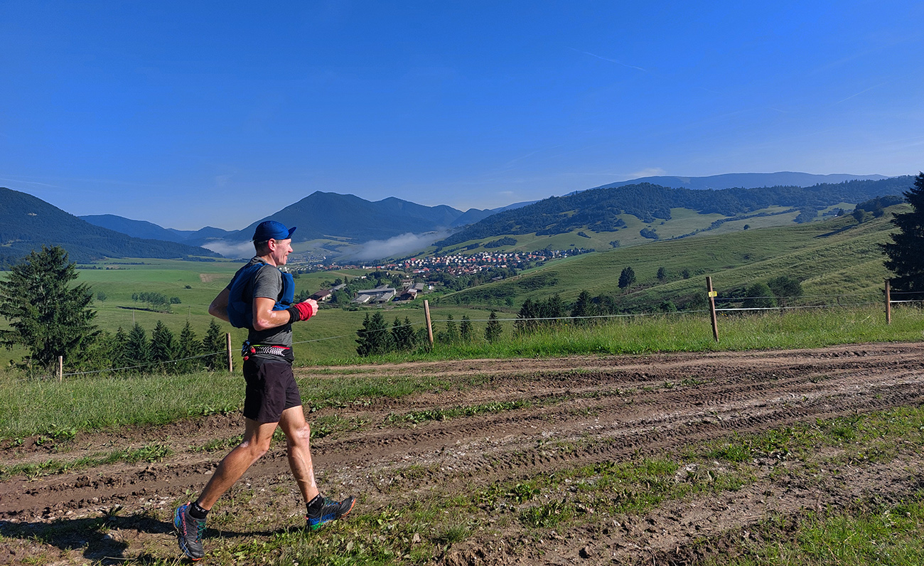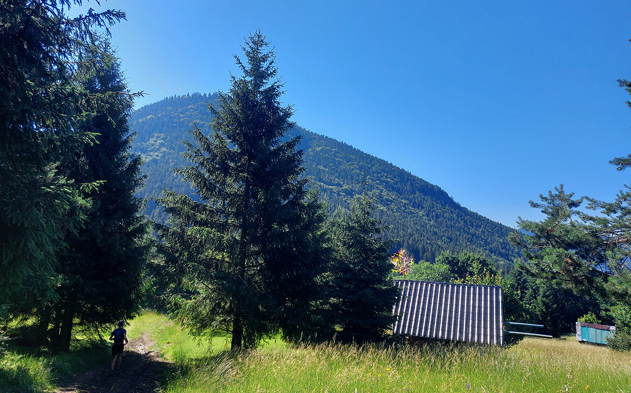 Monotónnosť skončila veľmi pekným úsekom cez Poľanu pod Kútnikov kopec – zase lúky, senníky a výhľady na prvú časť našej trasy na náprotivnom brehu Váhu. Aj keď jeden kus si to zase prestával užívať, ako účinok gélu rýchlo vyprchával a nohy sa začínali motať. Ale nebolo to už ďaleko, a už len dole.
