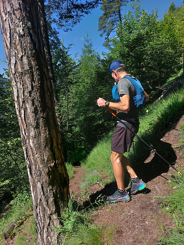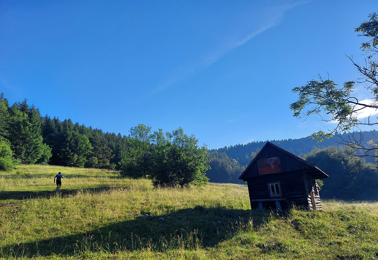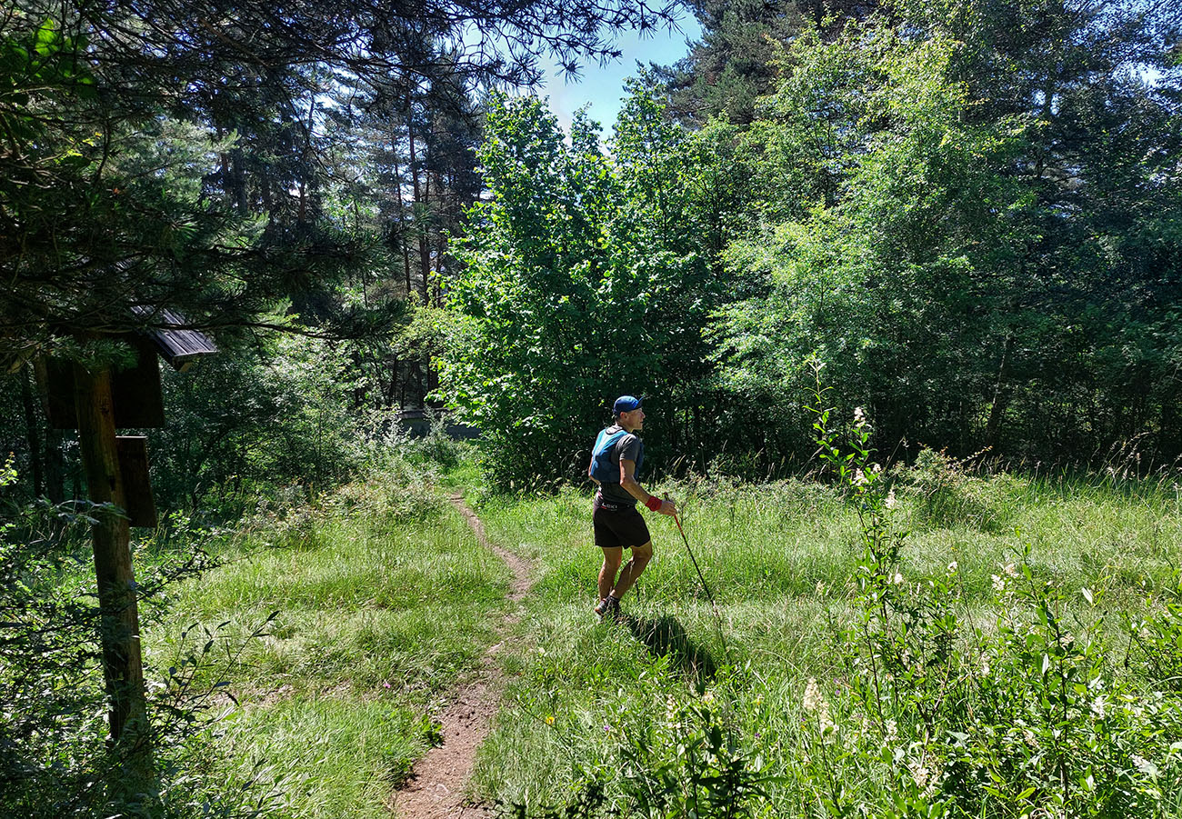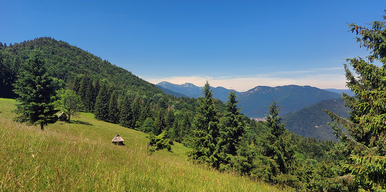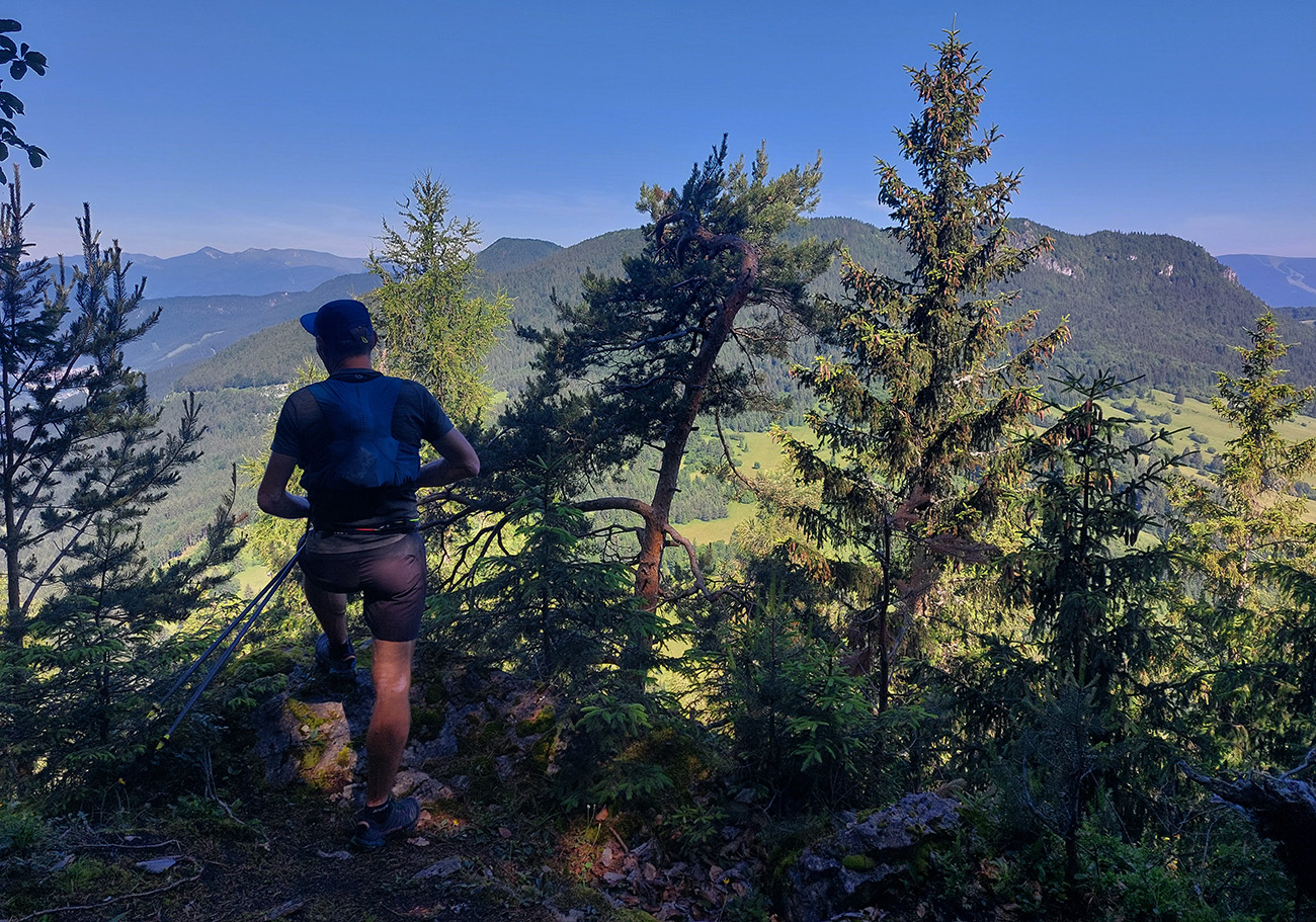 Monotónnosť skončila veľmi pekným úsekom cez Poľanu pod Kútnikov kopec – zase lúky, senníky a výhľady na prvú časť našej trasy na náprotivnom brehu Váhu. Aj keď jeden kus si to zase prestával užívať, ako účinok gélu rýchlo vyprchával a nohy sa začínali motať. Ale nebolo to už ďaleko, a už len dole.