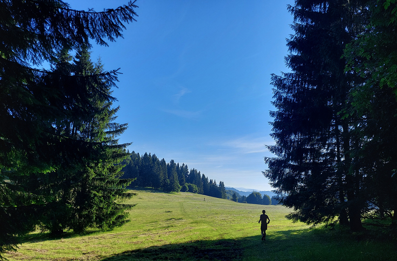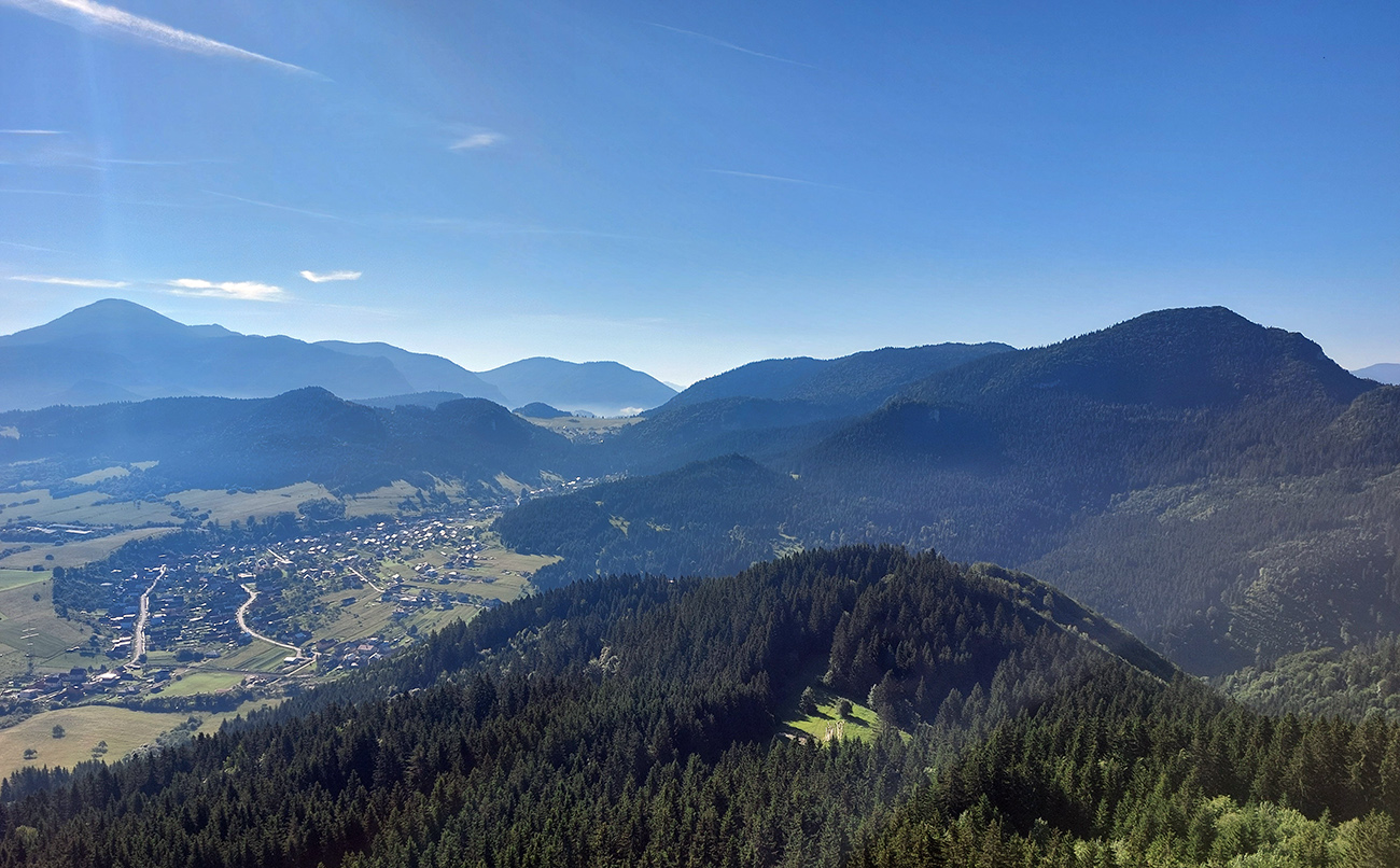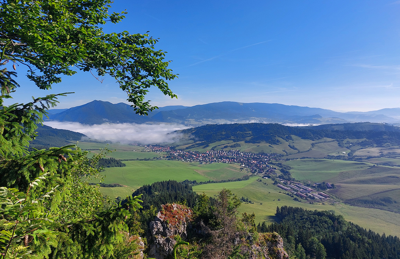V sedle vpravo vbok a väčšinou pohodlné, mierne stúpanie lesmi a lúkami na Hrdoš. Tipovali sme, či nevyplašíme takto zrána nejaké pasúce sa kusy, ale ani kopyto. Len kliešte boli prítulné (ja doma päť, Majo nenahlásil). Aj cesta bola prítulná, objala ma svojím mäkkým, mľaskavým objatím (veď ako po daždi). Čo už, keď som nerozbehaný a nedvíham nohy. Vyhliadky z Hrdoša zato prudko panoramatické, aj keď smerom na východ ešte trochu proti slnku. Ale ukázali sme si odtiaľ plánovaný obchvat Komjatnej, zbehli poobzerať skalné divy pod vrcholovým bralom, a o chvíľu už sme dupali lúčne cesty ponad dedinu, smer cintorín.