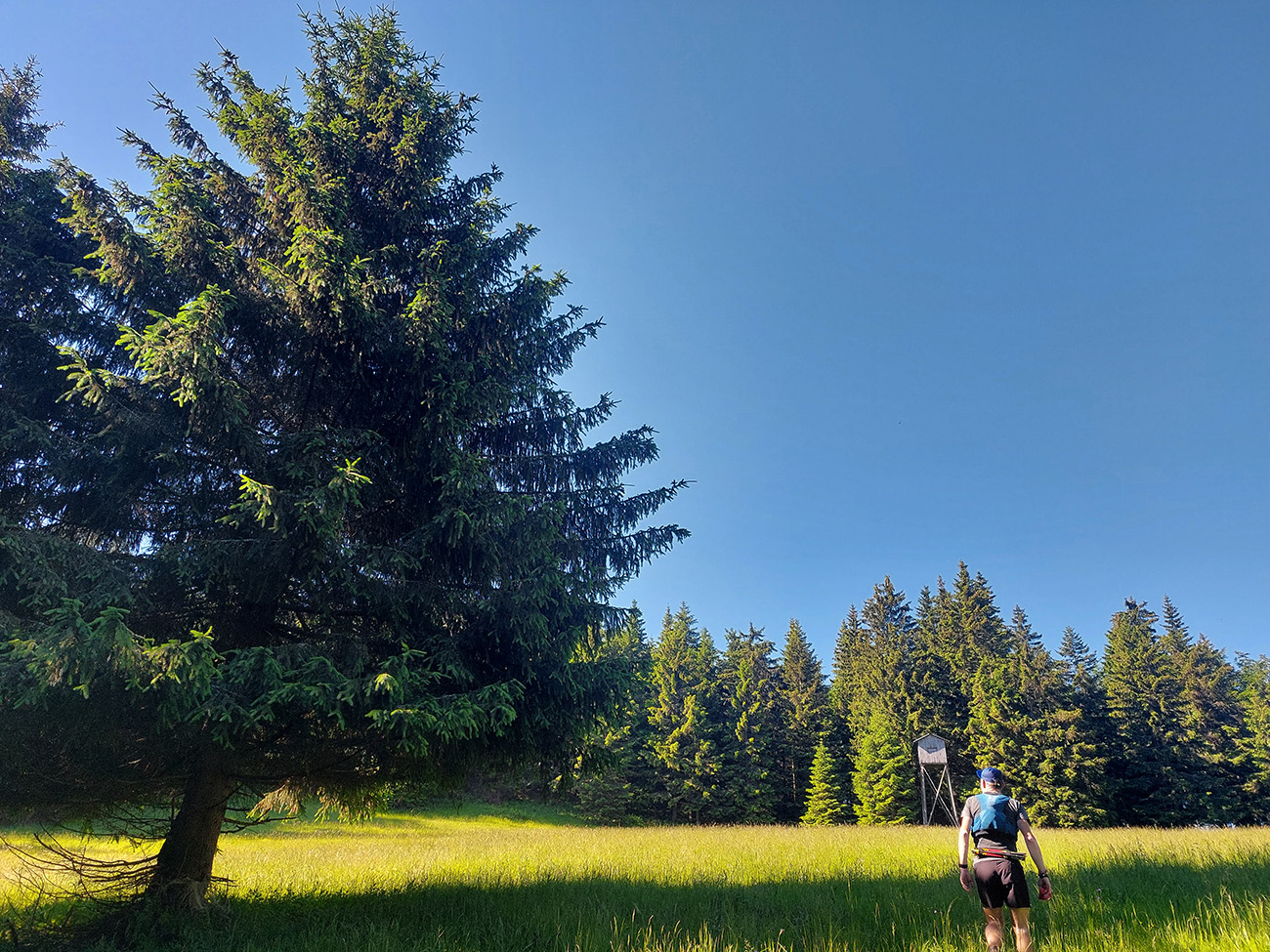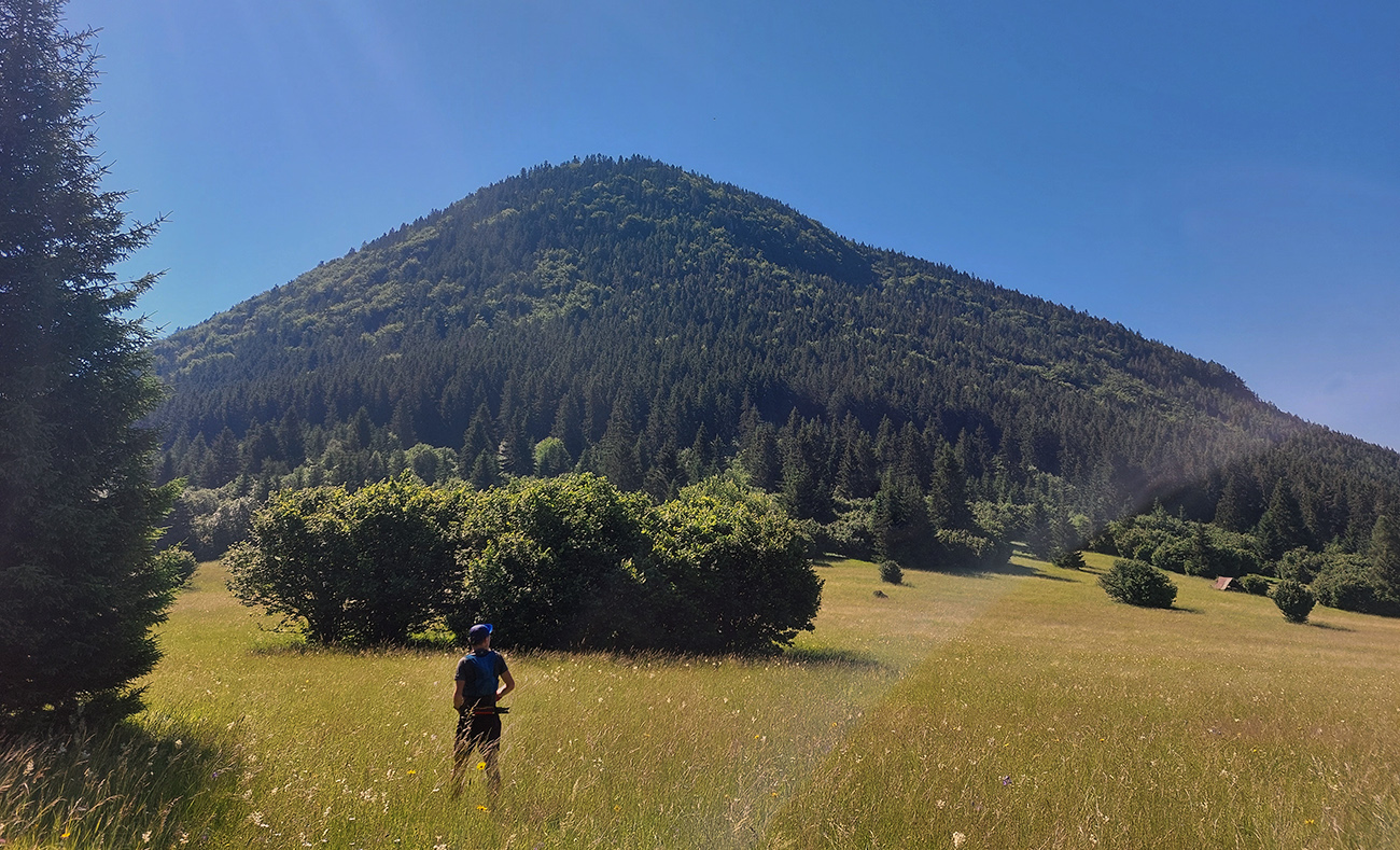 Onedlho už sme brzdili pri ohnisku pod Radičinou, a že teda dáme zachádzočku kratučkú na vrchol. Ale tam nulový výhľad – drevené mólo rozpadnuté a stromy už podrástli, odkedy som tam bol naposledy, tak nazad. Prudká strata výškových metrov a už sa vpredu otvárali Dubovské lúky, posiate senníkmi a ohradené stenou Čebraťa: