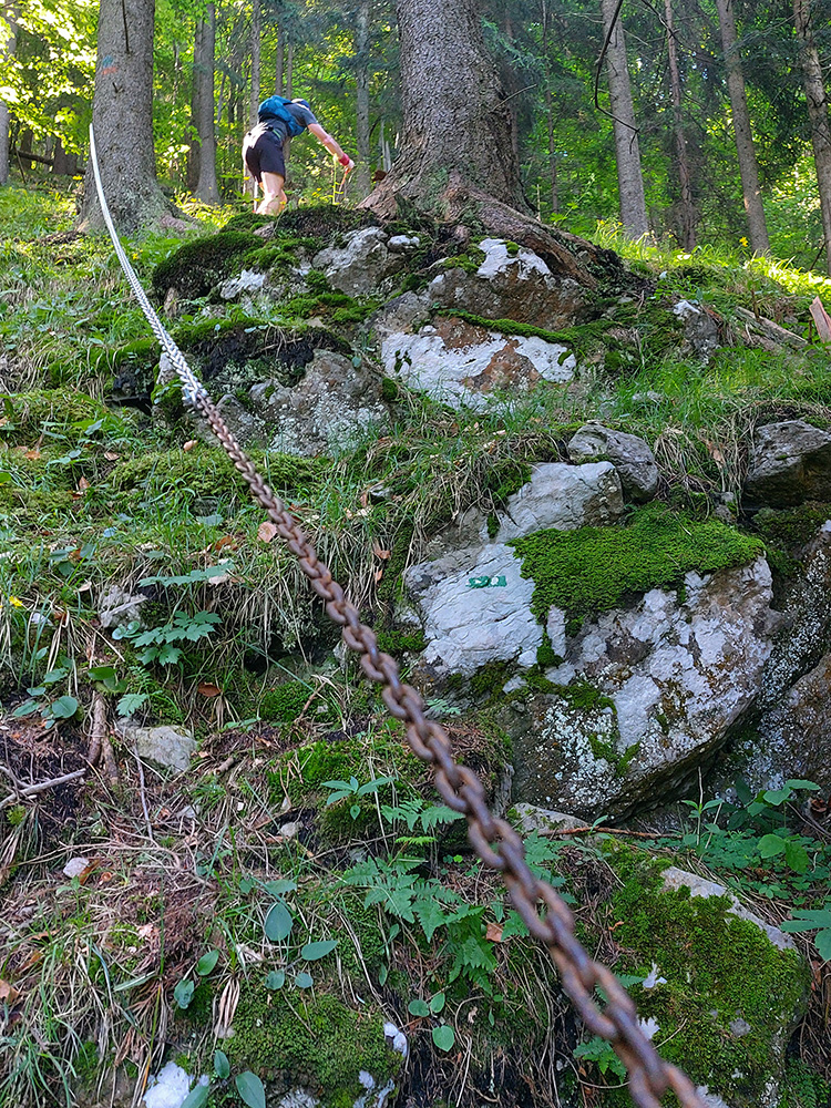 Zase sme dáke kliešte pootriasali, vychutnali výhľad na Choč vľavo a na Veľkú Fatru vpravo, našli cestu do lesa a od vrtu do diaľničného tunela sme začali hľadať chodník na vrchol. Našli sme a keď Majo vytiahol palice, vedel som, že je zle – alebo teda superstrmo. Pekne po štyroch miestami sa išlo. Vyššie na predýchanie pekná vyhliadková skalka a potom zmierňujúce serpentínky, a boli sme na vrchole. Už som sa začínal cítiť trochu stuhnuto, ako ten, ktorého sme tam našli sedieť: