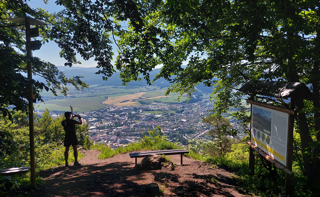 Chodník po temene k výhľadu na RK je ale príjemný, ponad vrcholové prepadlisko, jeho skalné steny, sutiny a machom obrastenú divočinu celkovo. Onedlho už sme vychutnávali desiatovú pauzu s výhľadom na RK city, Nízke Tatry v protisvetle, aj hlásenia staničného rozhlasu.