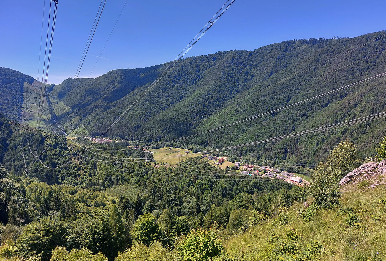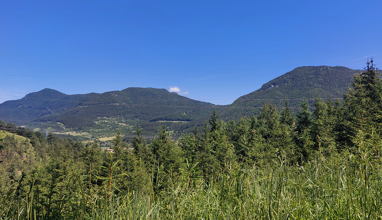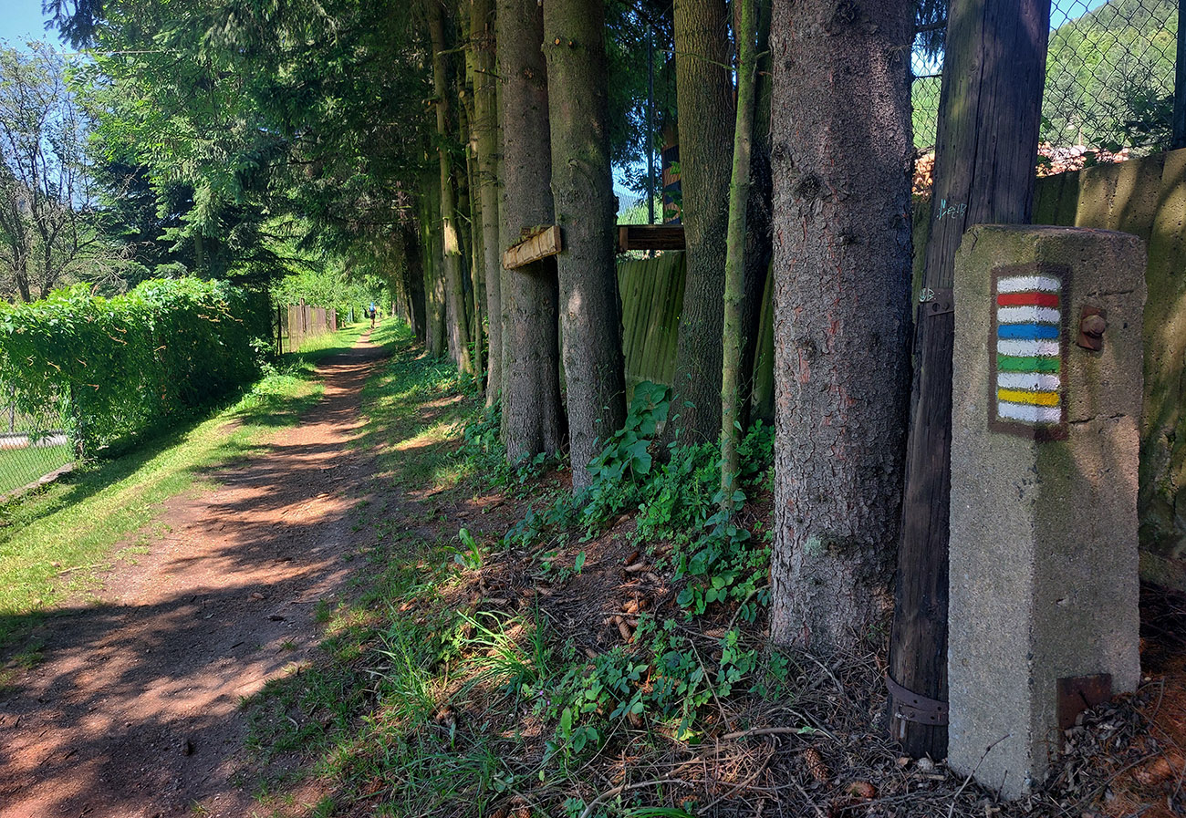 Dole do mesta je to nie ďaleko, ale hlboko. Popretláčali sme sa na úzkych serpentínach s pár turistami v protismere, obišli „jubilejný háj“ na lúke a po zelenej a neskôr po neznačenom chodníku sme podtraverzovali kopec smerom do Rybárpoľa. Cieľom bolo čo najviac skrátiť pobyt na asfalte, tak po preventívnom dotankovaní na pumpe sme to šmykli hneď na východnom okraji sídliska Kľačno do doliny. Na cyklotrasu smer Čutkovská dolina sme trafili bez pochýb.
