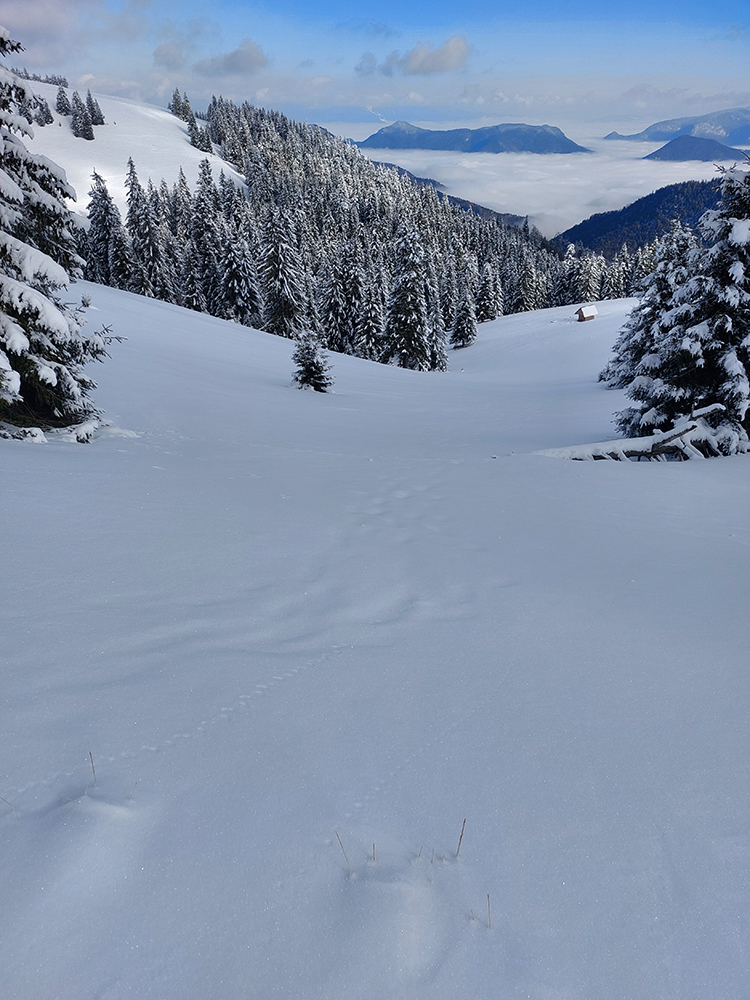 Pozornejší pohľad do jamy pod Nižným Šiprúnskym sedlom ma usvedčil v tom, že práve tade chcem obísť tie spomínané nepríjemné miesta na cyklotrase (pri zostupe spod Šiprúňa pod Vtáčnik). A oplatilo sa a ešte aj potešilo! Lyžovačka lepšia ako vtedy v januári, lebo na ľadovom základe naprášených takých odhadom 10 cm ľahučkého, premrznutého prášku. Tentokrát som nechal aj ostatným, choďte tam!